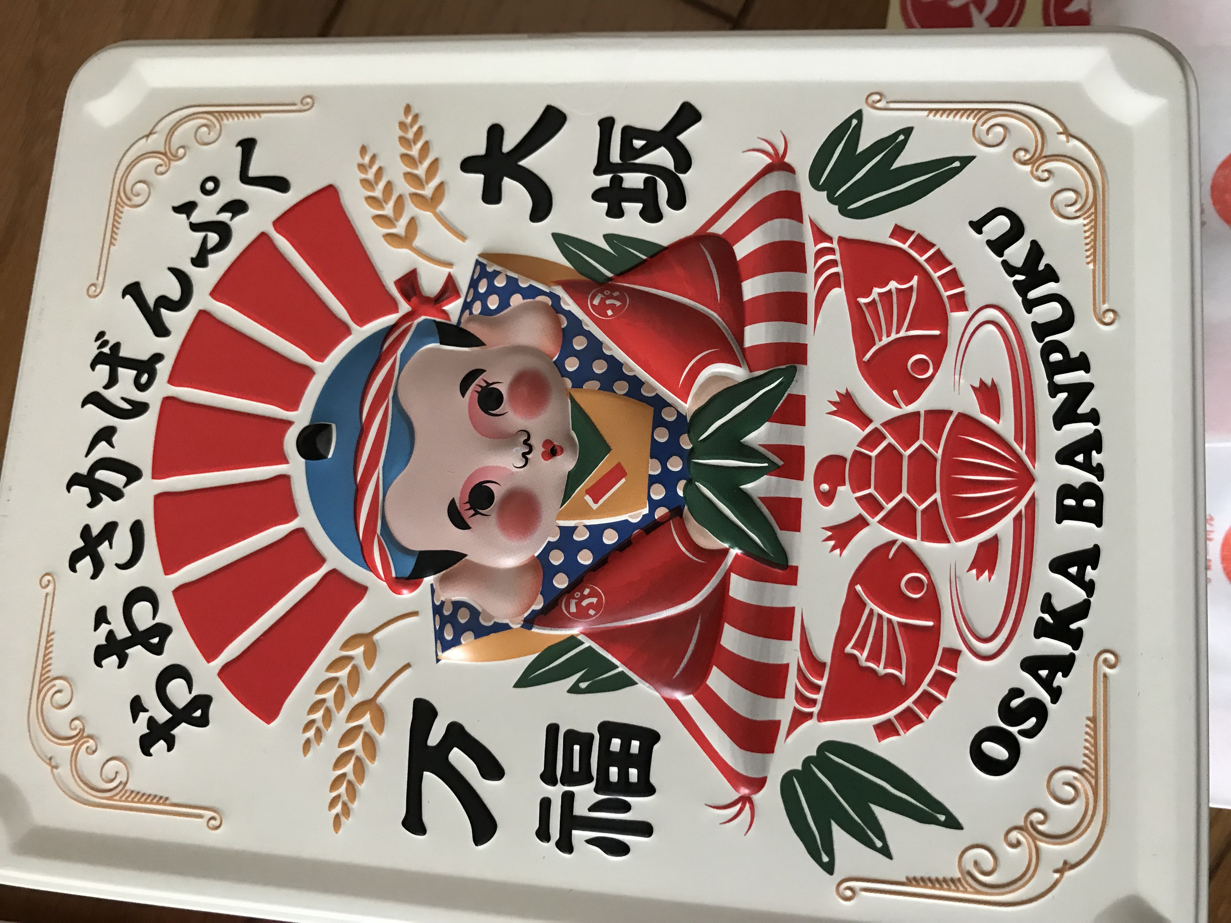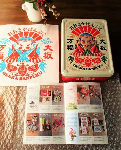 このたび幸せを呼ぶ福助のルーツ大阪から万(よろず)の福と笑顔を届けたと願い、このお菓子を福助をモチーフにした缶に詰めました。見るからにおめでたい缶は贈り物にもおすすめです。