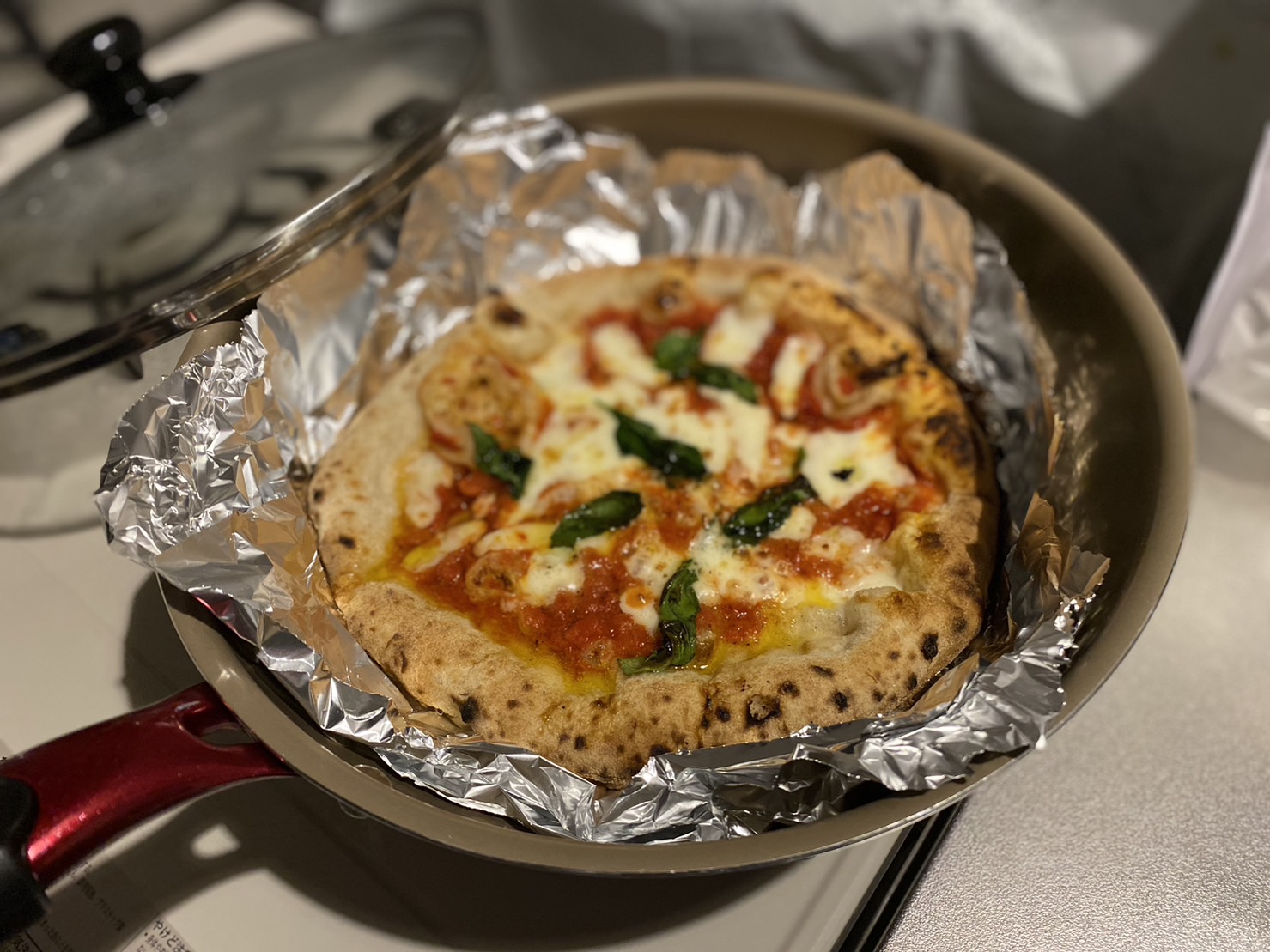 フライパンにアルミホイルを2枚しき、ピザをのせて軽くアルミで包み、弱火で8分じっくり焼いていきます。
