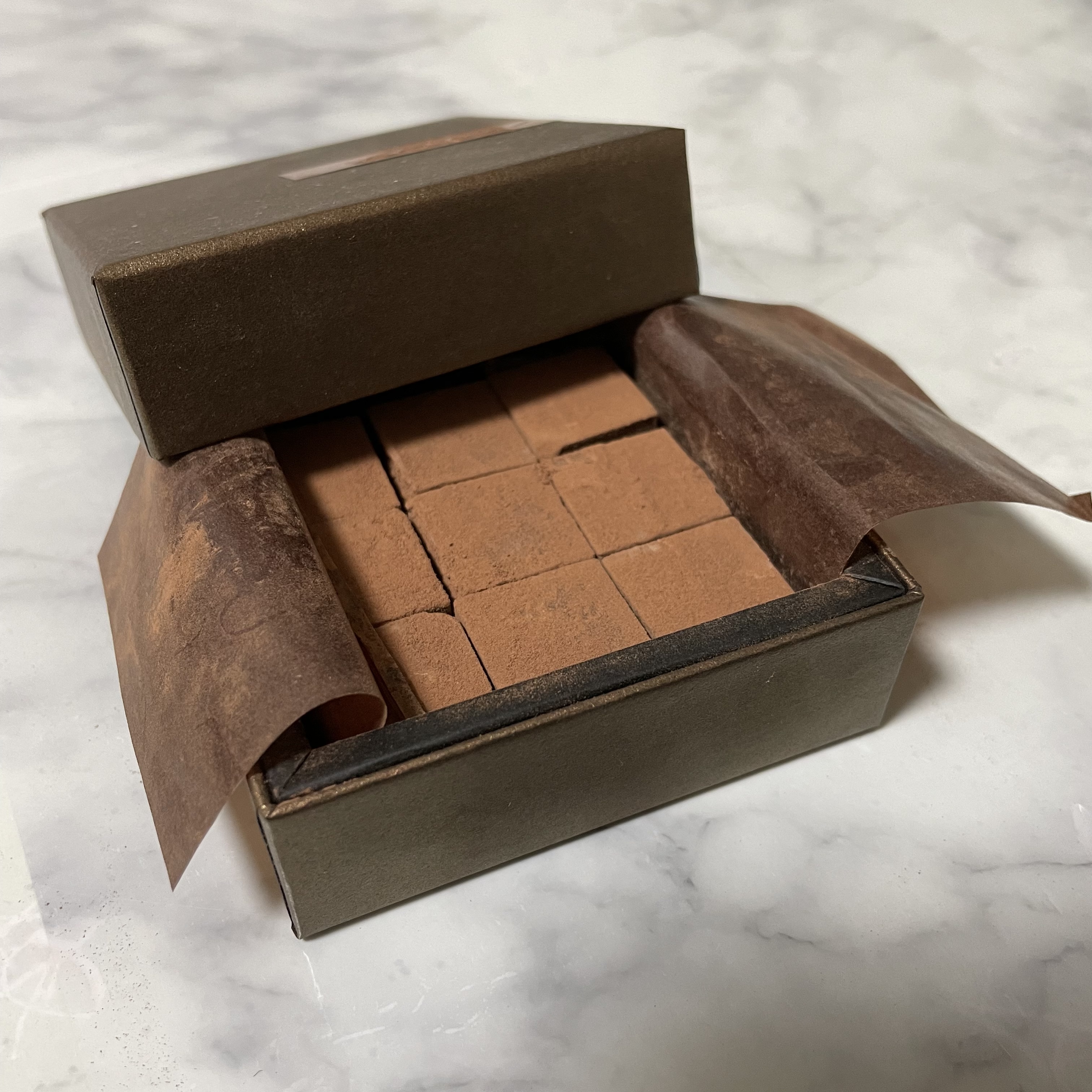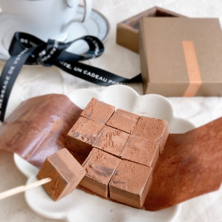 フランス産の有機フェアトレードチョコレートとスイス産のフェアトレード有機ミルクチョコを2層にした「生チョコ」です。一般的な生チョコの製法と比べ、低温で時間をかけてパティシェが手作りしているため、ミルクチョコの風味が生きています。2層のチョコレートの融点がそれぞれ違うので、食感や口どけもそれぞれのチョコレートの異なる味わいを楽しめます。上品なチョコレートをイメージするパッケージに入って届くので、バレンタインなどのプチギフトにもおすすめです。