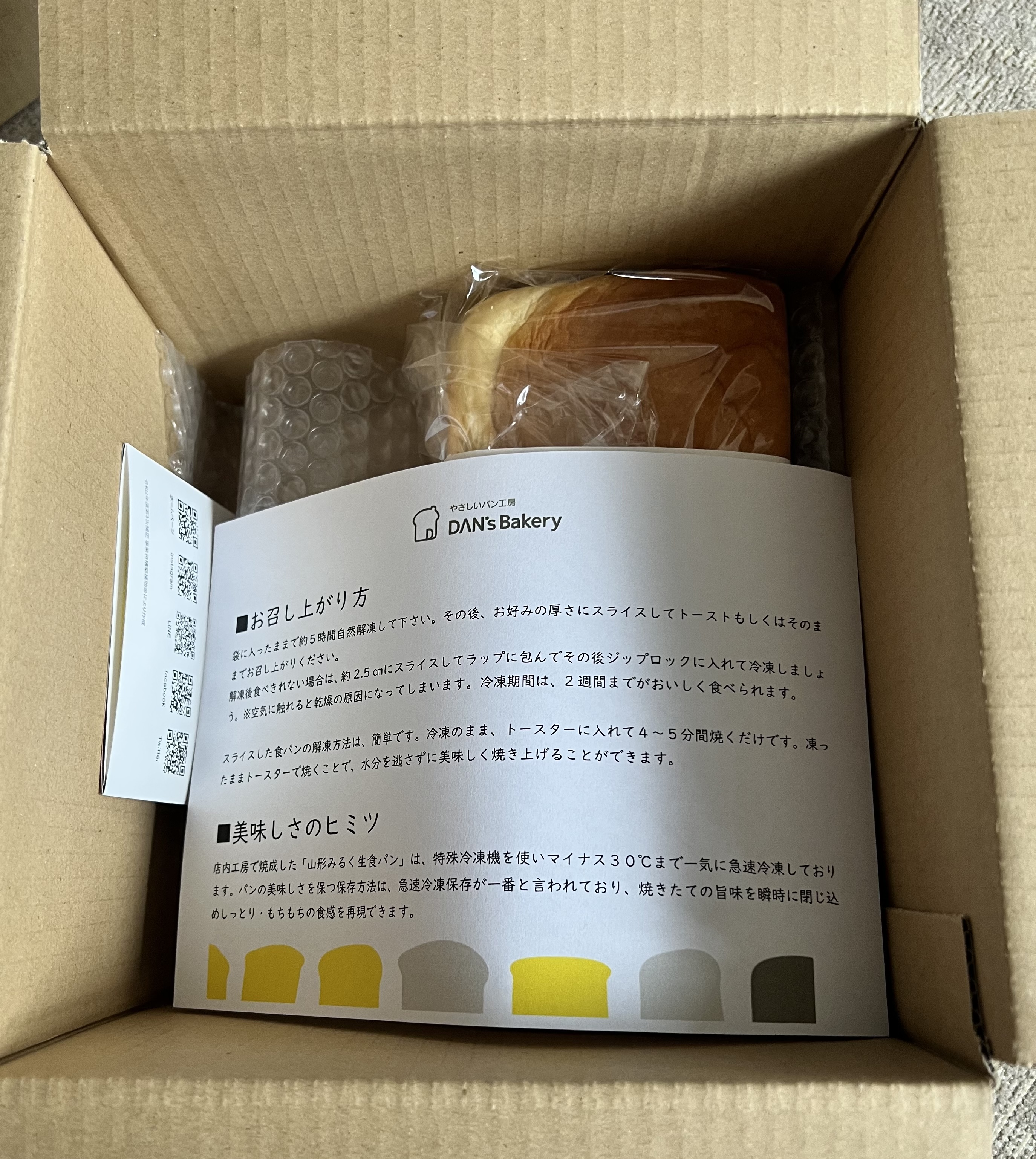 パンの生地には水を一切加えず山形県産牛乳を100%使った、みるく感たっぷりの「生食パン」です。素材にもこだわり、国内産とカナダ産のオリジナルブレンド小麦、瞬間加熱の純粋蜂蜜、北海道産の生クリーム、北海道産無塩バター、北海道産加糖練乳を使用。しっとり、もちもち食感で芳醇な甘い香りが特長です。冷凍で届くので、1.5斤としっかり味わえるサイズでありながら、賞味期限は14日間ありゆっくり楽しめます。