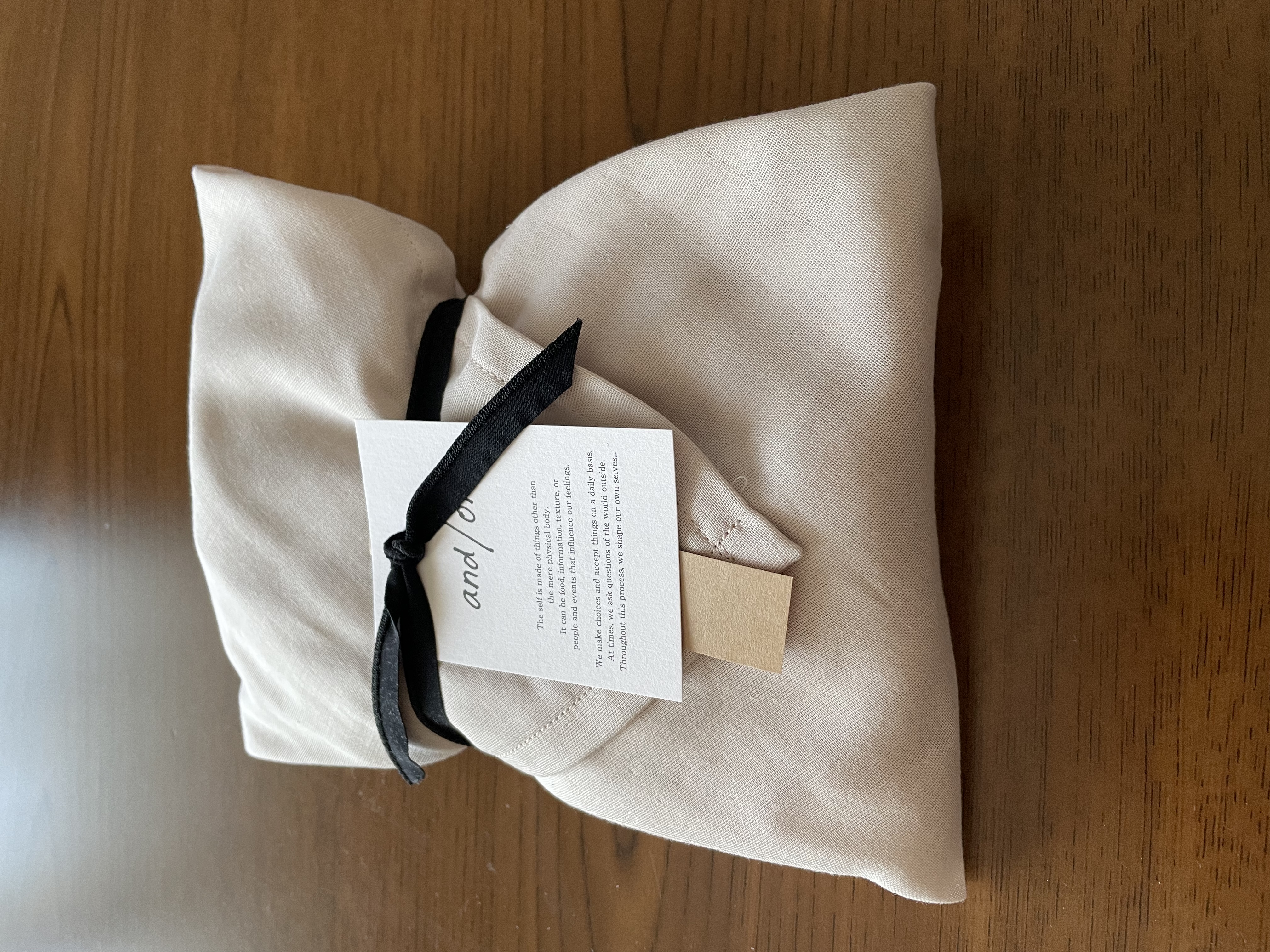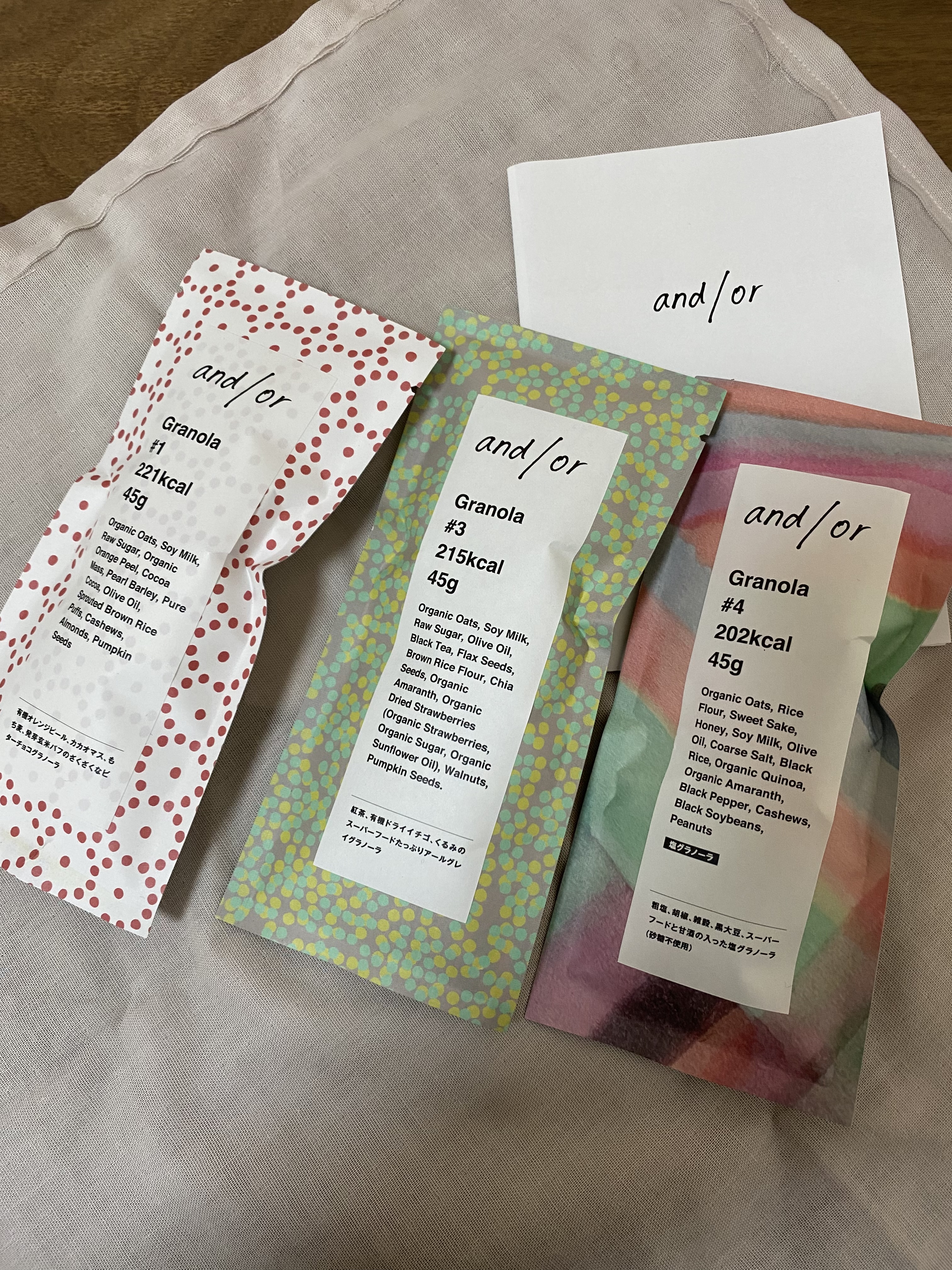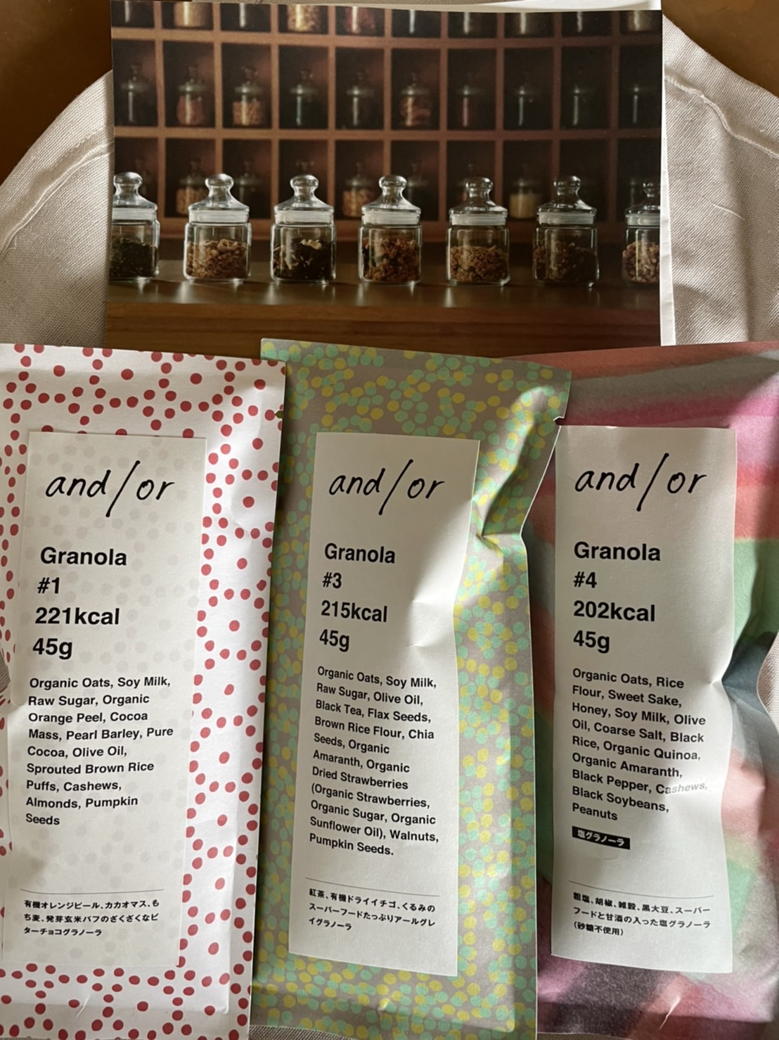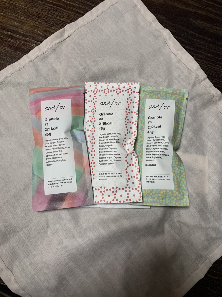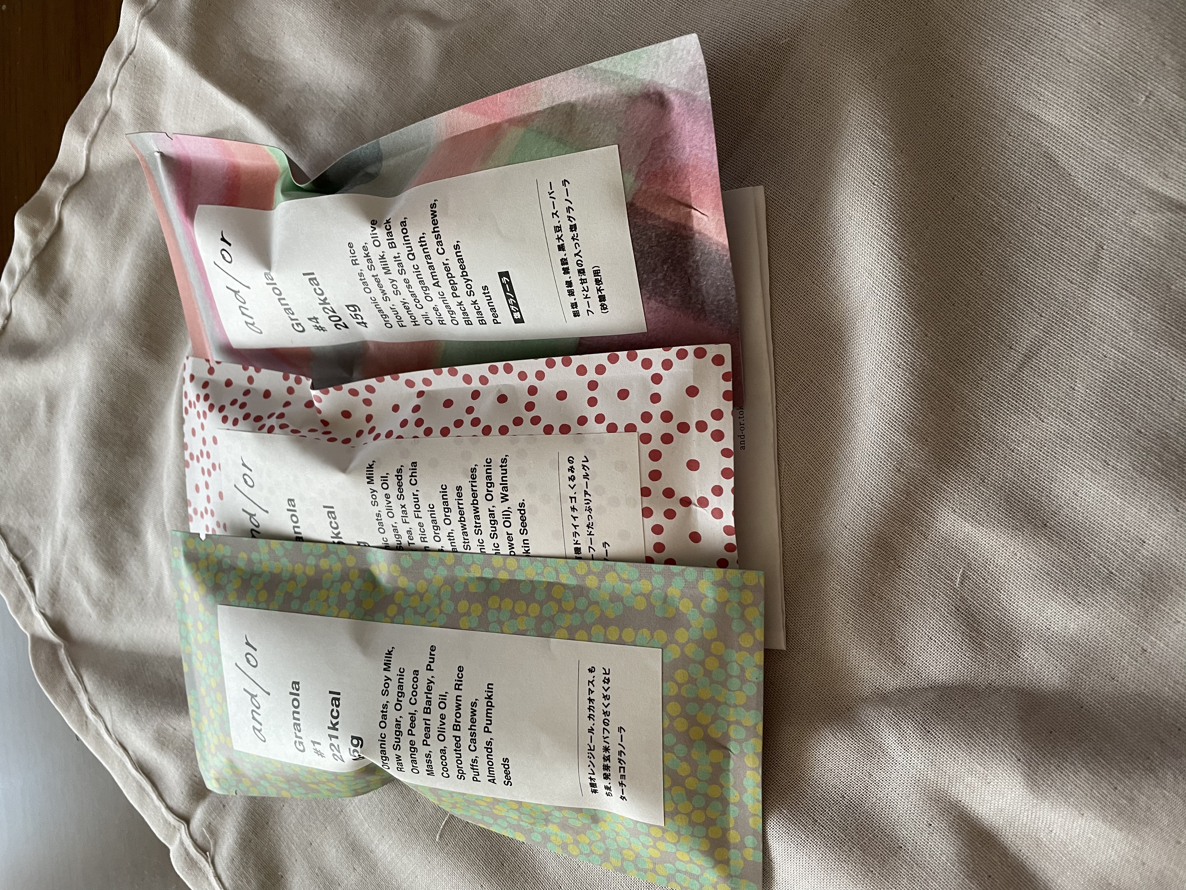 黒いゴムを外し布を開けると、3種類の細長い袋入りのグラノーラがかわいく並んでいます。