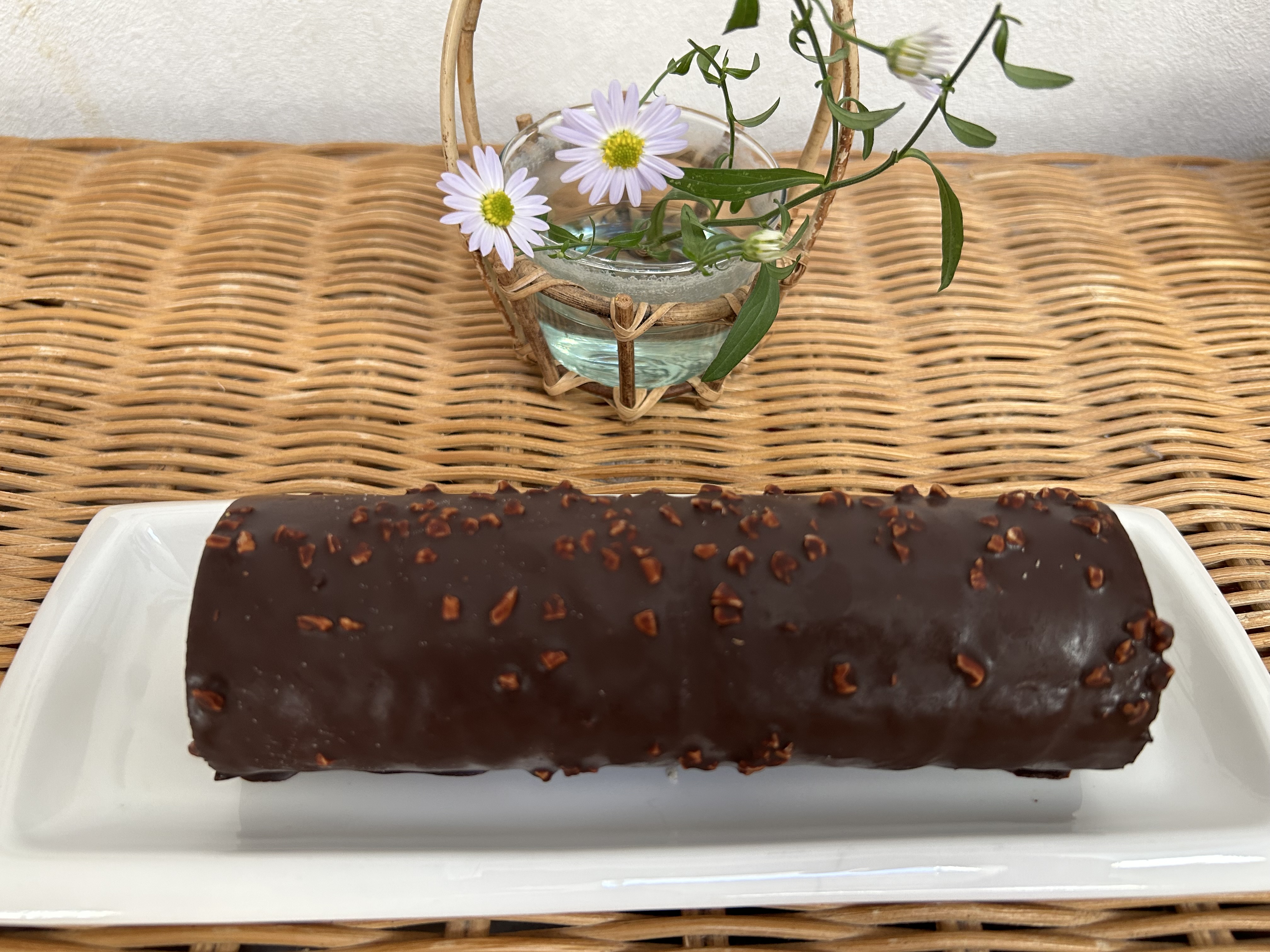チョコレート専門店が作った「ロールケーキ」です。ふわっふわなココア香るシフォン生地と、バニラ風味の生チョコが層になっています。食感の異なるケーキをチョコレートコーティングし、ザクザク食感のアーモンドをトッピングし、アクセントを加えています。くるっと巻いてある断面もかわいらしいスイーツです。。花のイラストが印象的なブルーのボックスに入って届くので、バレンタインなどのギフトとしてもおすすめです。