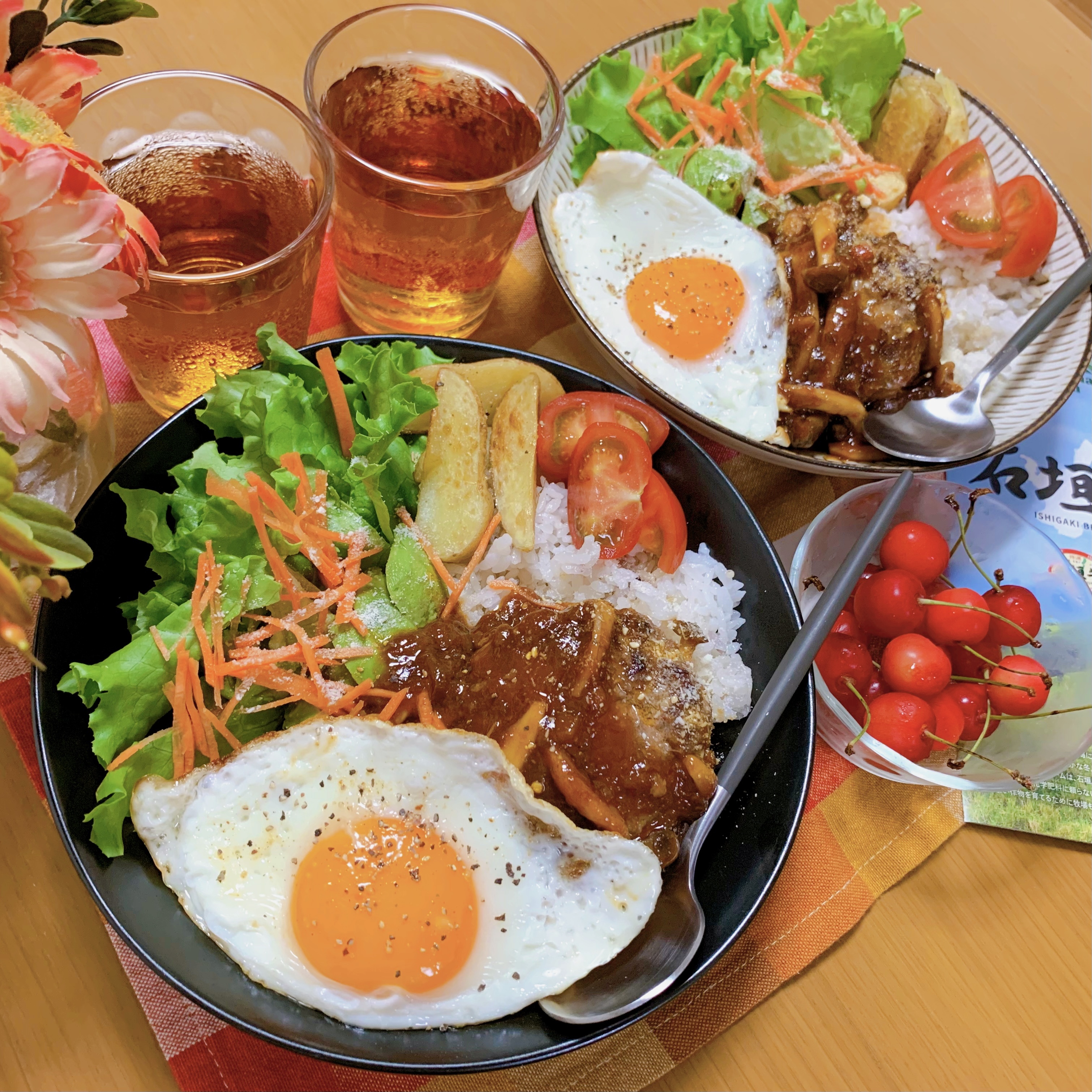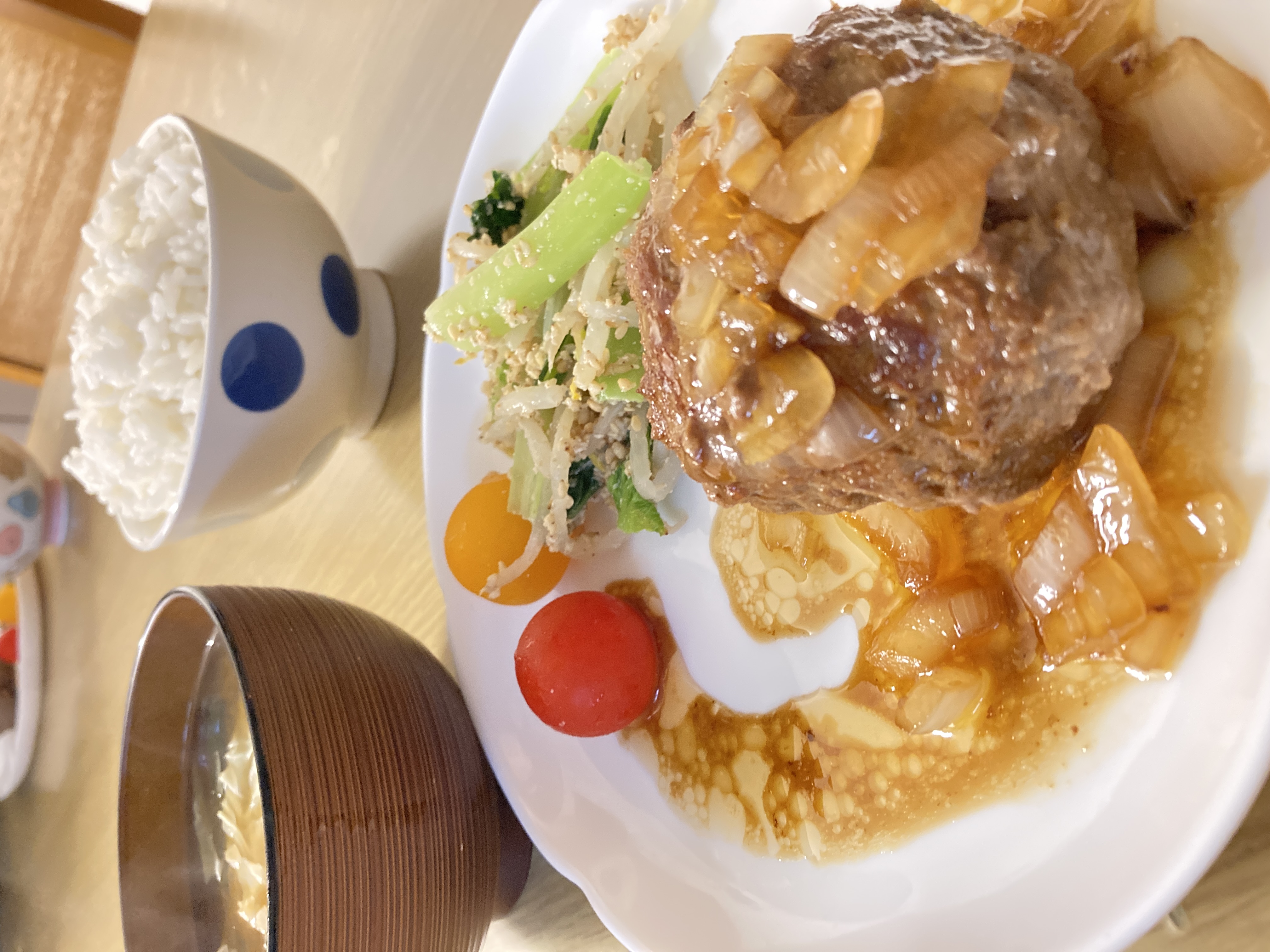 ハンバーグをお皿にうつしたら、先程のフライパンに炒めた玉ねぎ、ソースを加え軽く煮詰めハンバーグに添えました。