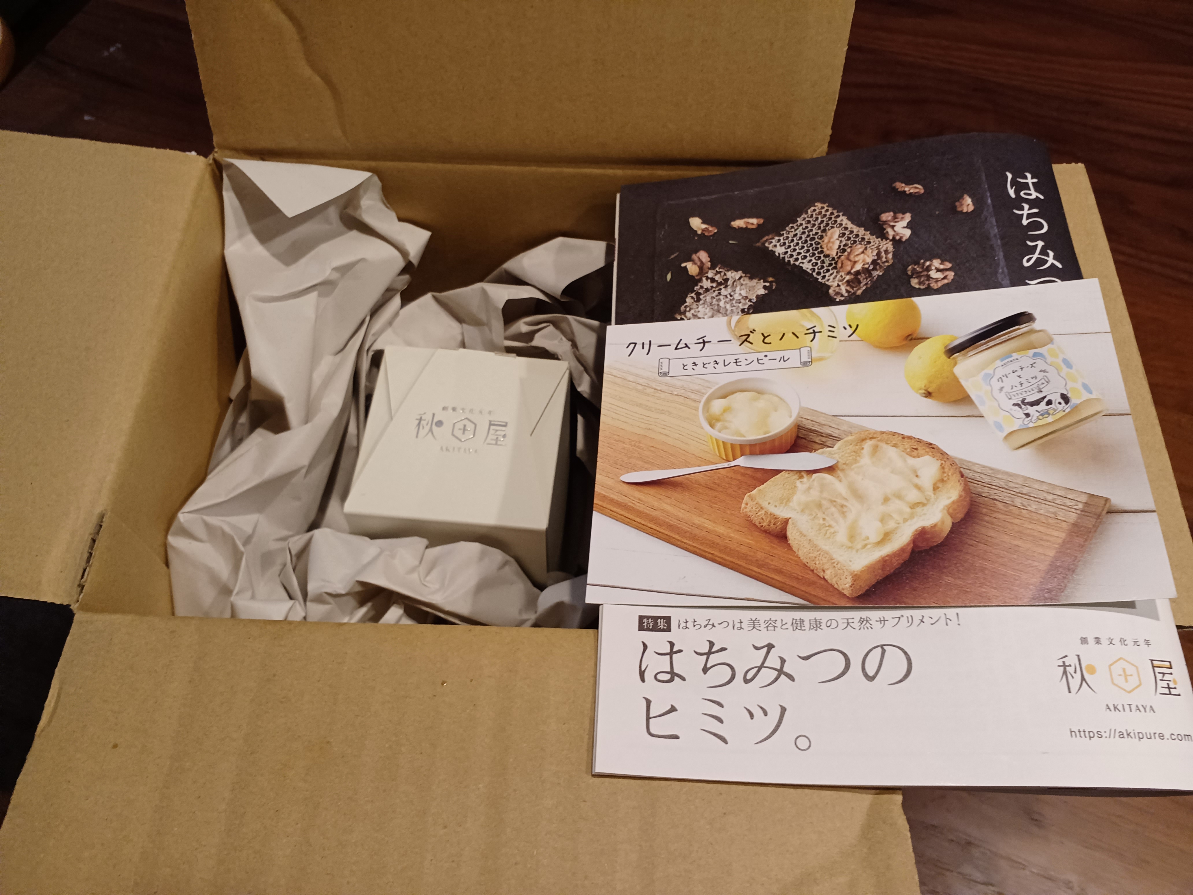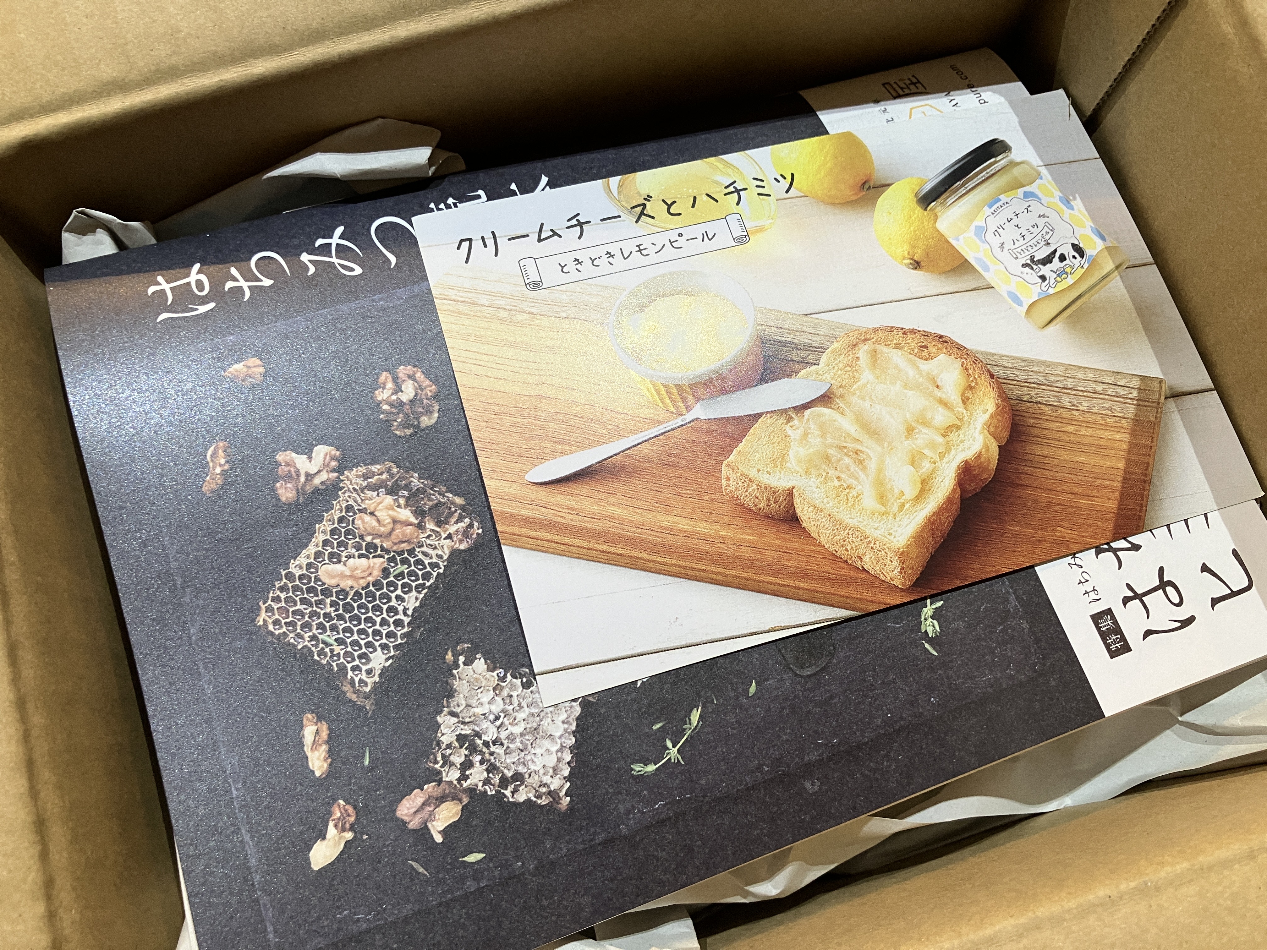 箱を開けると商品の梱包の上の方にはちみつ読本」と「レシピカード」が入っていました。