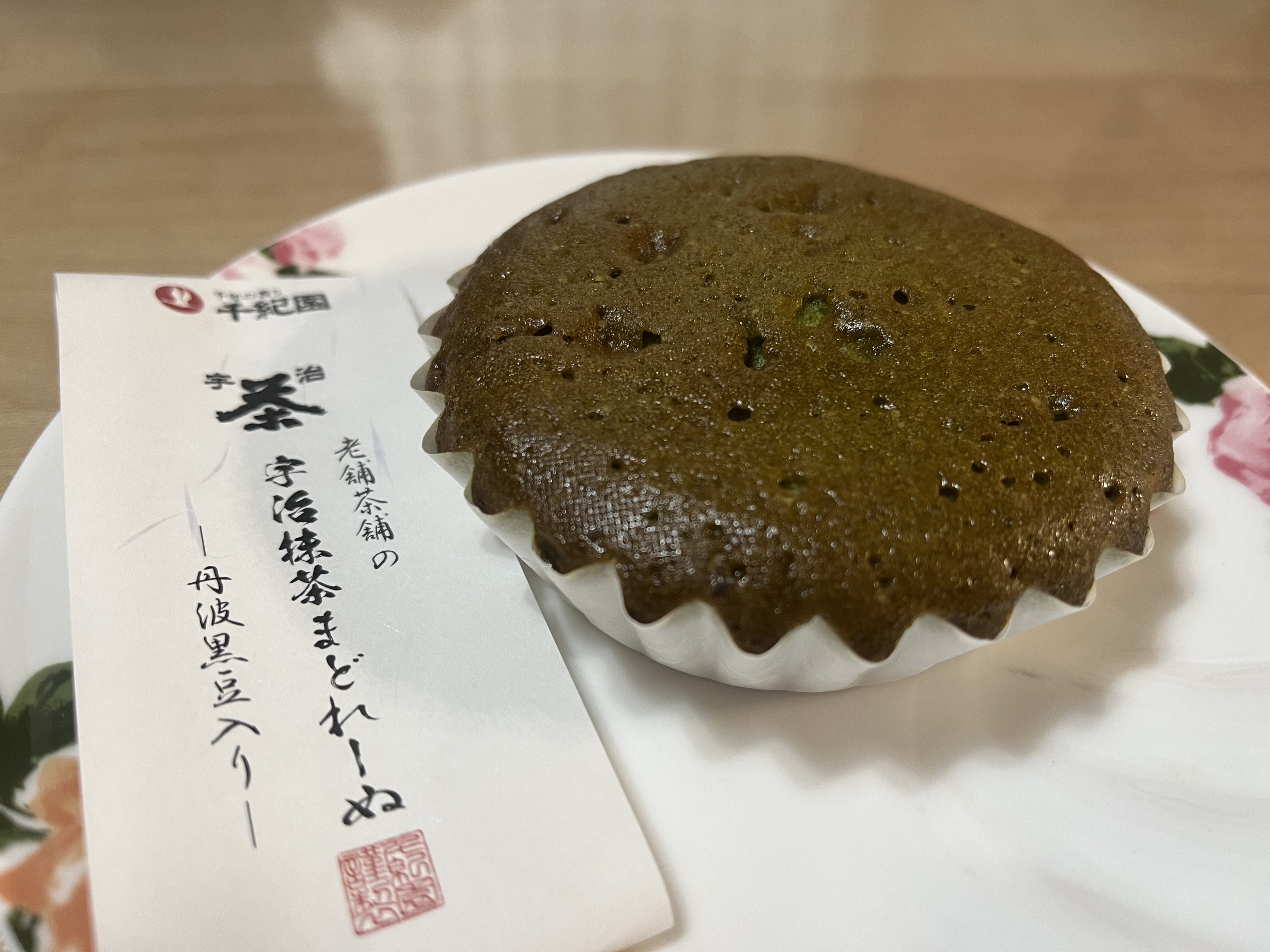 「宇治抹茶まどれーぬ」はパウンドケーキほど重厚感はないものの、サイズが大きめでさらに出しただけで歓声を上げてしまいそうな外観です。しっとり感とふんわり感が程よく同居する生地は焼き菓子特有のクセになる甘さで、底までフォークを入れると丹波黒豆に辿り着きました。生地に溶け込んだ抹茶の香りと甘い丹波黒豆の相性は抜群で、なんでもない日に食べていてもお祝いをしてもらっているような気分になります。サイズも味も満足感は抜群で、もはや焼き菓子ではなく「ケーキ」だと思いました。