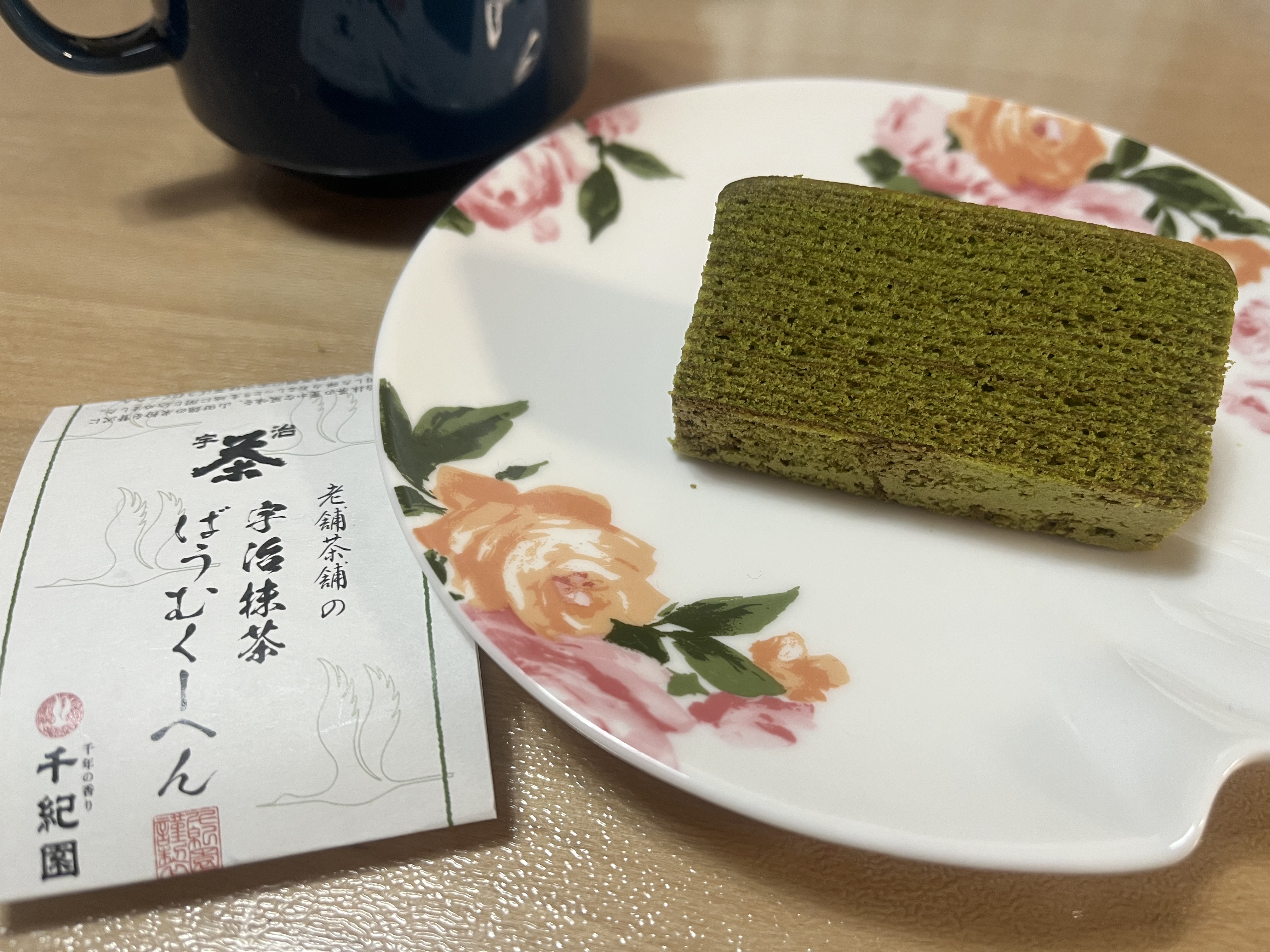 「宇治抹茶ばうむくーへん カット」は手のひらよりやや大きめで、ホールのバウムクーヘンをカットした細長い形状になっています。抹茶の緑とこんがり茶色に焼けた生地が層になっており、フォークで切るとシュワっという柔らかい手応えがあります。袋を開けるとふわりと抹茶の香りが漂いますが、口に入れると抹茶の主張はそれほど強くなく、バウムクーヘンのメイン食材である卵の香りも感じられました。抹茶は後味で少し香り、層の口溶けも良いので一層一層丁寧に作られたお菓子なのだと思いました。
