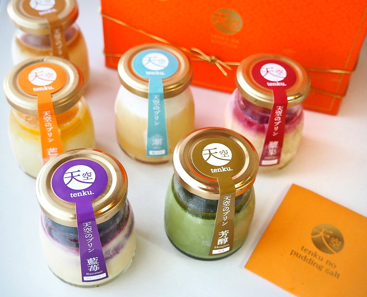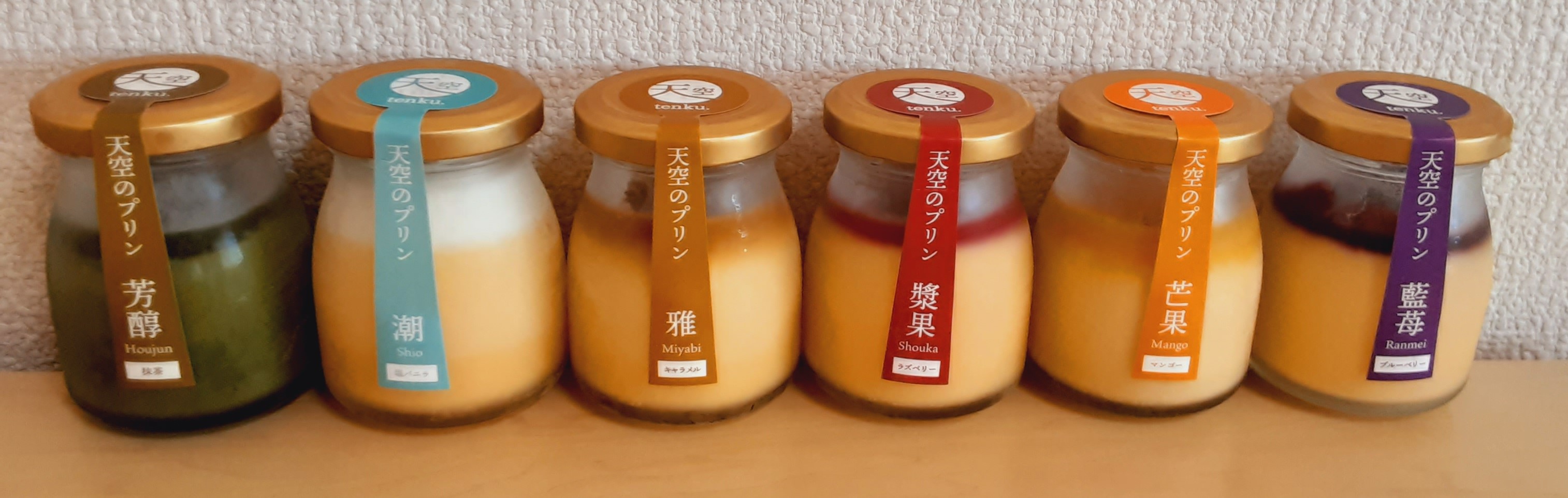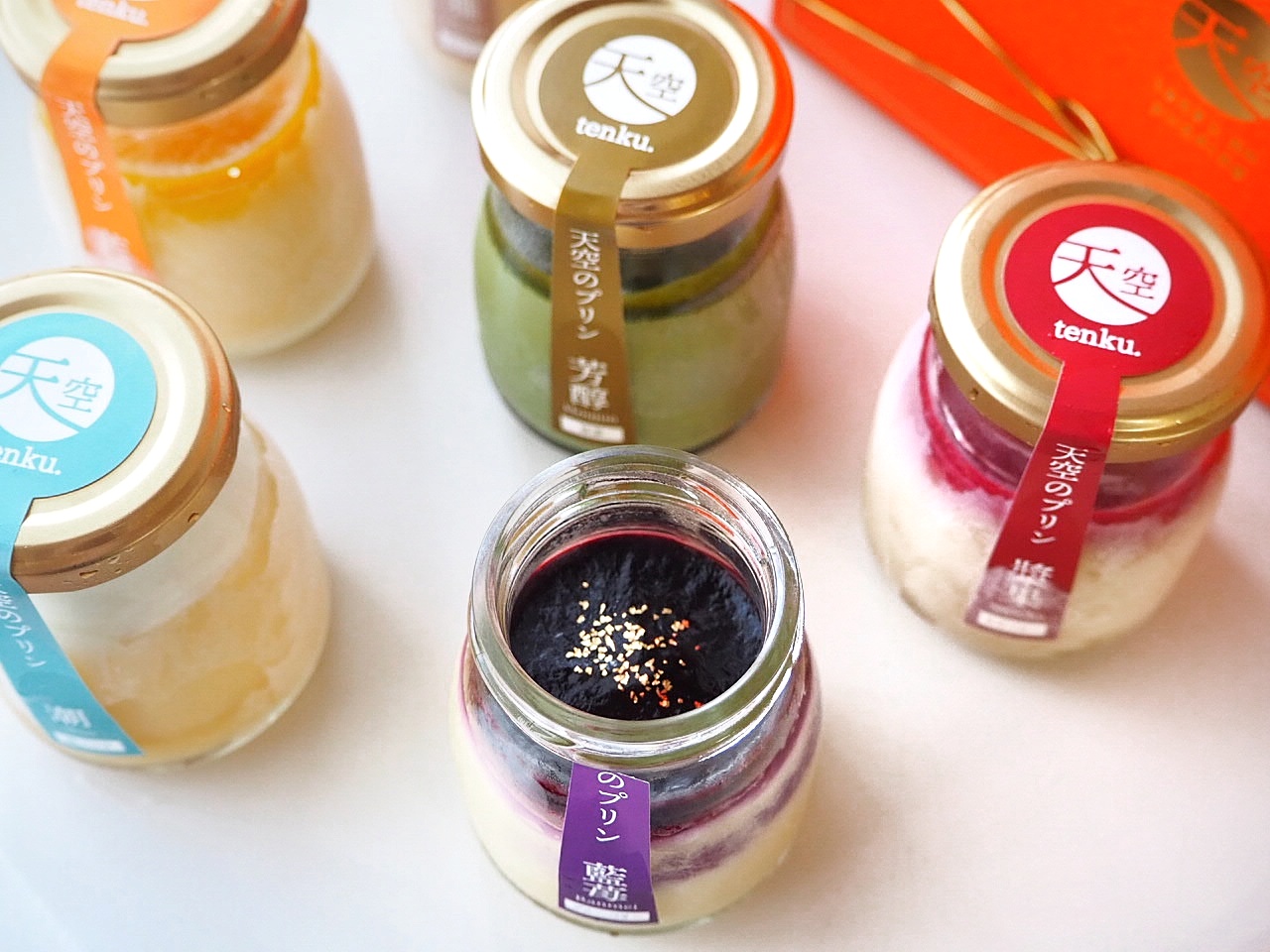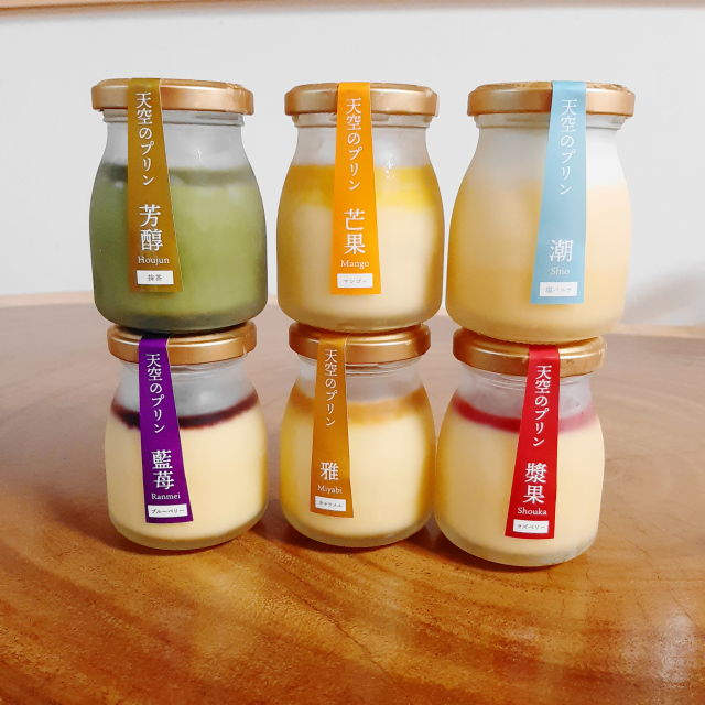 こだわり抜いた素材でパティシエが一つ一つ手作りした「プリン」セットです。キャラメルのほろ苦さ、雪塩のかすかな塩味とバニラプリンの甘味が広がる「雅」、バニラ香る生地にたっぷりのホイップクリームを合わせた「潮(塩バニラ)」、ブルーベリーソースの酸味と風味が生地を引き立たせる「藍苺(ブルーベリー)」、静岡の茶園で育てられた抹茶の芳醇な香りと生クリームの味わい「芳醇(抹茶)」、ココナッツのプリンに完熟マンゴーとパッションフルーツのゼリーを合わせた「芒果(マンゴー)」、ミルクベースの濃厚でクリーミーなプリンに甘酸っぱいラズベリー「漿果(ラズベリー)」の計6種。メディアでも多数紹介された商品なので、自宅用だけでなく贈り物にもおすすめです。