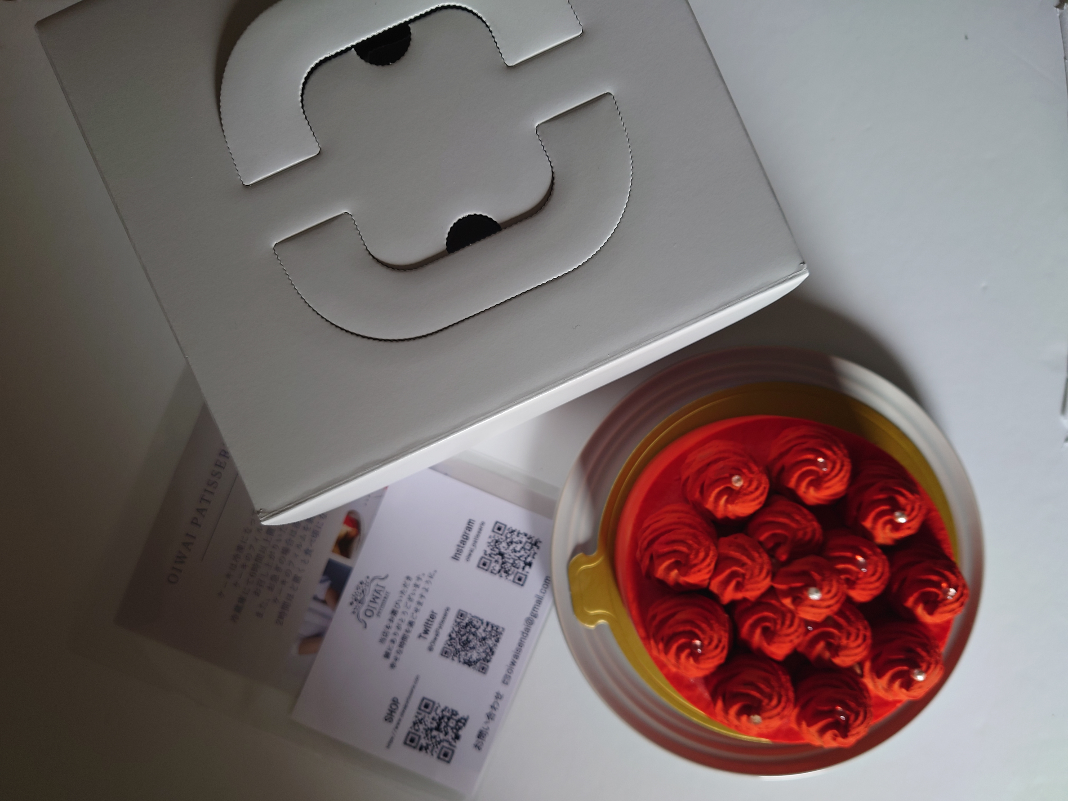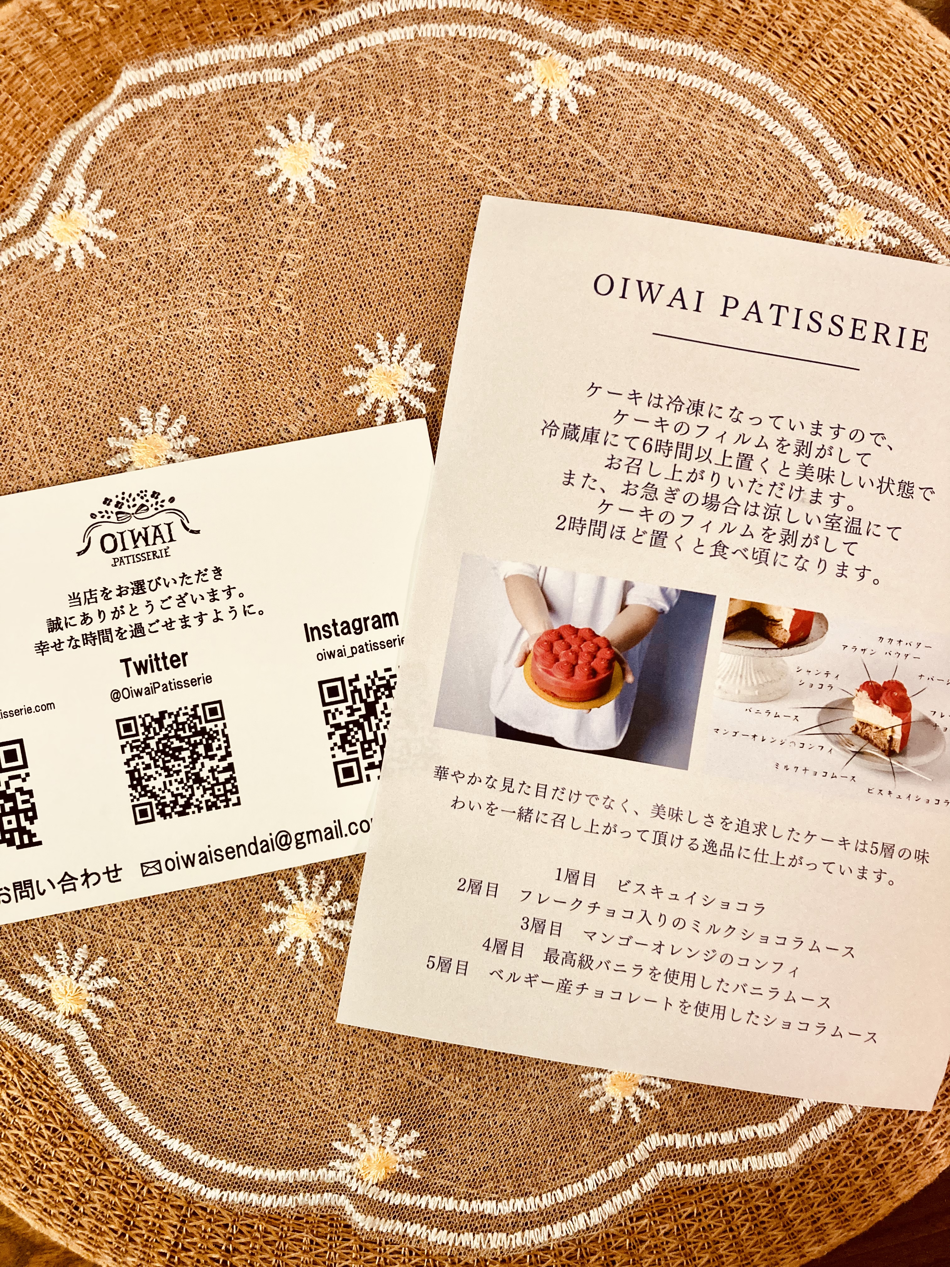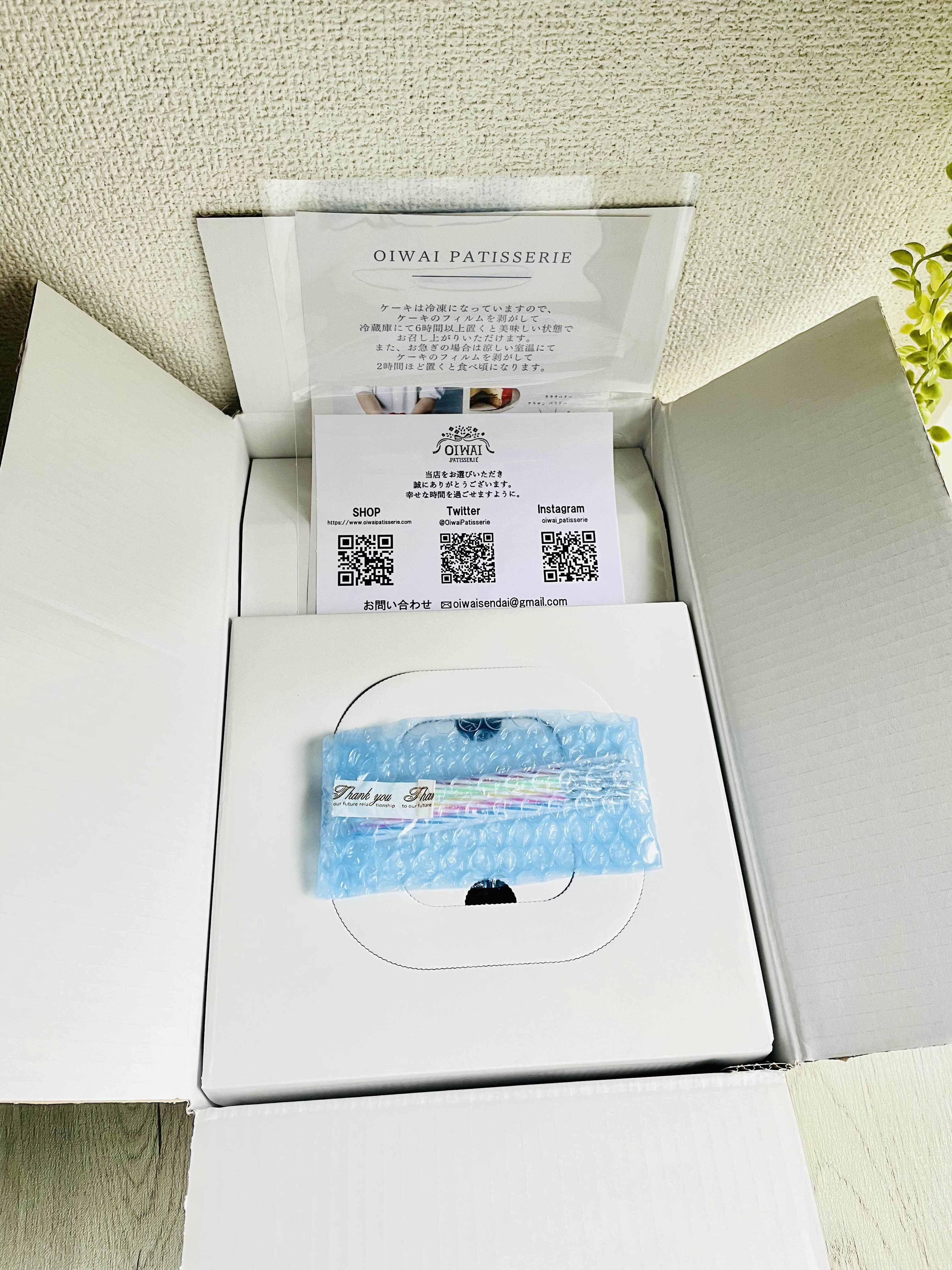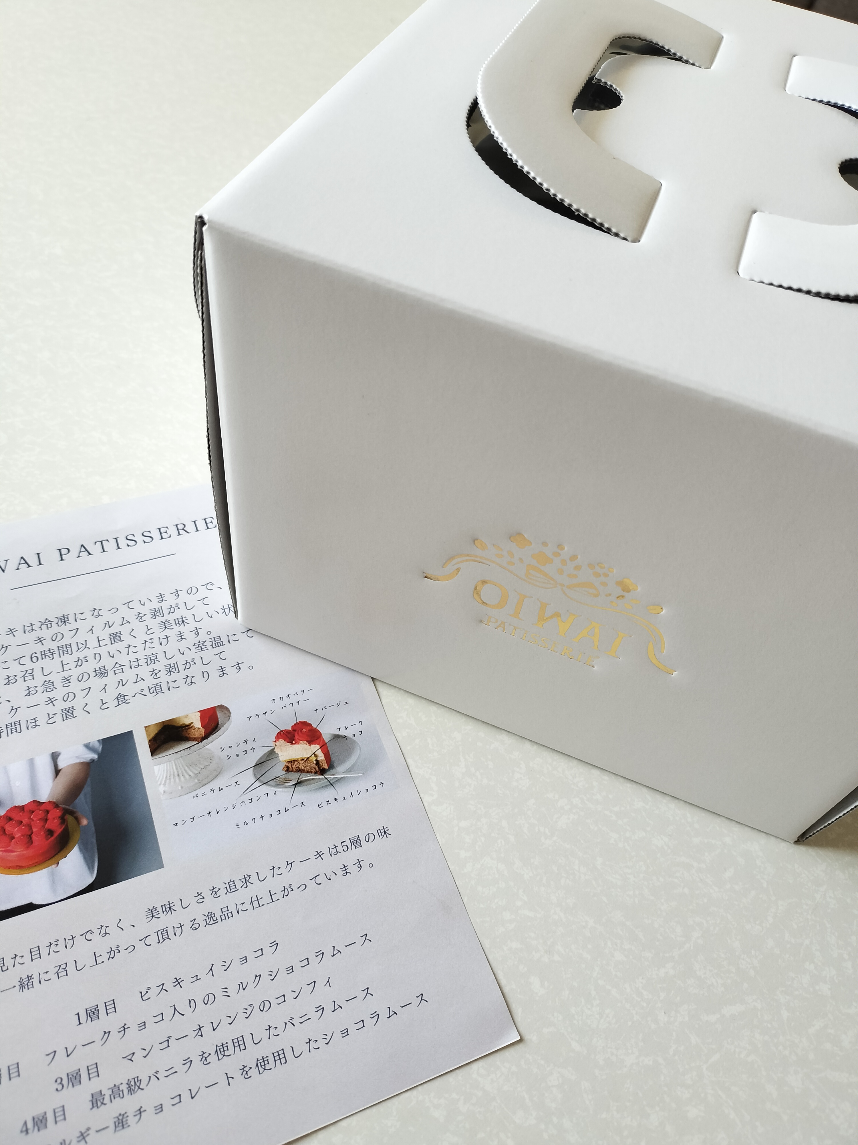『OIWAI PATISSERIE』とロゴの入ったケーキ箱に入っています。ケーキの商品説明と解凍方法が丁寧に書かれ、同封されていました!