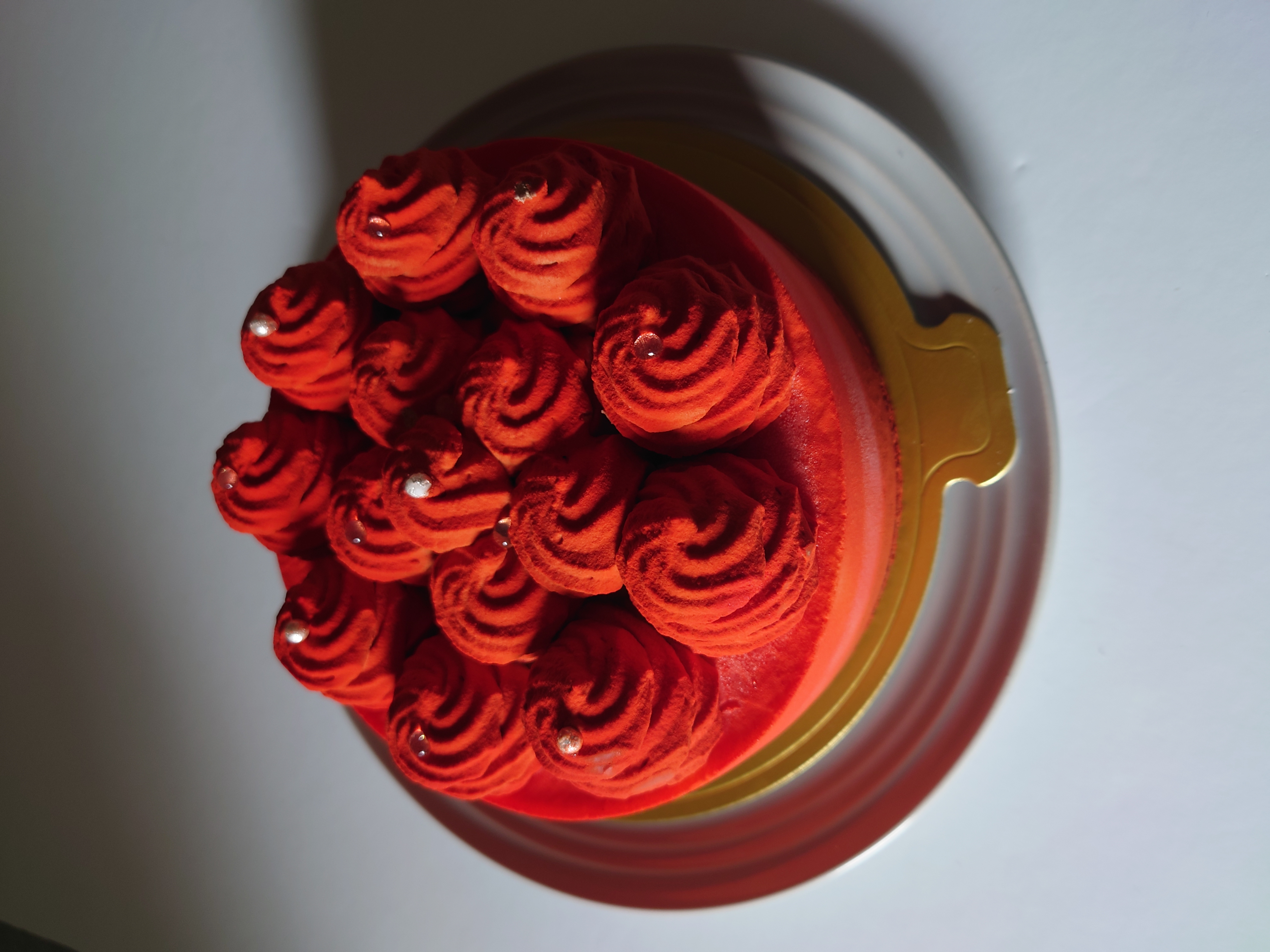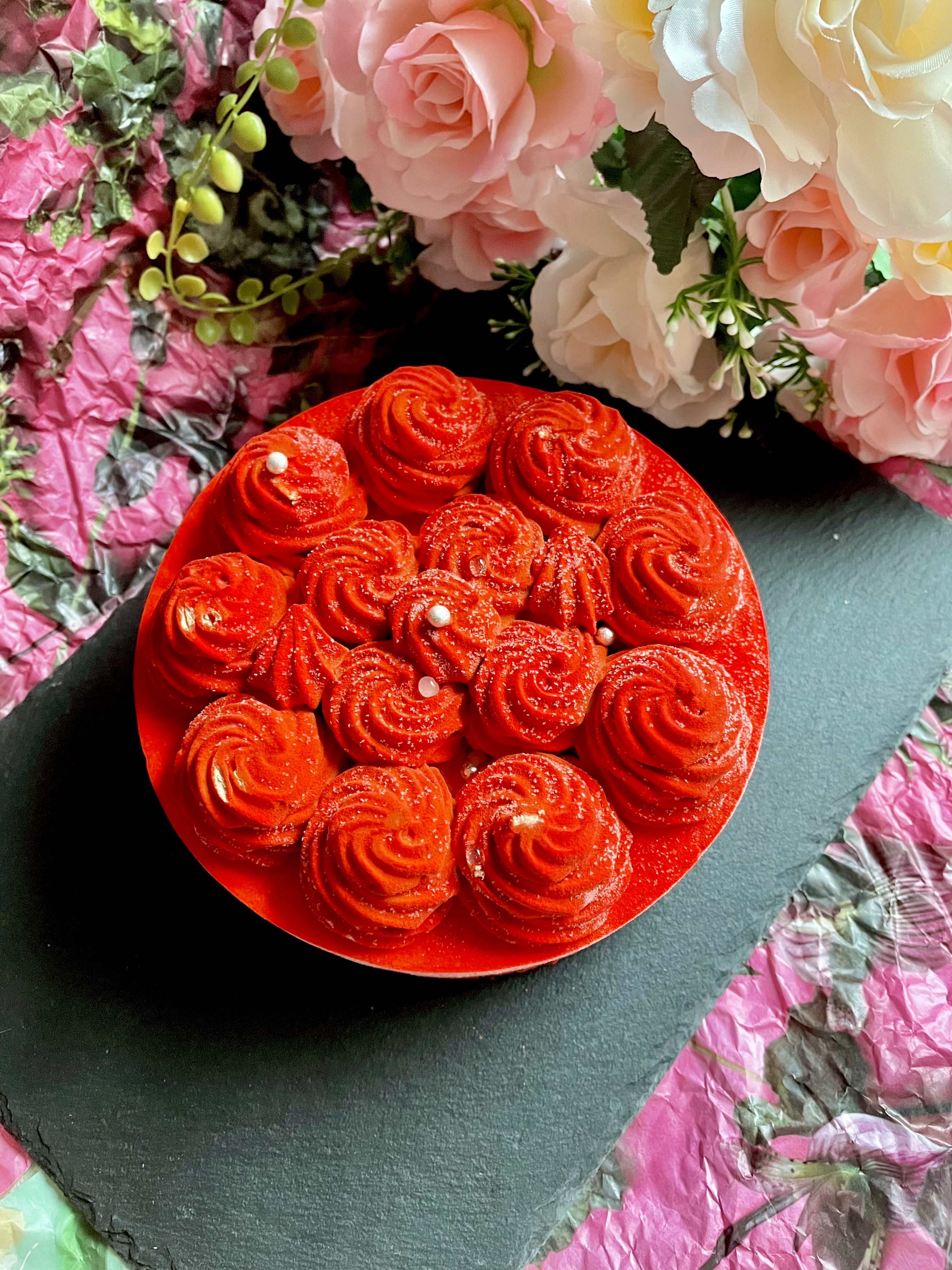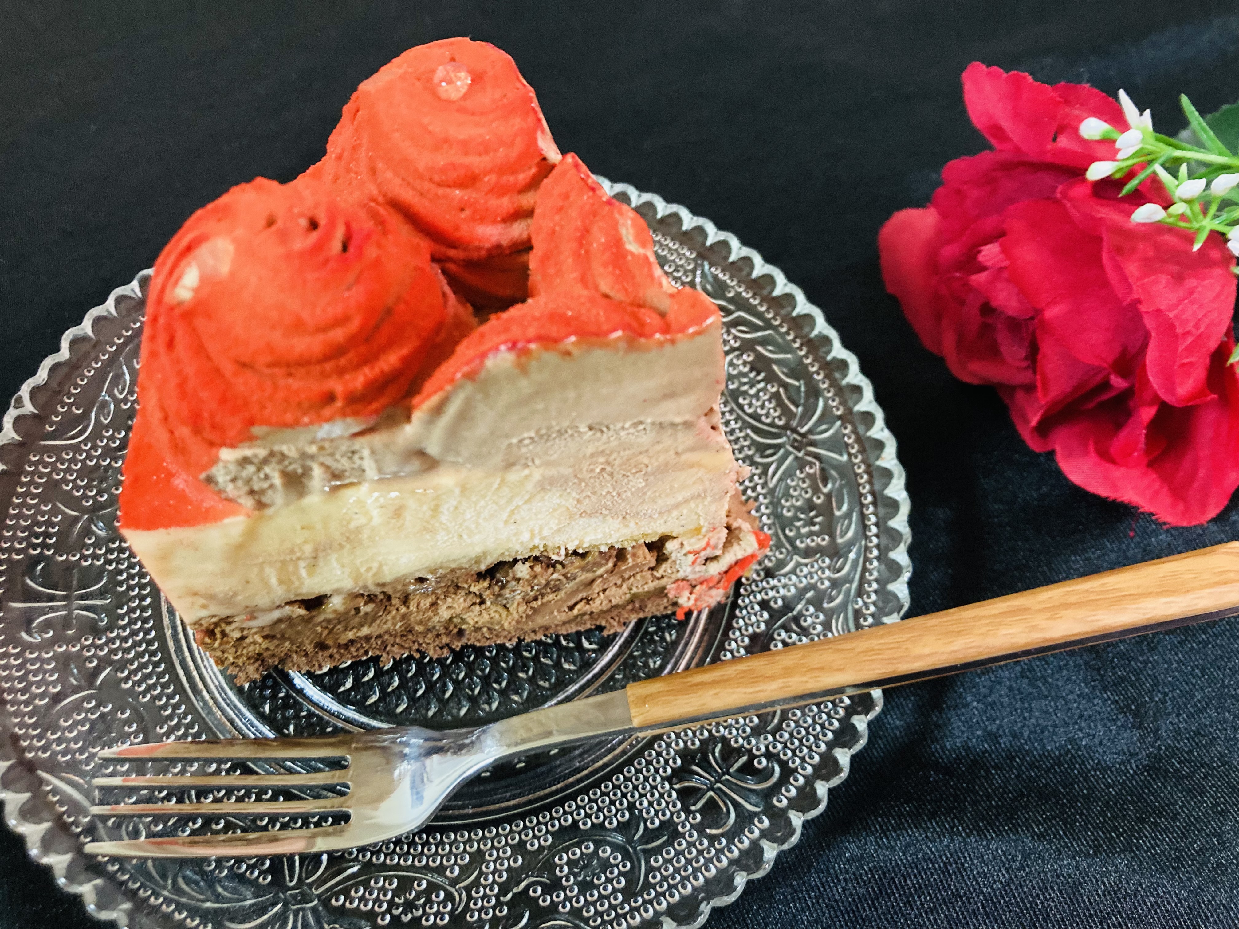 ケーキをひと目見て、とにかく『美しい!』と思いました。「赤」よりも「ルージュ」という表現が適切だと思うような、美しいワインレッドのケーキです。