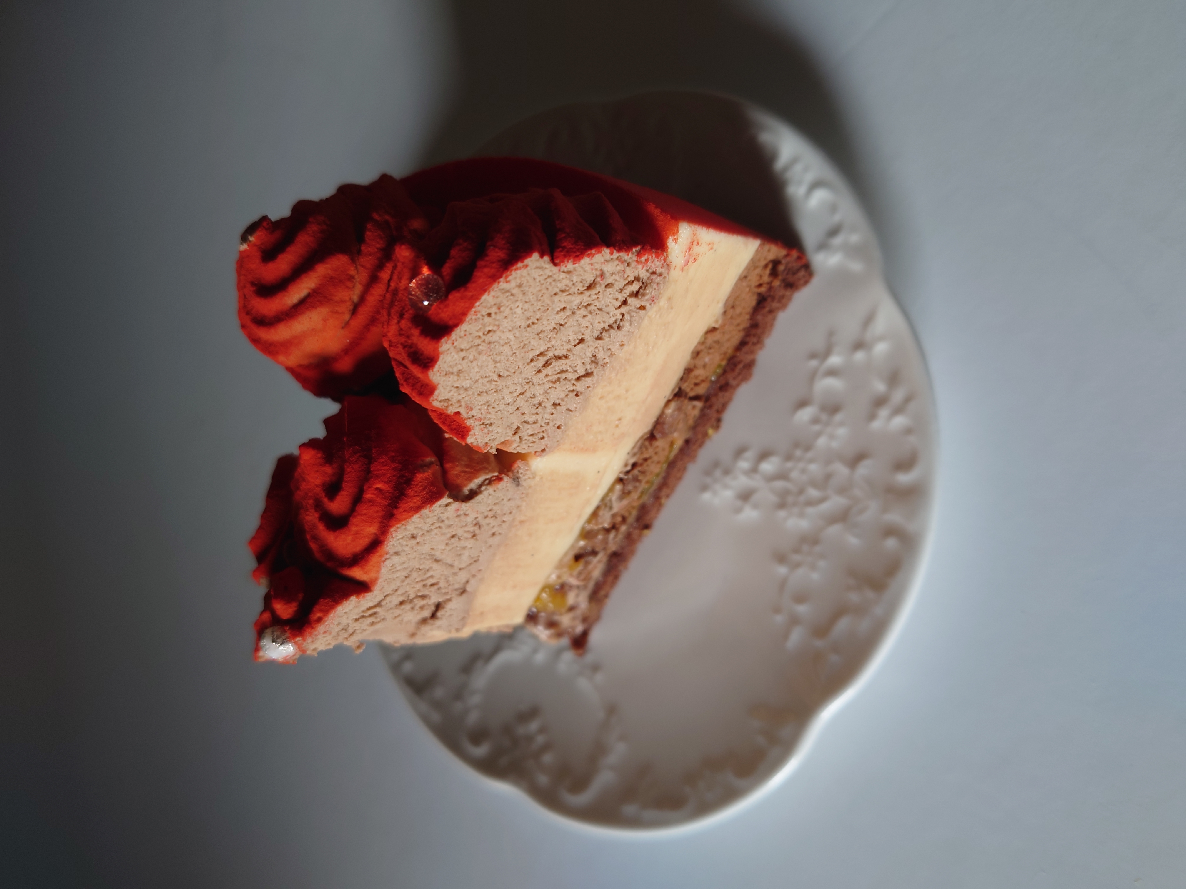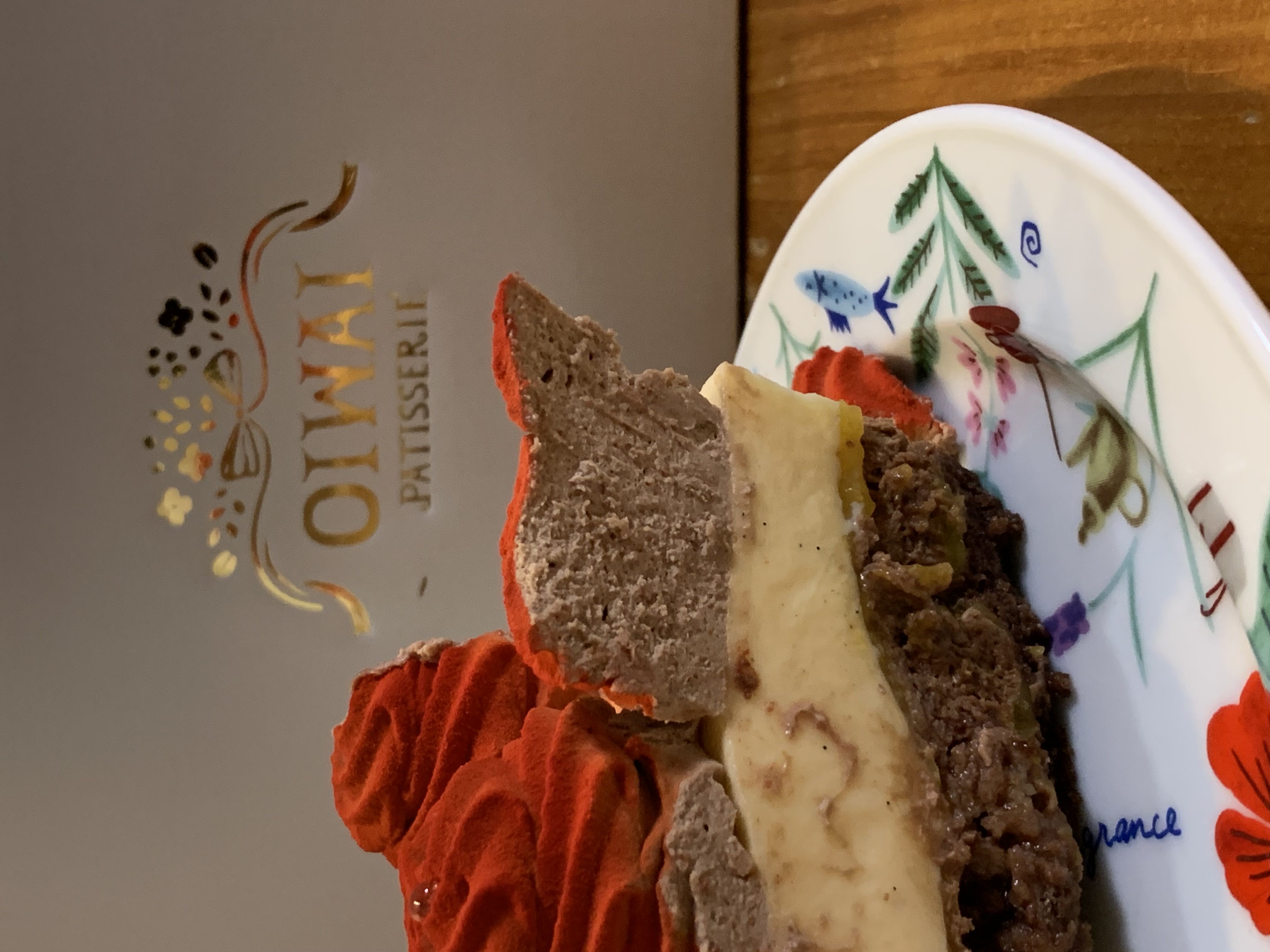 ゆっくり噛んでいくと、バニラムースにチョコフレーク、ビスキュイショコラ、、、3種の異なる食感が楽しませてくれます!特に、チョコフレークの存在感は大きく、ムースの比率が多い中でのフレークが、予想以上に最後まで飽きさせない役割を担い、『OIWAI PATISSERIE』様の発想の素晴らしさを実感します。