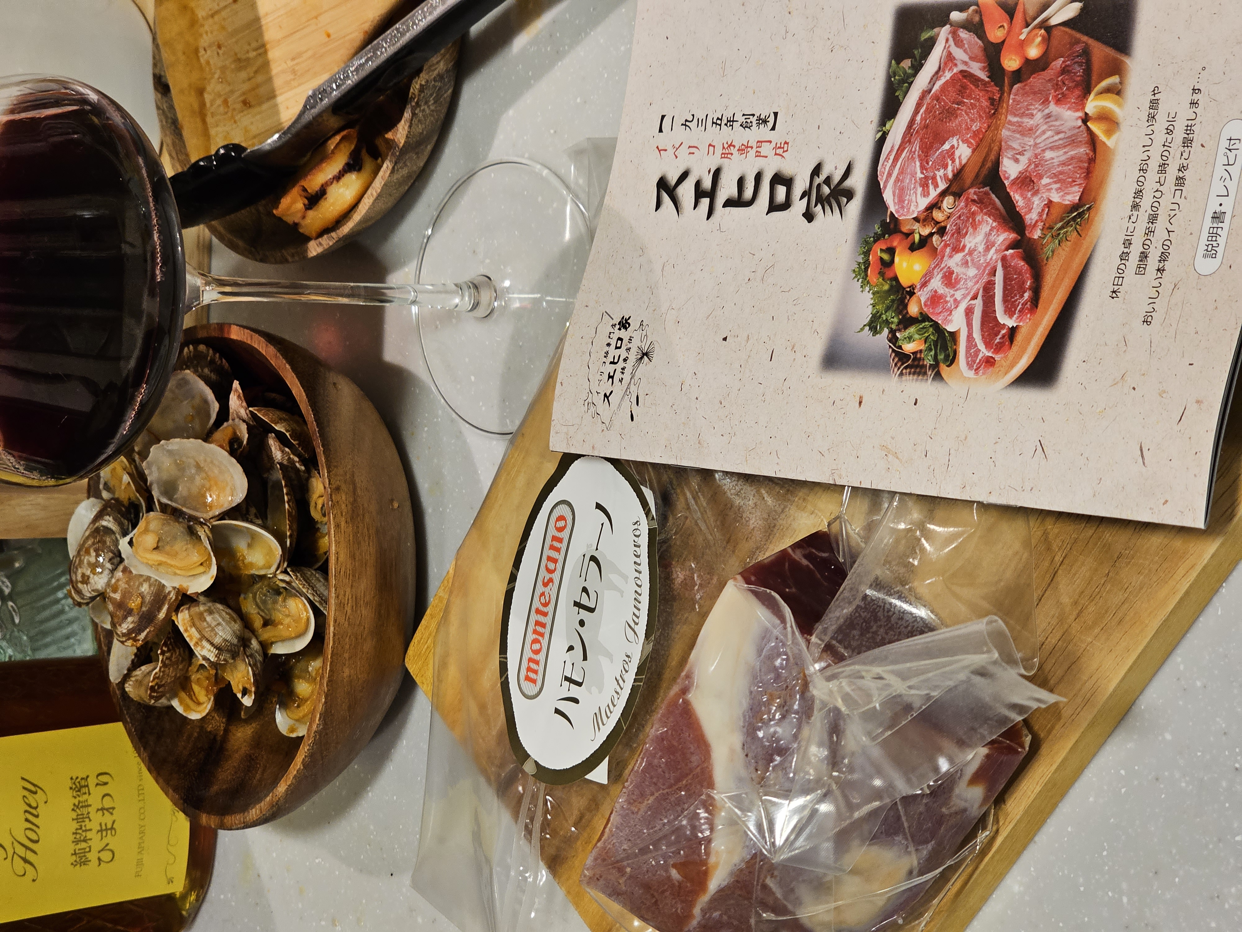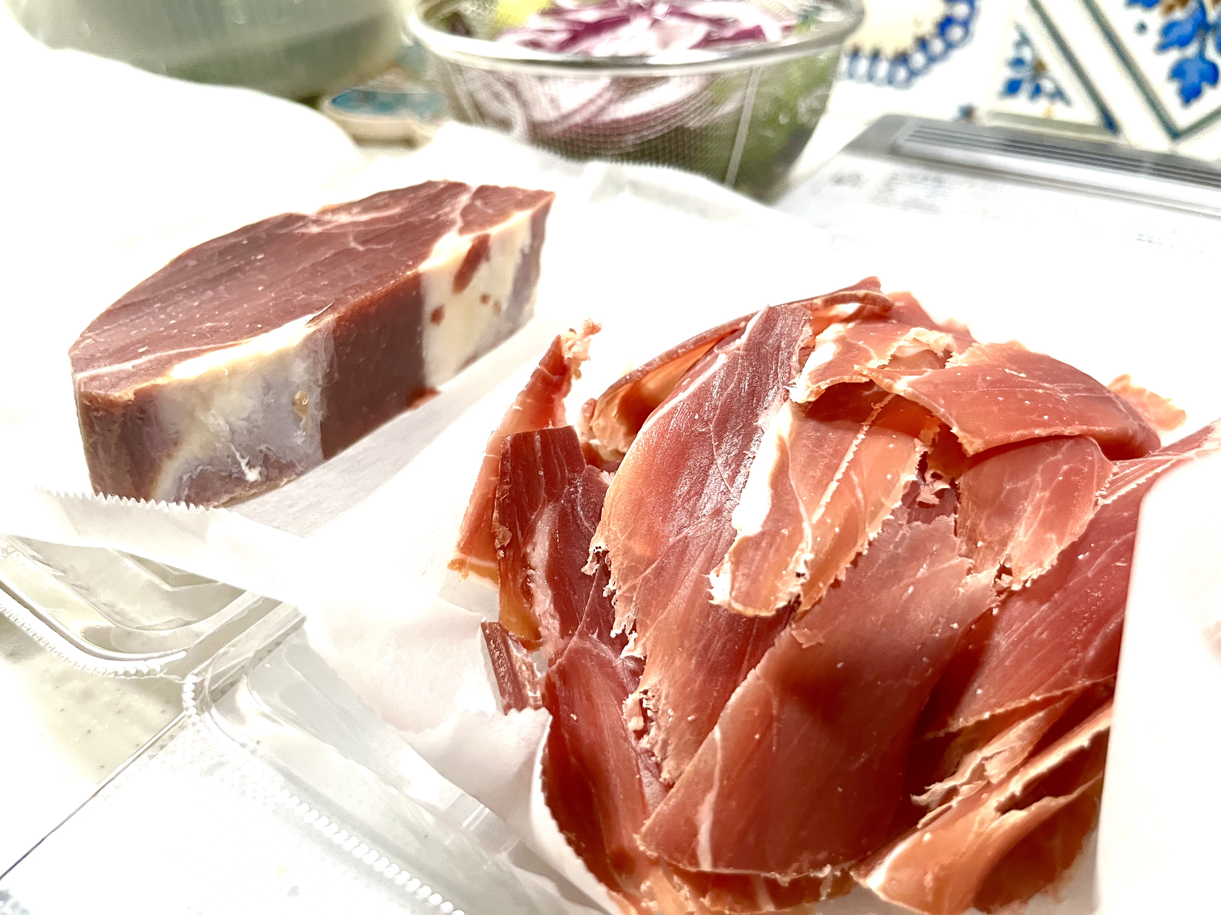 お味は、とろけるような熟成の旨み! 少し強い塩気が印象的で、ワインが進みます。この生ハムは違う……!と、印象に残る美味しさです。これが、切りたてのグラン・レセルバなんですね……!