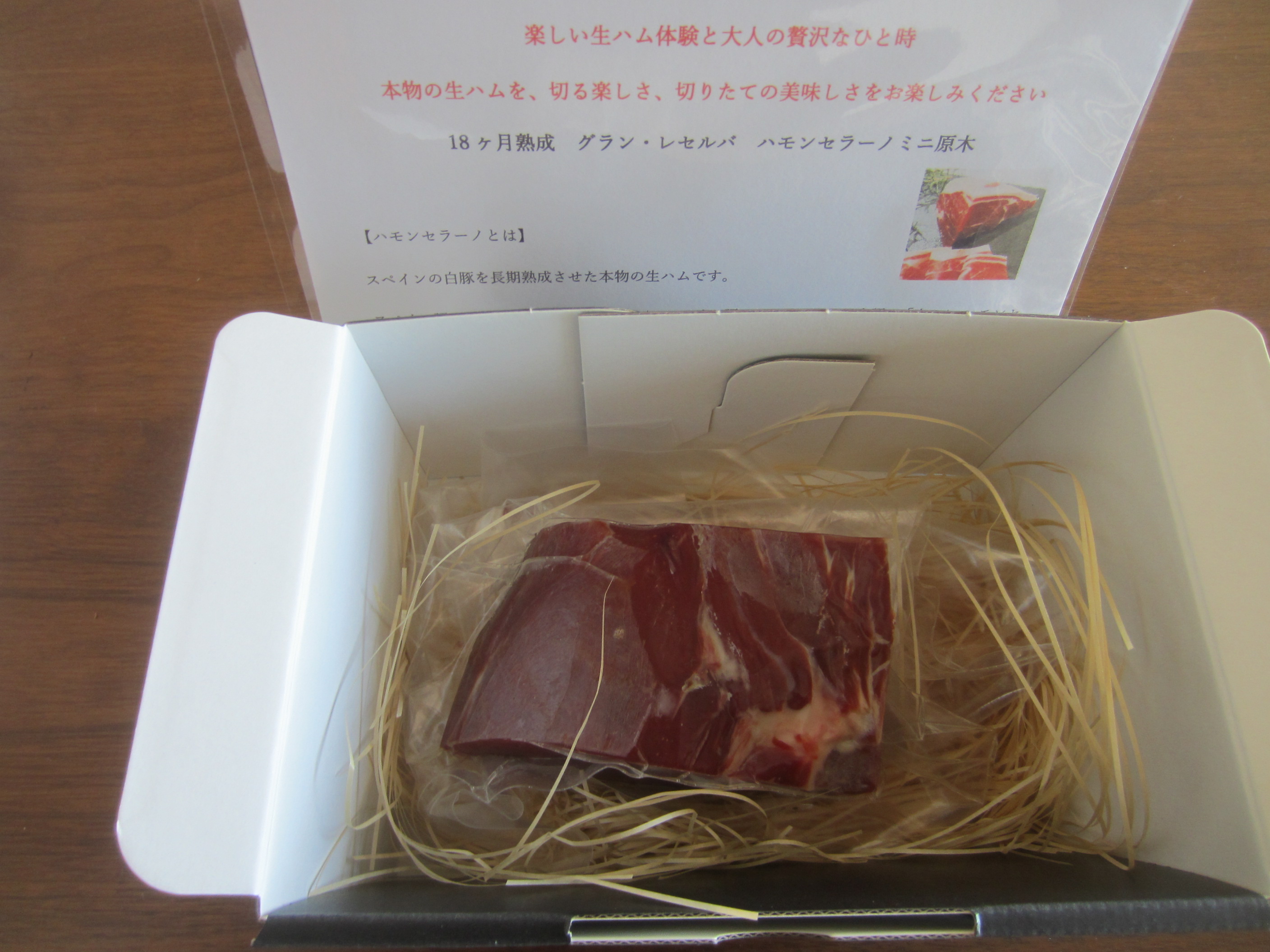 世界三大生ハムハモンセラーノミニ原木。(白豚の生ハム)原木の生ハムの切りたてのおいしさを知る。ハモン(生ハム)の大きさ、切る楽しさ、切りたてのおいしさをお届けいたします。パーティーイベントで盛り上がること間違いなし。