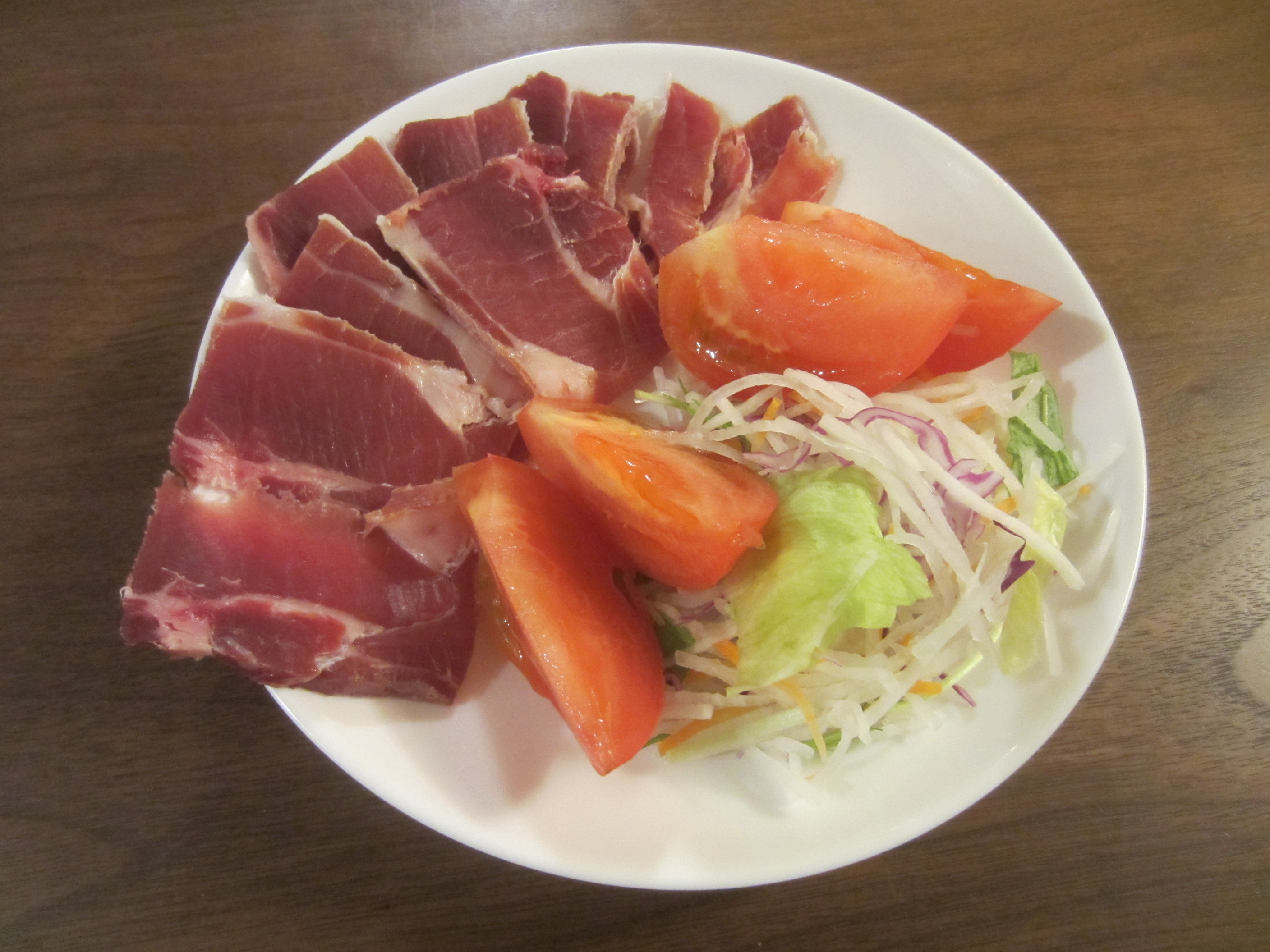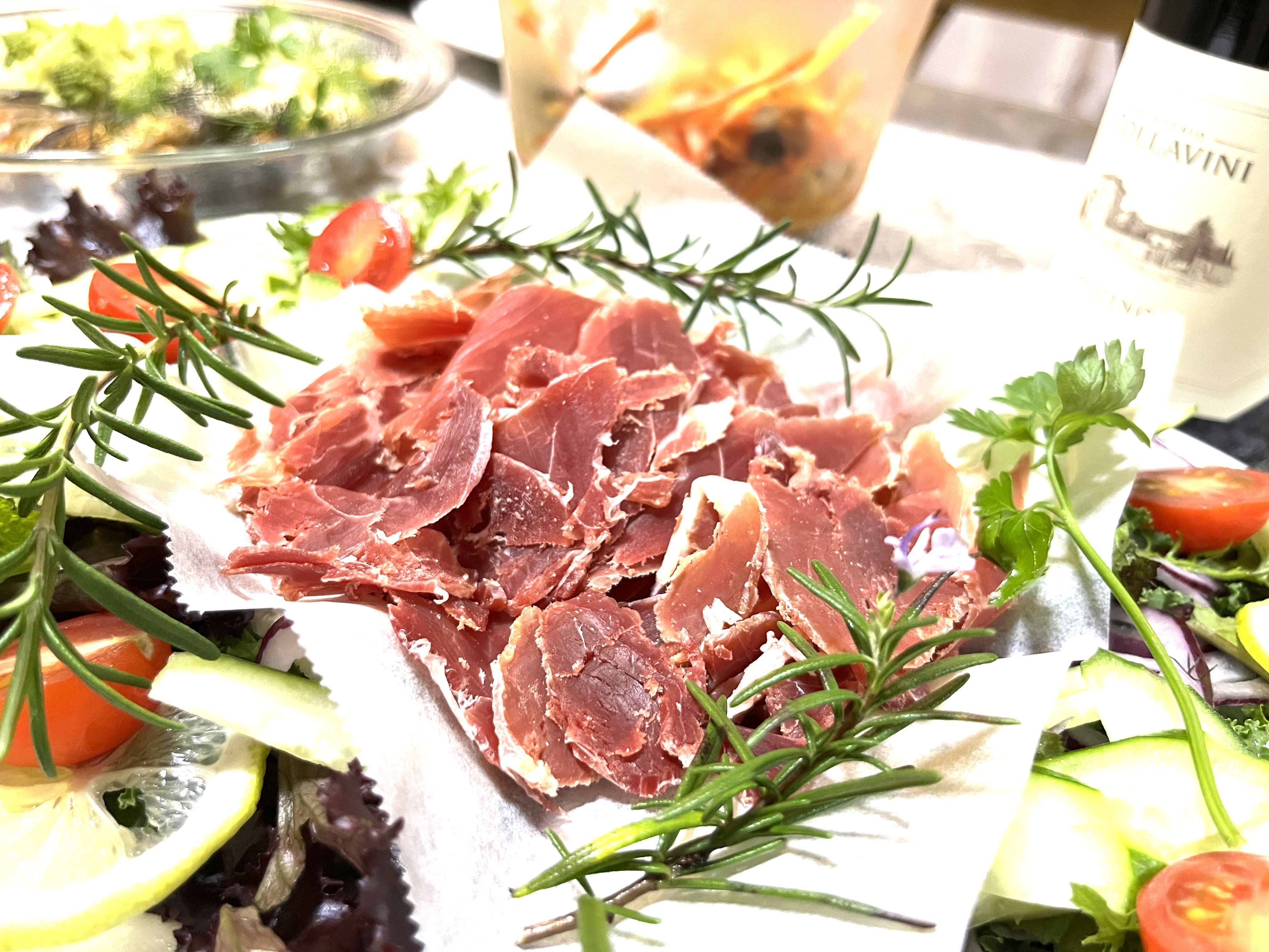 1日目はフレッシュなカットそのものを主役に、ワインといただきました。2日目は、保存方法に書いてあった方法でラップを巻いて冷蔵庫で保存しておいて、自家製サラダといただきました。