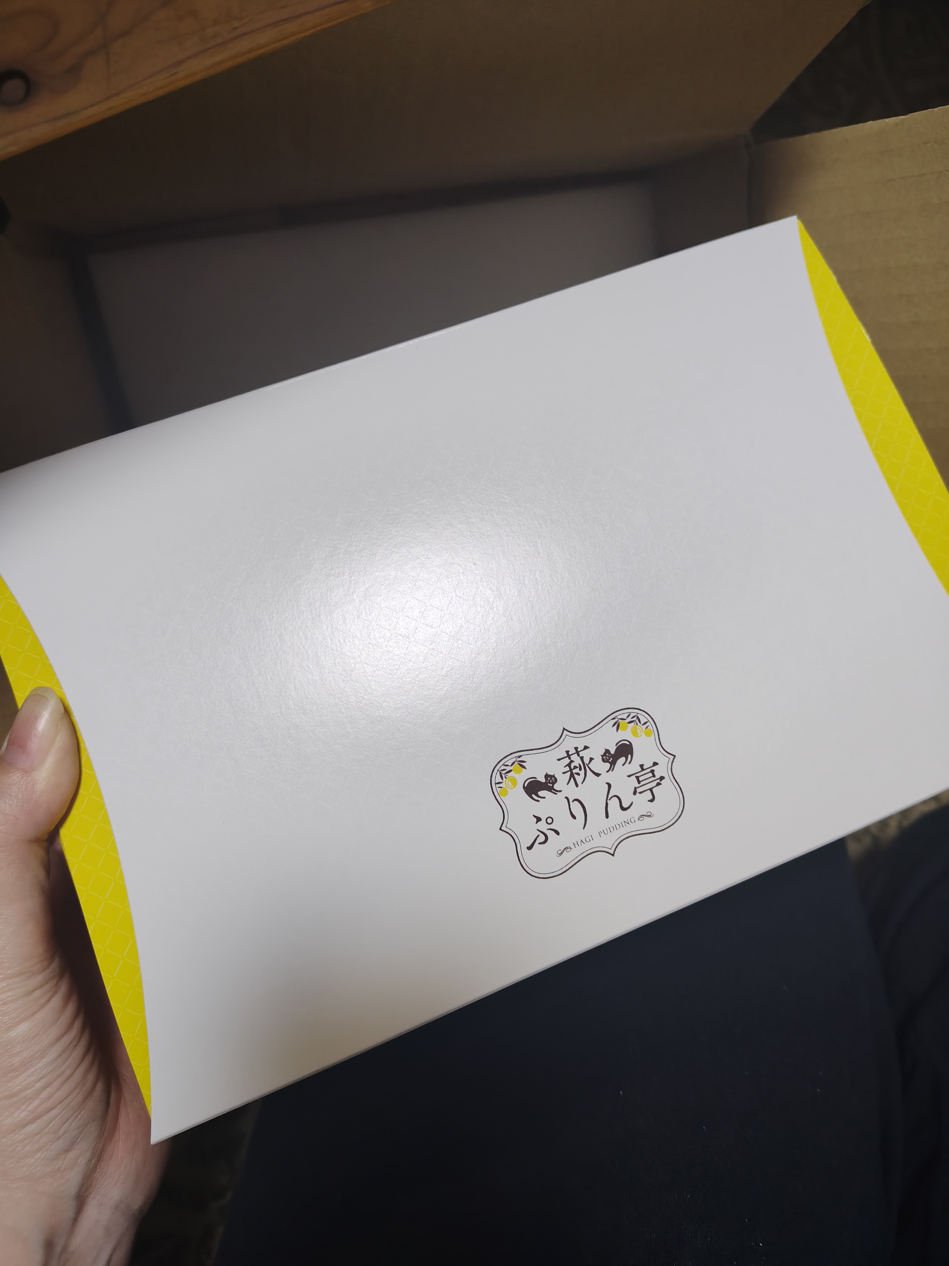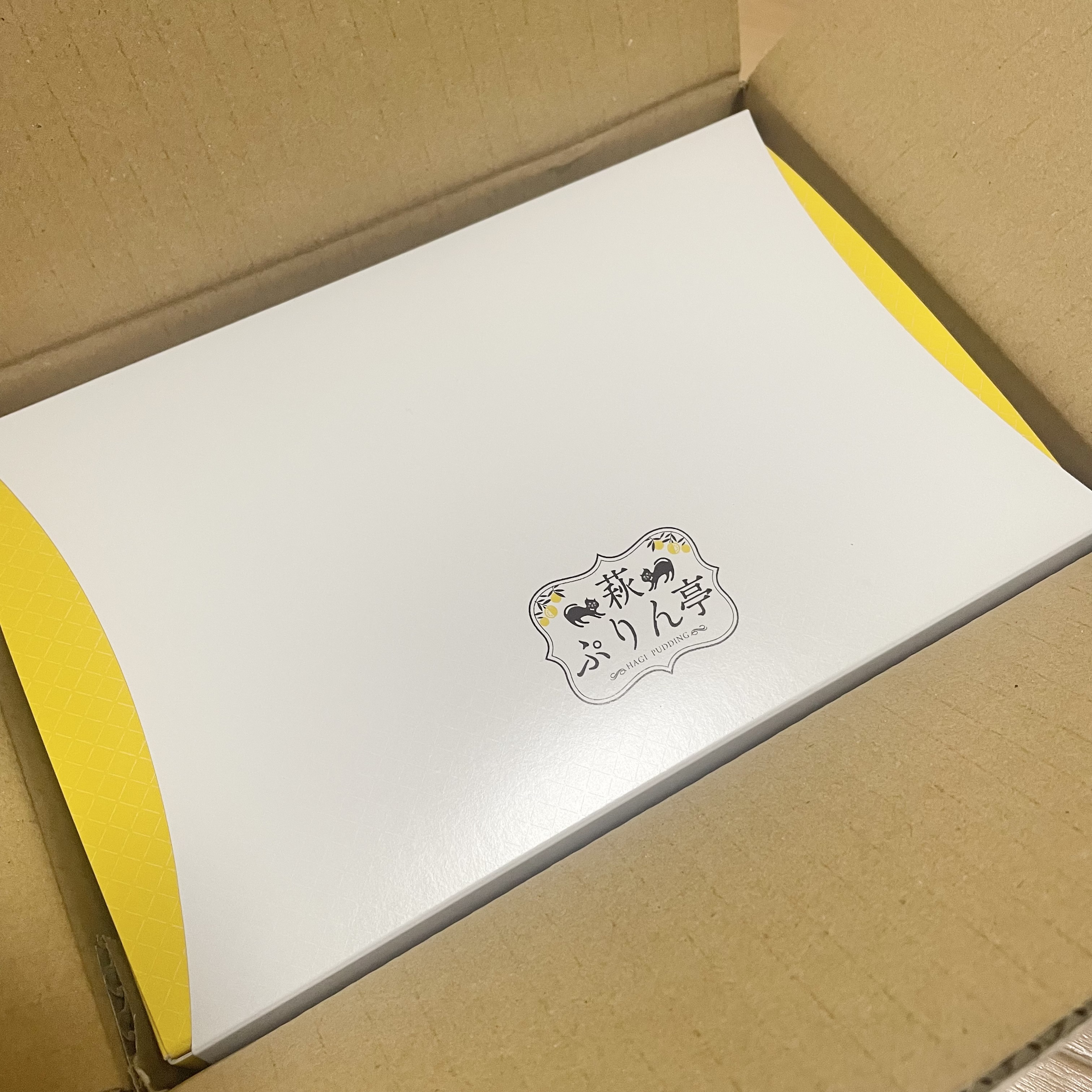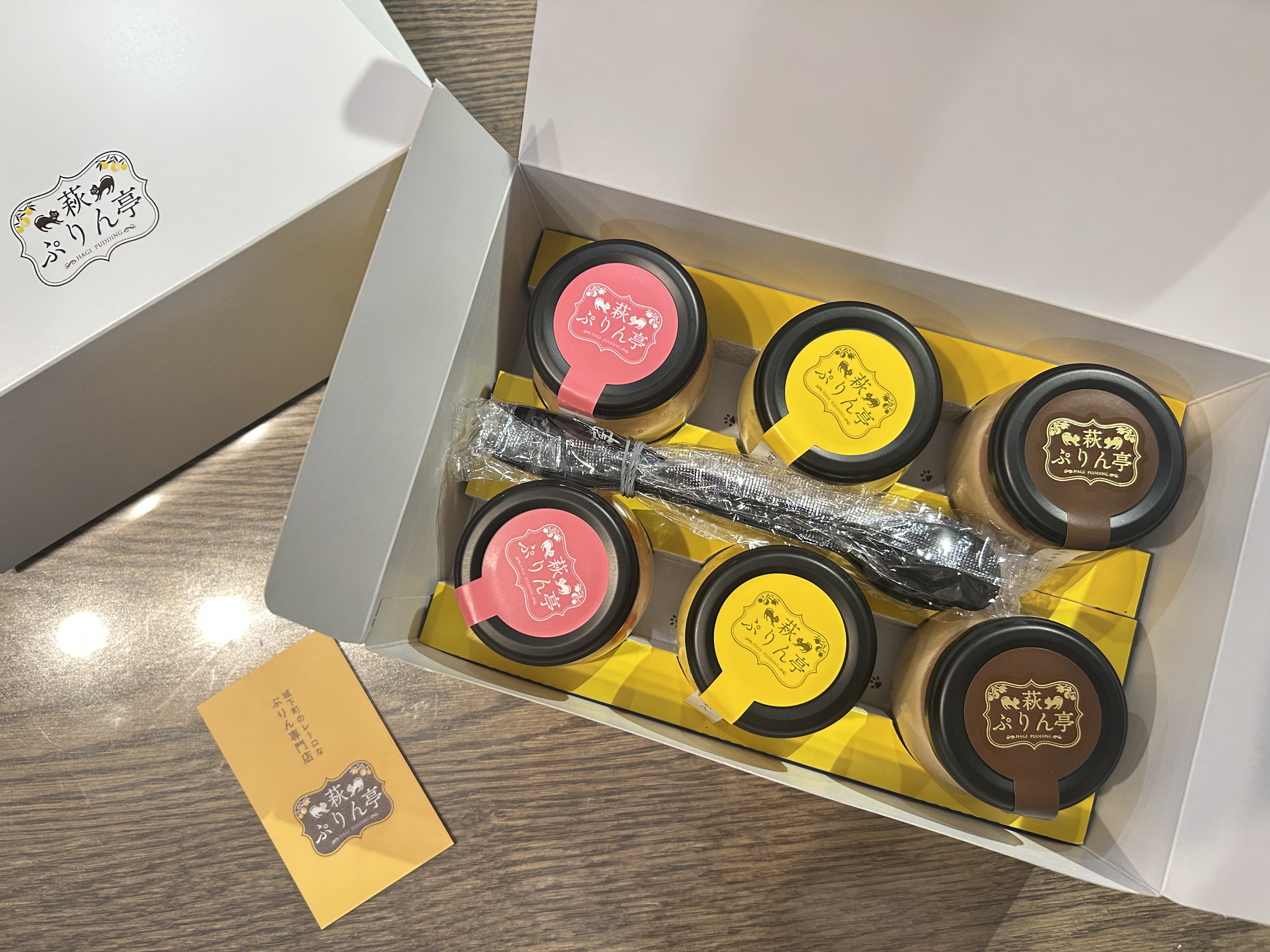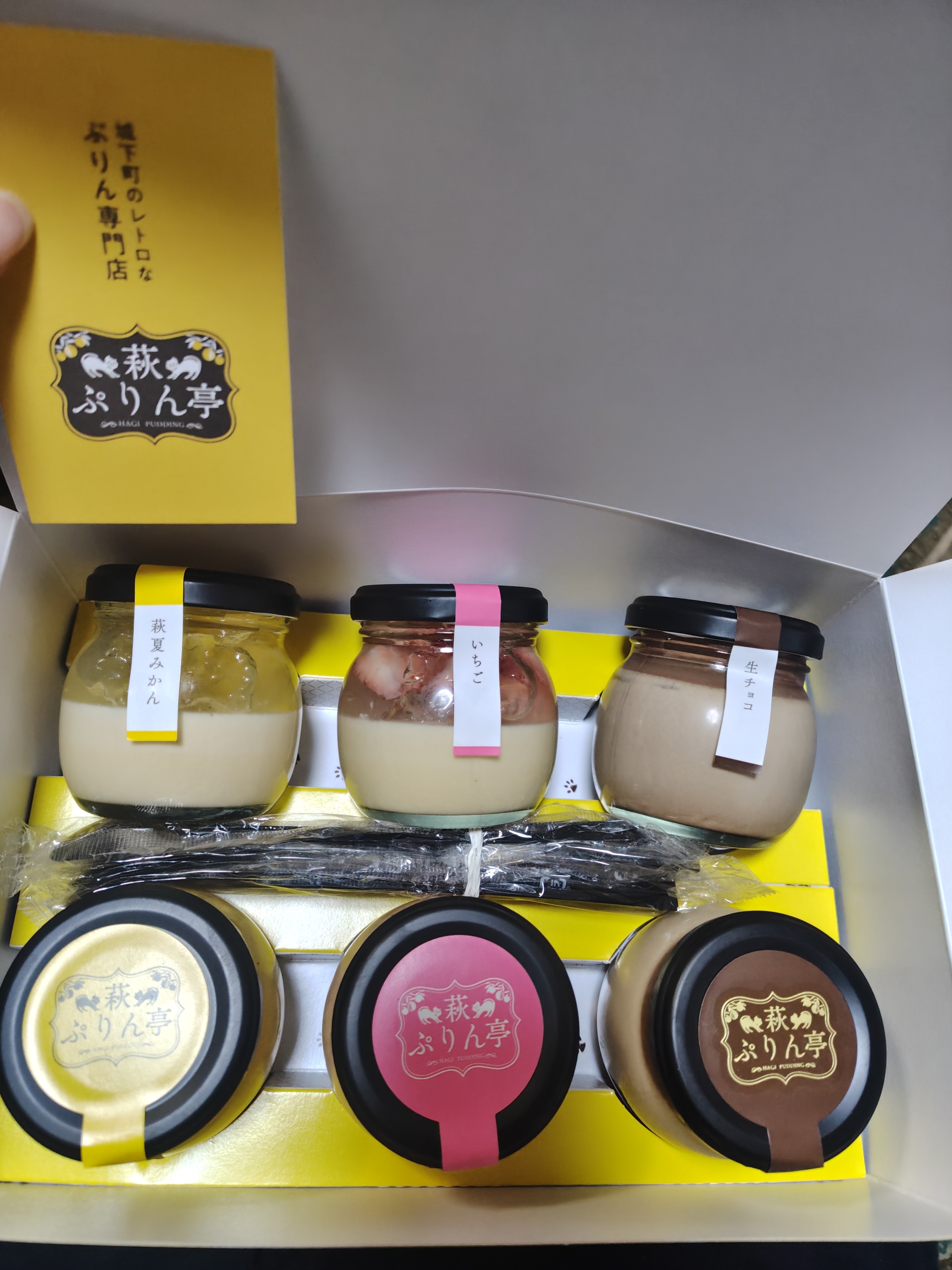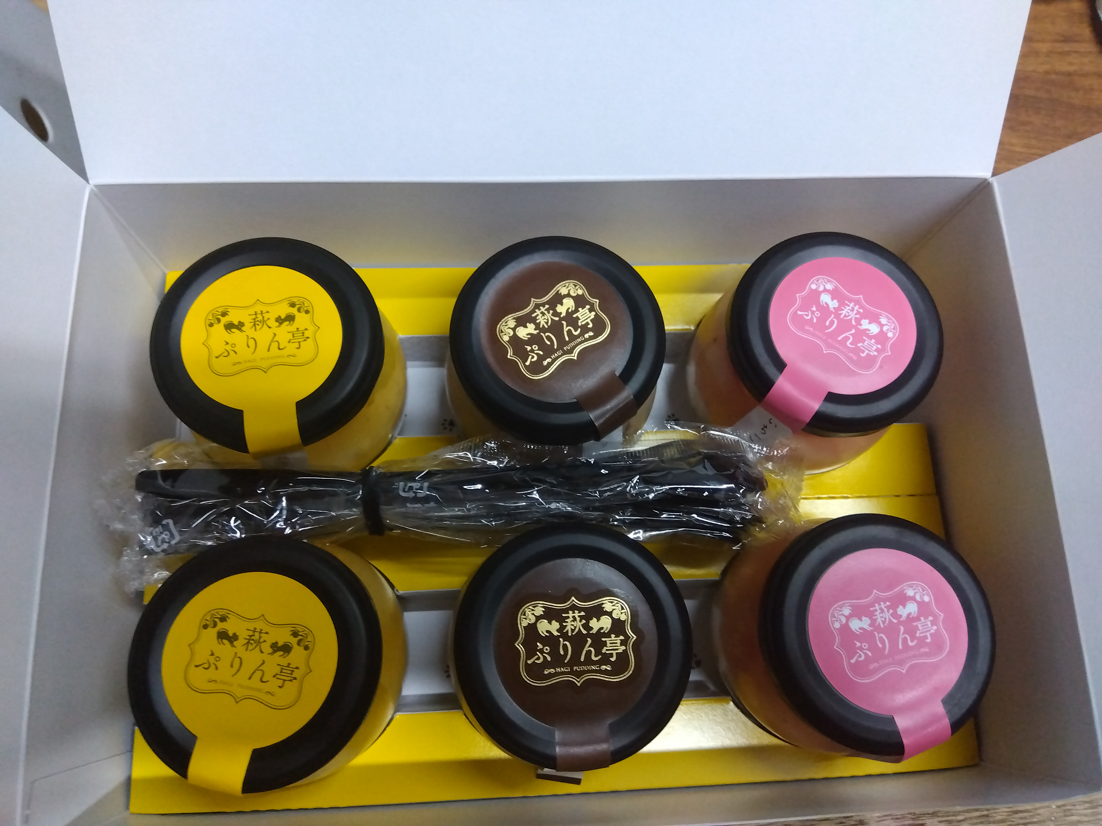 段ボール箱を開けると鮮やかな箱の中に、これまた鮮やかなプリンが6個とスプーンが入っています。