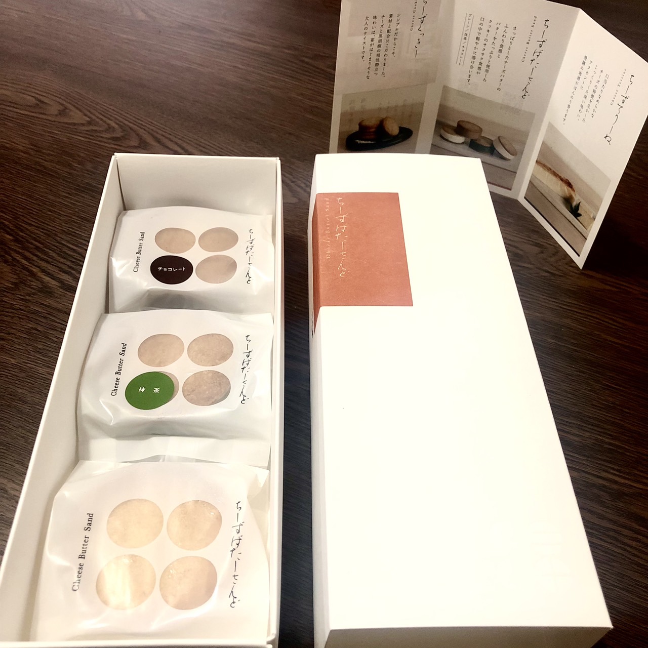 飛騨古川の小さなチーズ菓子店の職人が素材を感じて作る「チーズバターサンド」です。クッキーにはバターをたっぷりと使用し、挟んでいるチーズバタークリームとの調和を図るため、少し塩味をプラスしています。チーズクリームは、ふんわり軽い食感を追求し、クリームとチーズのバランスを整え、後味もさっぱりと食べやすい印象に仕上げています。素材の味をシンプルに感じる「プレーン」、チョコの濃厚さをプラスした「チョコ」、抹茶の香り豊かな「抹茶」3種セット。上品なパッケージに入って届くので、手土産スイーツとしてもおすすめです。