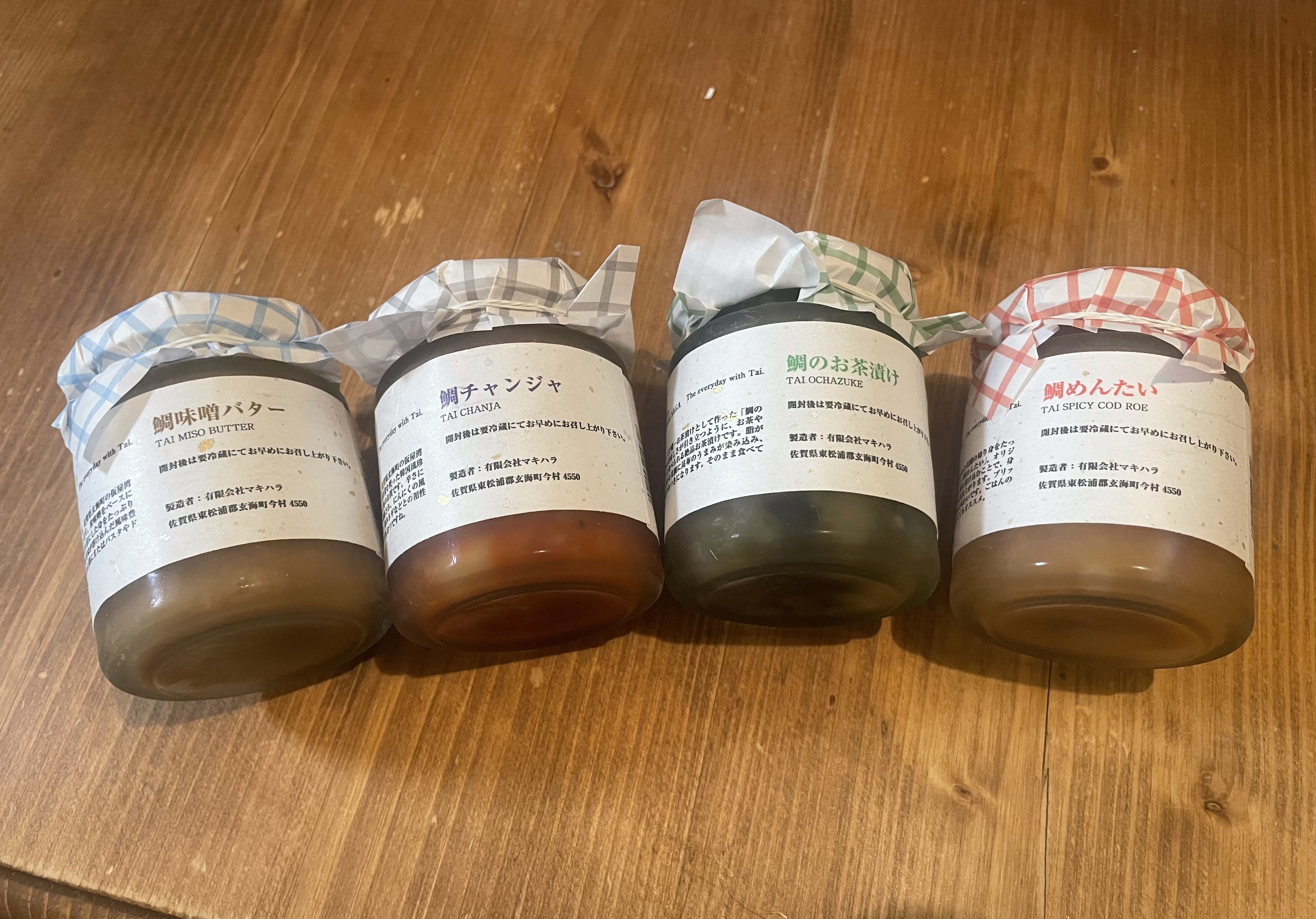 佐賀県玄界灘を望む仮屋湾産の真鯛を使用した「鯛のご飯のお供」セットです。「鯛めんたい」は、専用だし汁にじっくり真鯛の切り身を漬け込み「鯛の漬け」を作り、博多名物の明太子と和えています。「鯛のお茶漬け」は、茶漬け専用だし汁に鯛を漬け込み、下味を付けています。「鯛チャンジャ」は、タラの内臓を使用することで独特な味わい引き出し、身と良くなじむよう同じ漬けたれに漬け込んでます。「鯛味噌バター」は、真鯛の身をそぼろ状にし、果物や玉ねぎを入れた特製のたれを加えた米味噌に練り込み、バターでまろやかに仕上げています。鯛の味わいを贅沢に引き出した4種セットなので、贈り物にもおすすめです。