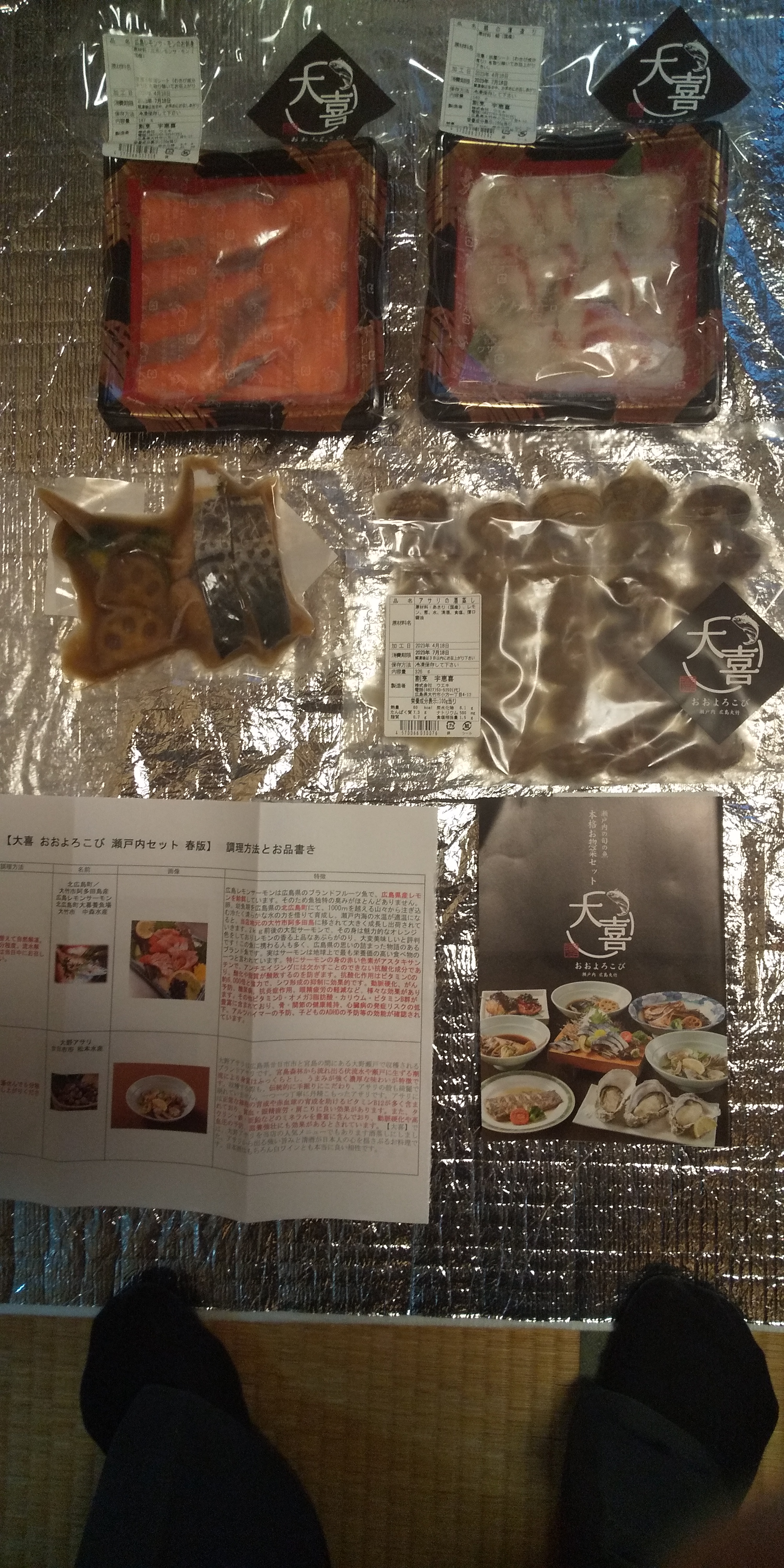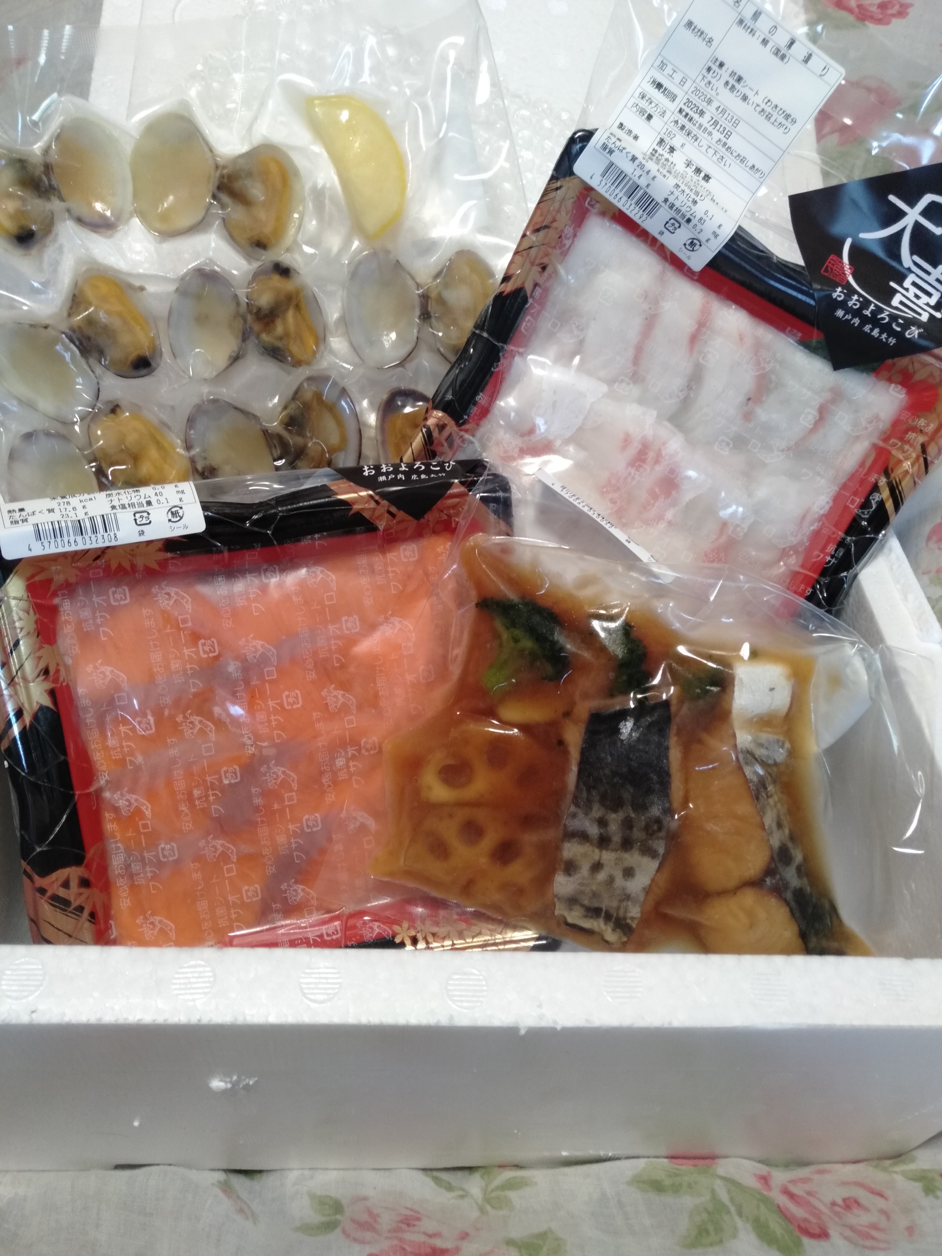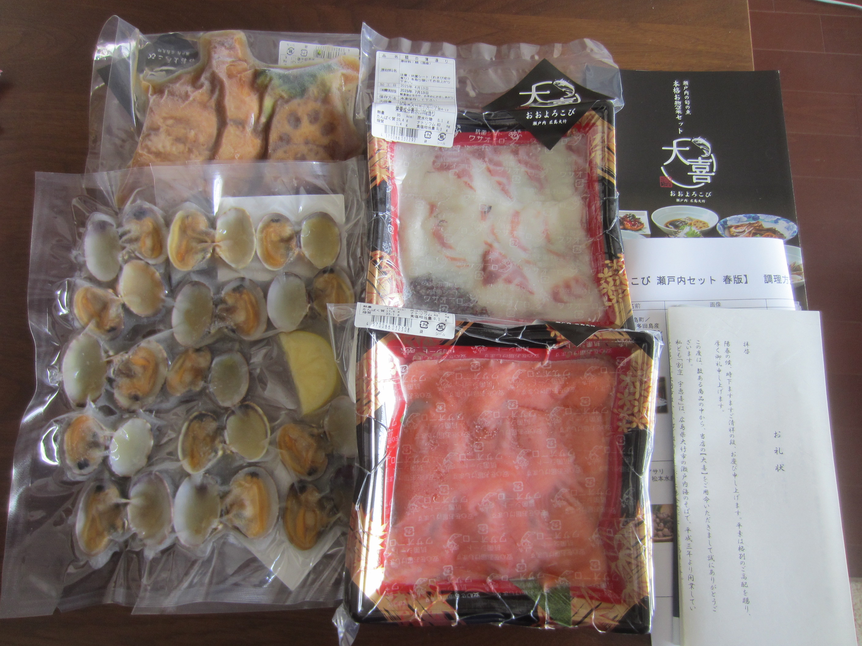 一番上にカタログセットが乗せられ、その下には、真空パック包装されたお惣菜が4種、上から「広島レモンサーモンのお刺身」「瀬戸内海産 鯛の薄造り」「大野あさりの酒蒸し」「瀬戸内海産 鰆の煮付け」の順に収められていました。