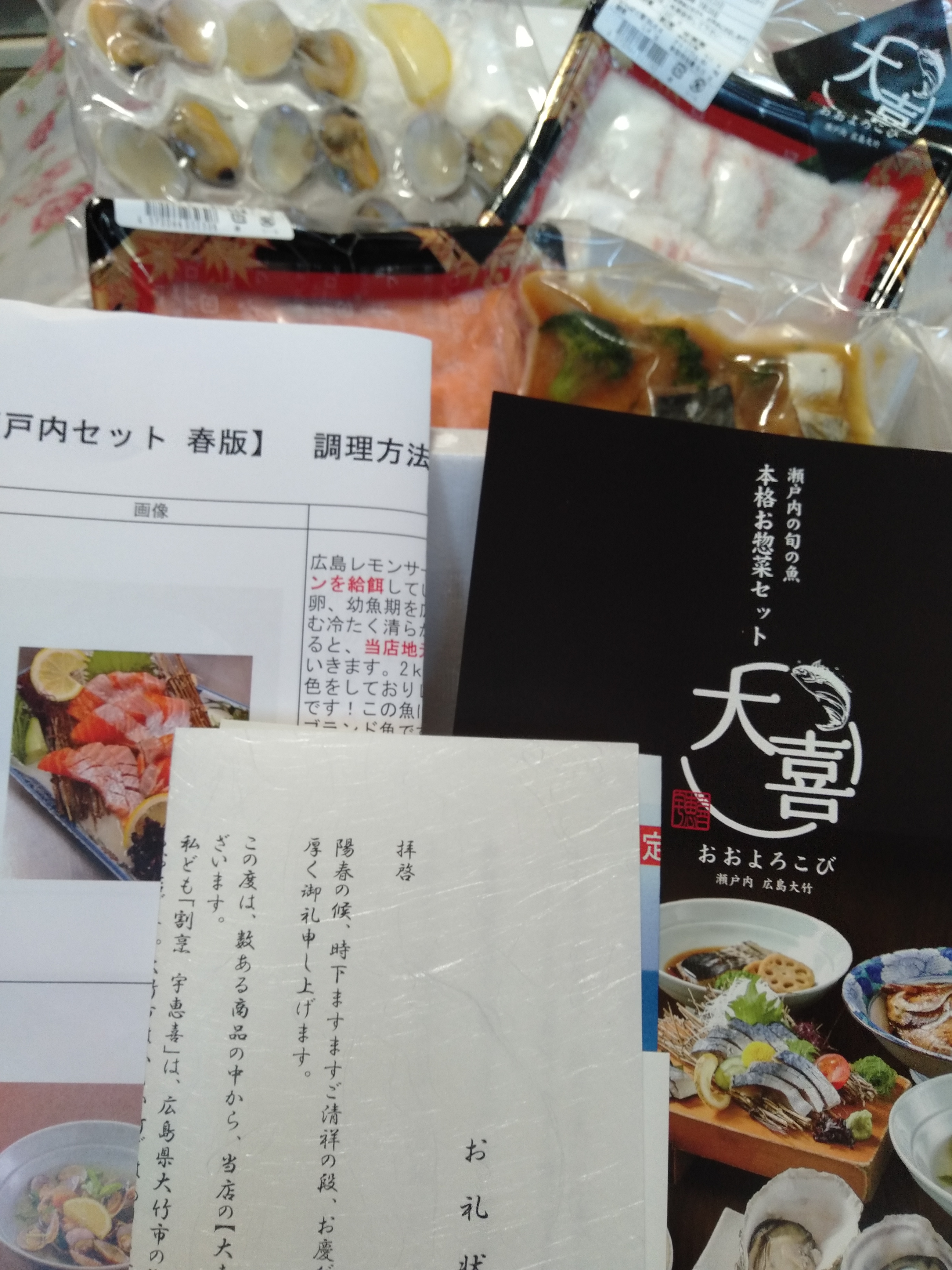 カタログは「瀬戸内旬の魚 本格お惣菜セット 大喜ガイド」「期間限定 広島レモンサーモン特集ガイド」「お礼状」「アンケートはがき」「大喜 瀬戸内セット春版 調理方法&お品書き」の5種類が入っていました。