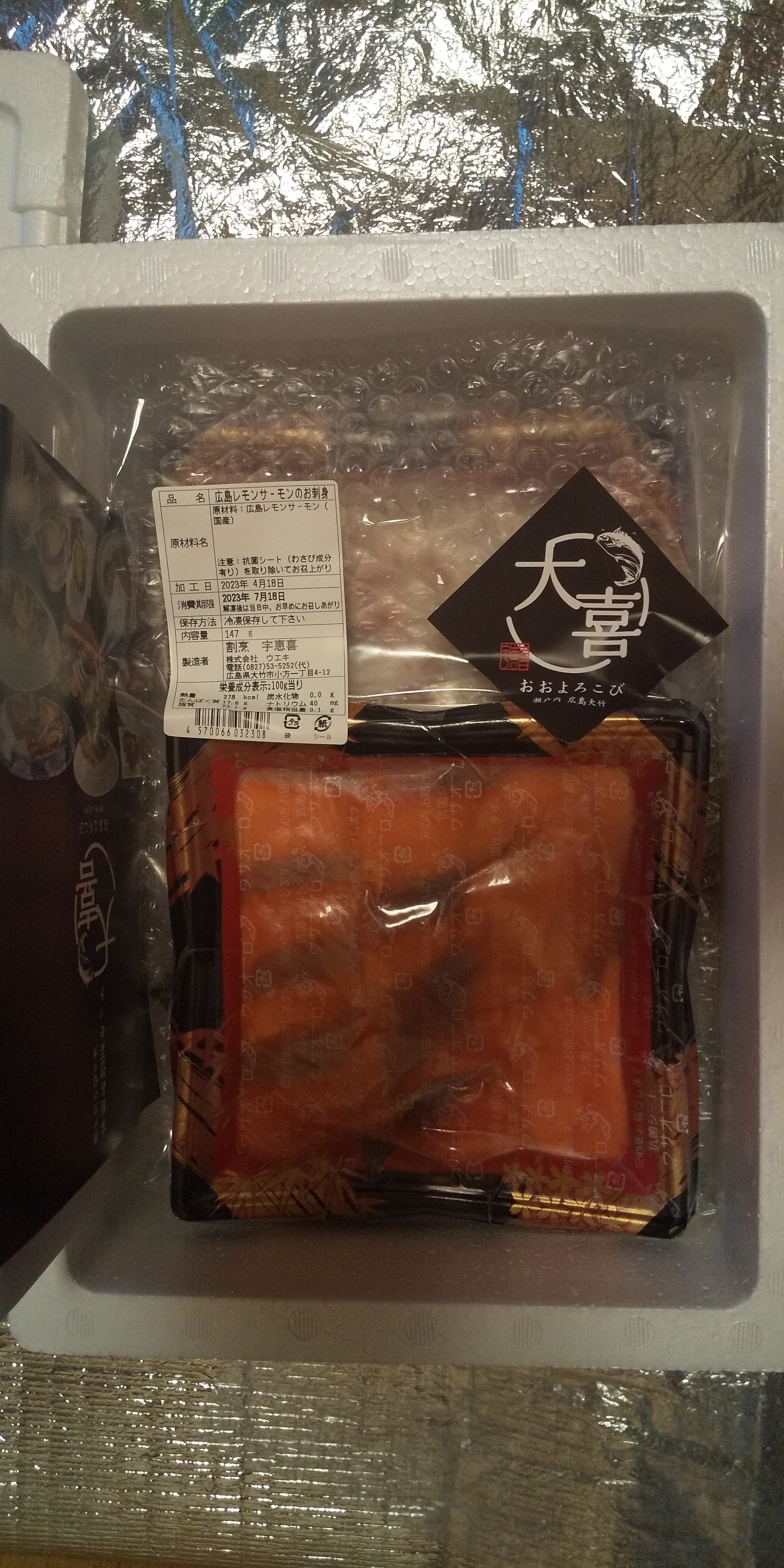 パックの様子はきれいなトレーに薄造りが美しく並べられ、抗菌シートも入って、真空パックされていました。143gです。