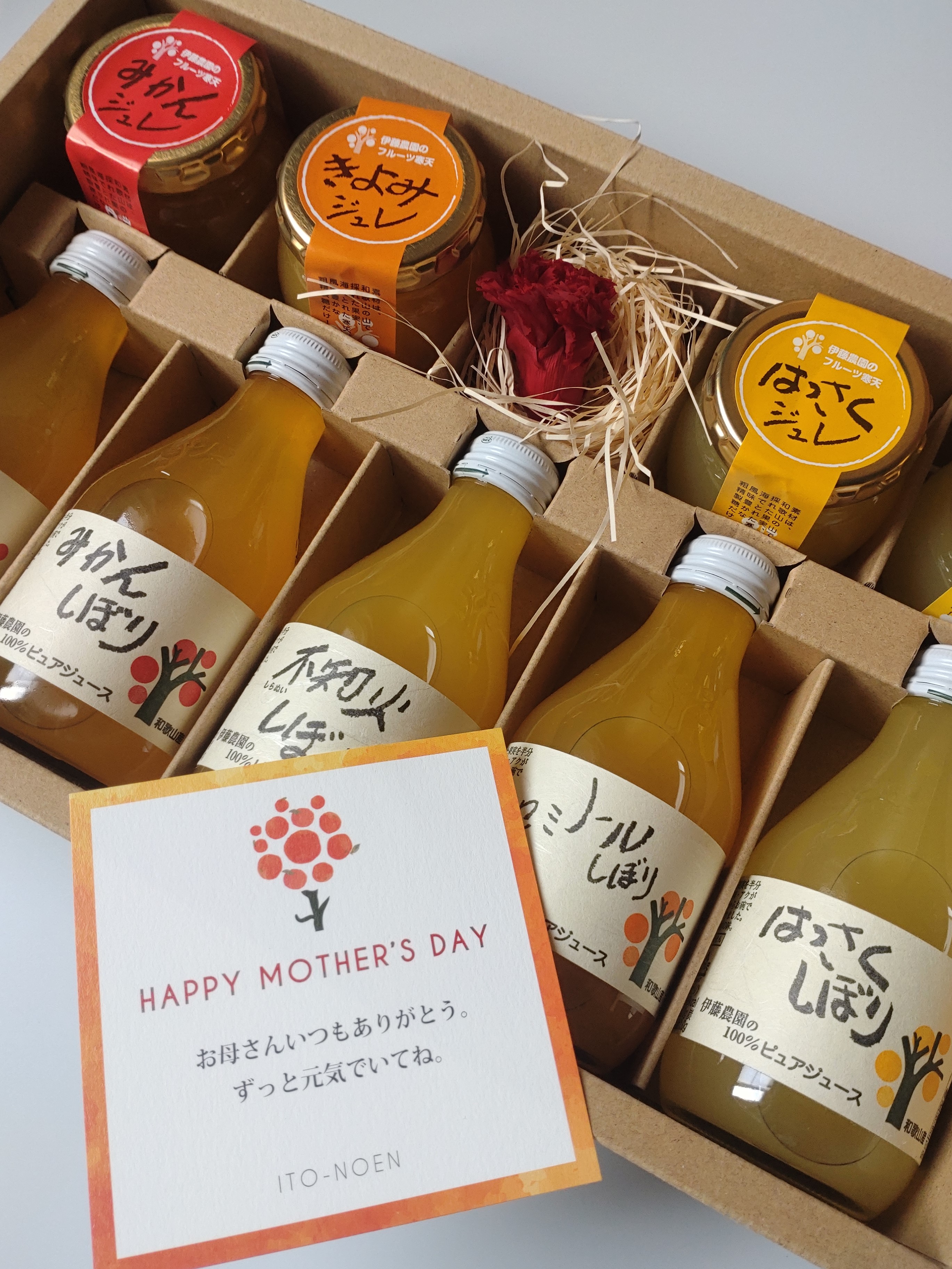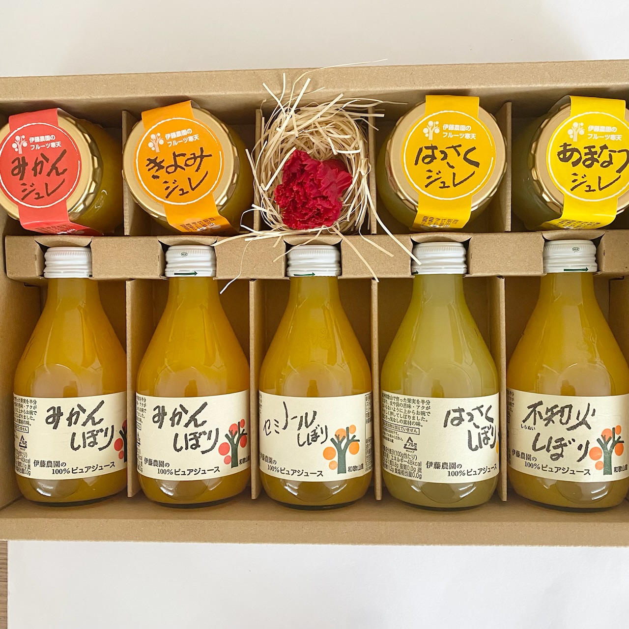 和歌山の農園で育った柑橘類の「100%ピュアジュース&ピュアフルーツ寒天ジュレ」母の日向けセットです。みかん本来の味を楽しめる「100%ピュアジュース」は、無添加100%ストレート果汁。果皮の油脂や雑味を混ぜることなく、美味しいところだけを搾っています。「みかんしぼり」や「はっさくしぼり」など4種セットなので飲み比べも楽しめます。ぷるっぷるっの食感がたまらない「ピュアフルーツ寒天ジュレ」は、不自然さのないすっきりとした後口と、つるっとした食感が特長。こちらも「きよみジュレ」や「あまなつジュレ」など4種の柑橘類を使用しているので異なる味わいが楽しめる商品。母の日限定オリジナル包装・メッセージカード付きで送れるので、ギフトと共に感謝の気持ちを伝えられます。