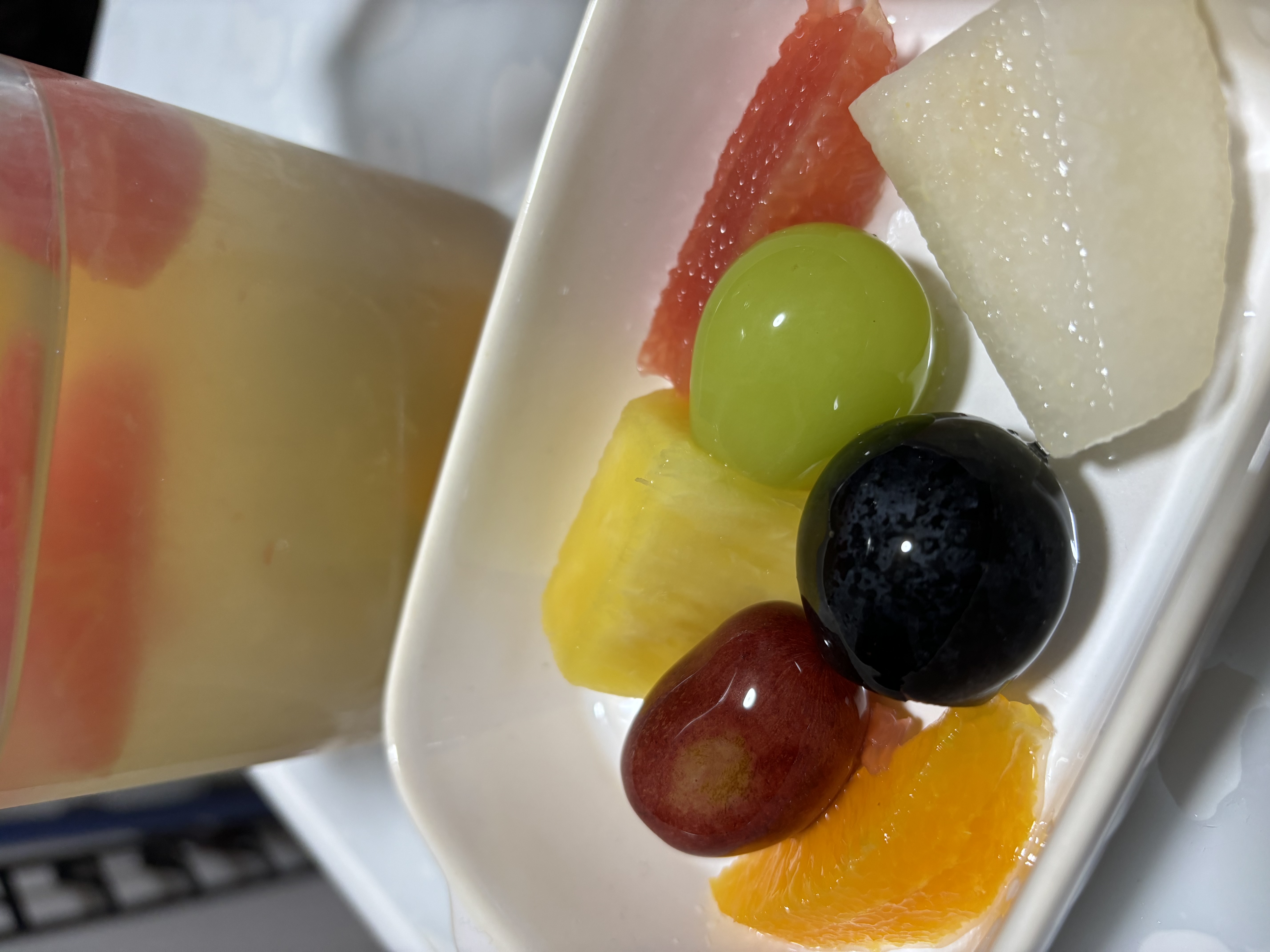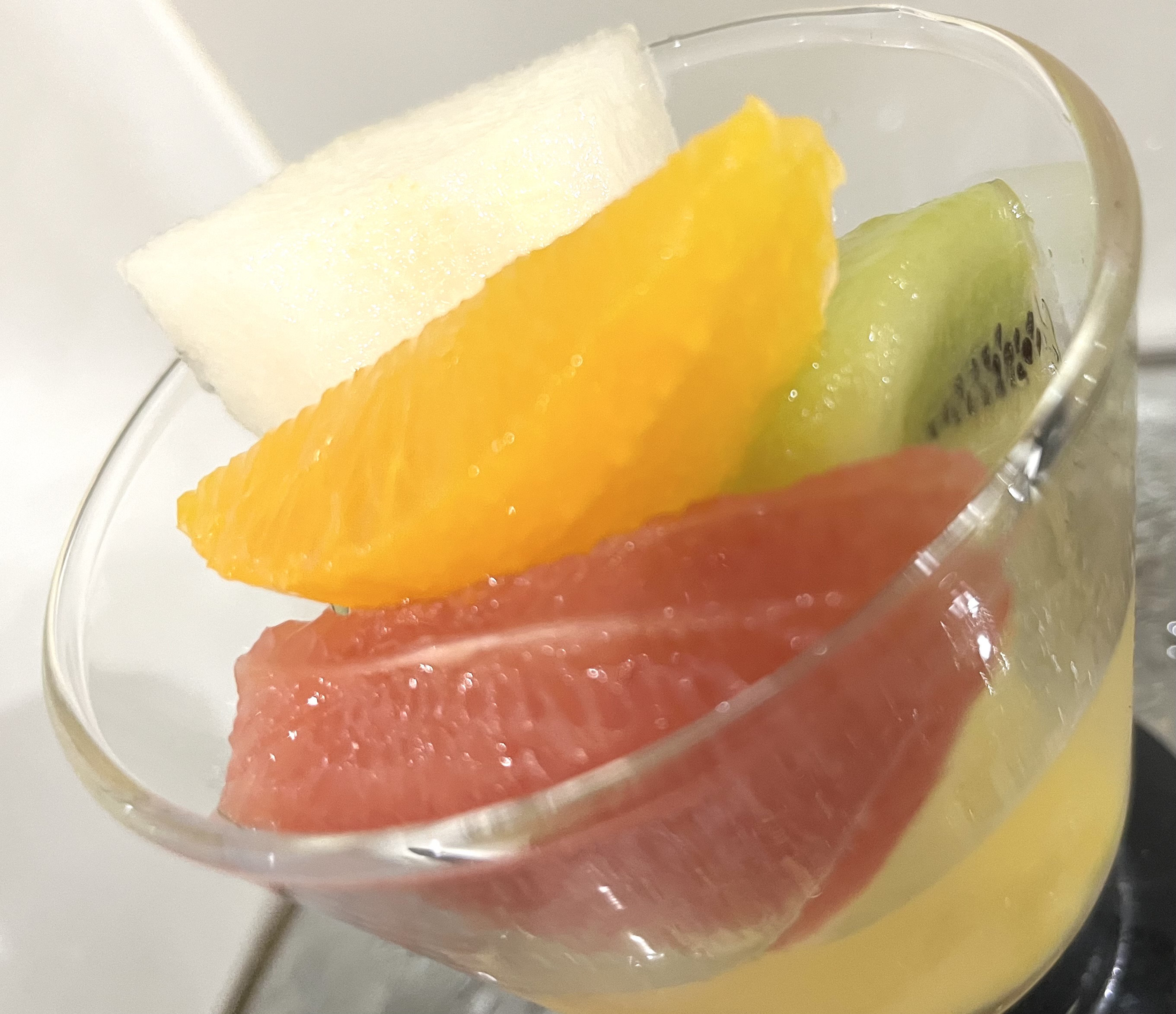 フルーツはどれも驚くほどの鮮度。とくに梨やりんごはシャッキシャキで、こんなに色も食感も落とさず加工できるなんて信じられないレベルです。ブドウは身がパンパンで皮パツパツ、キウイやパイナップルも追熟が進んで柔らかくなっているところなんて一切ありません。それでいて色味を引き立て、酸味のアクセントにもなっているオレンジやグレープフルーツは薄皮が一切気になりません。柿も葡萄も種無しなので、残すところが全くない。