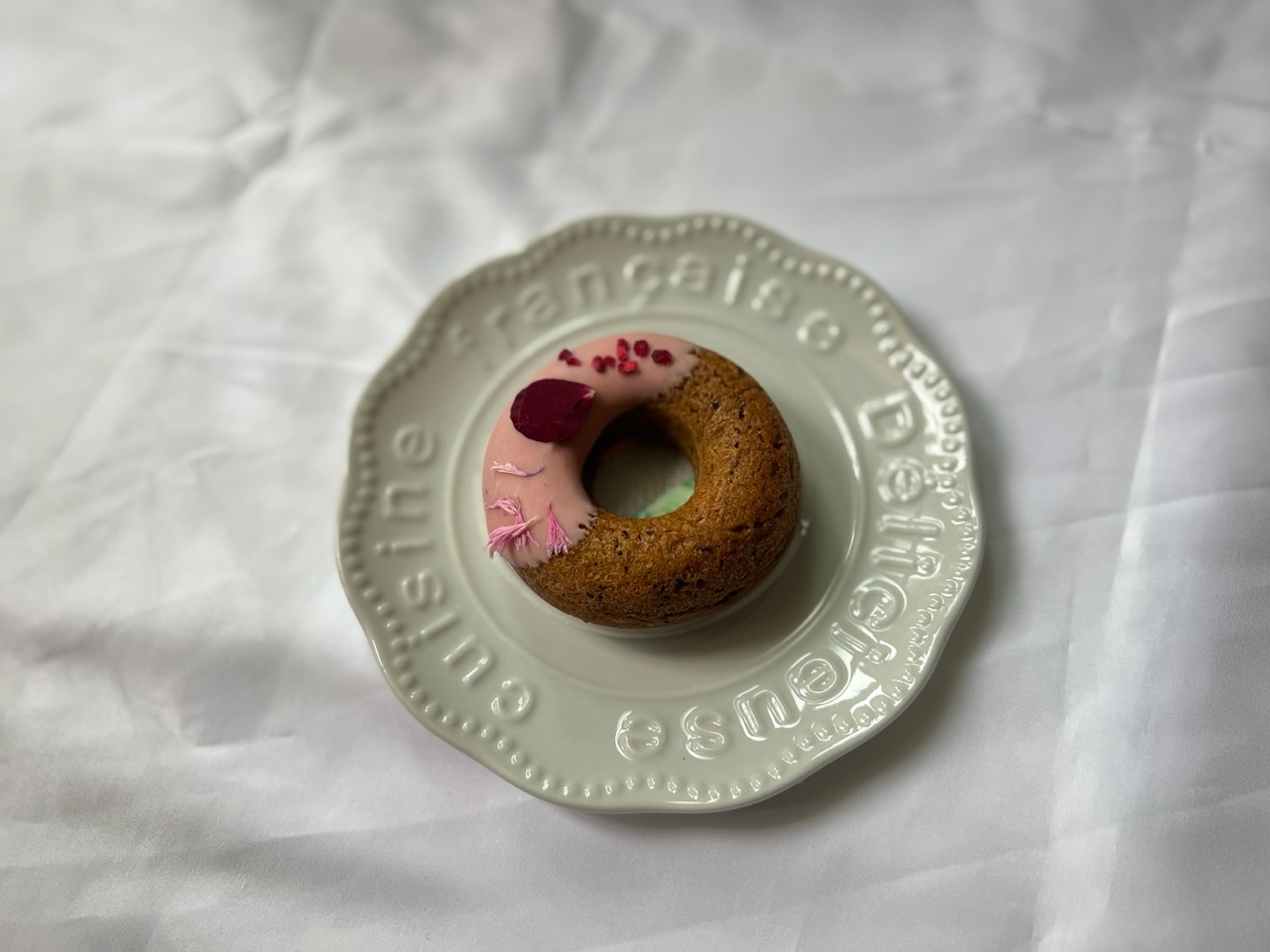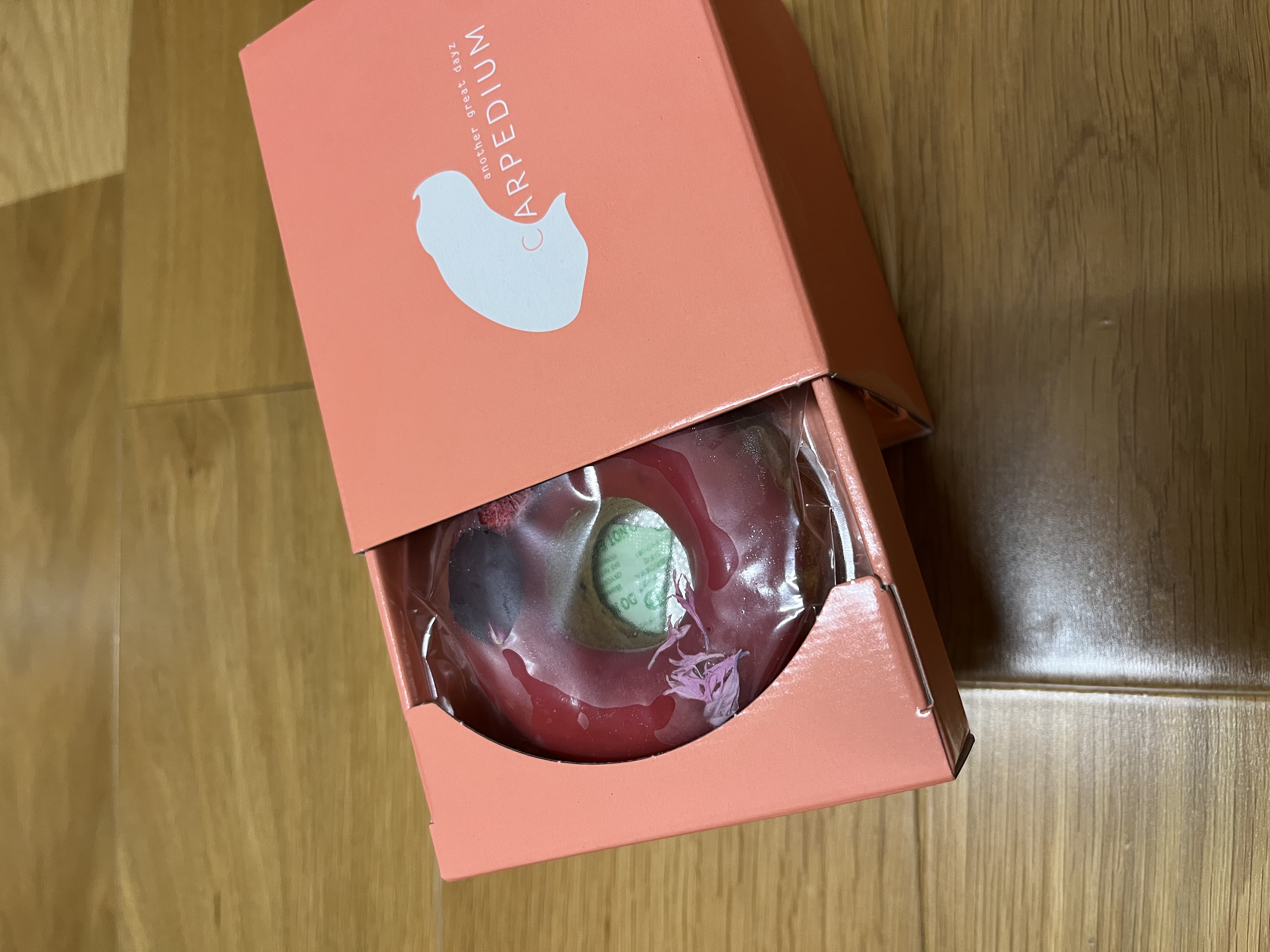 洋酒&ラズベリー味の『優雅な美』は、鮮やかで艶のあるソースと、ピンクのコーンフラワーの繊細な花弁が大人っぽくて上品です。1枚ちょこんと乗ったバラも、当然かもしれませんがちゃんとバラの風味があるんですね。