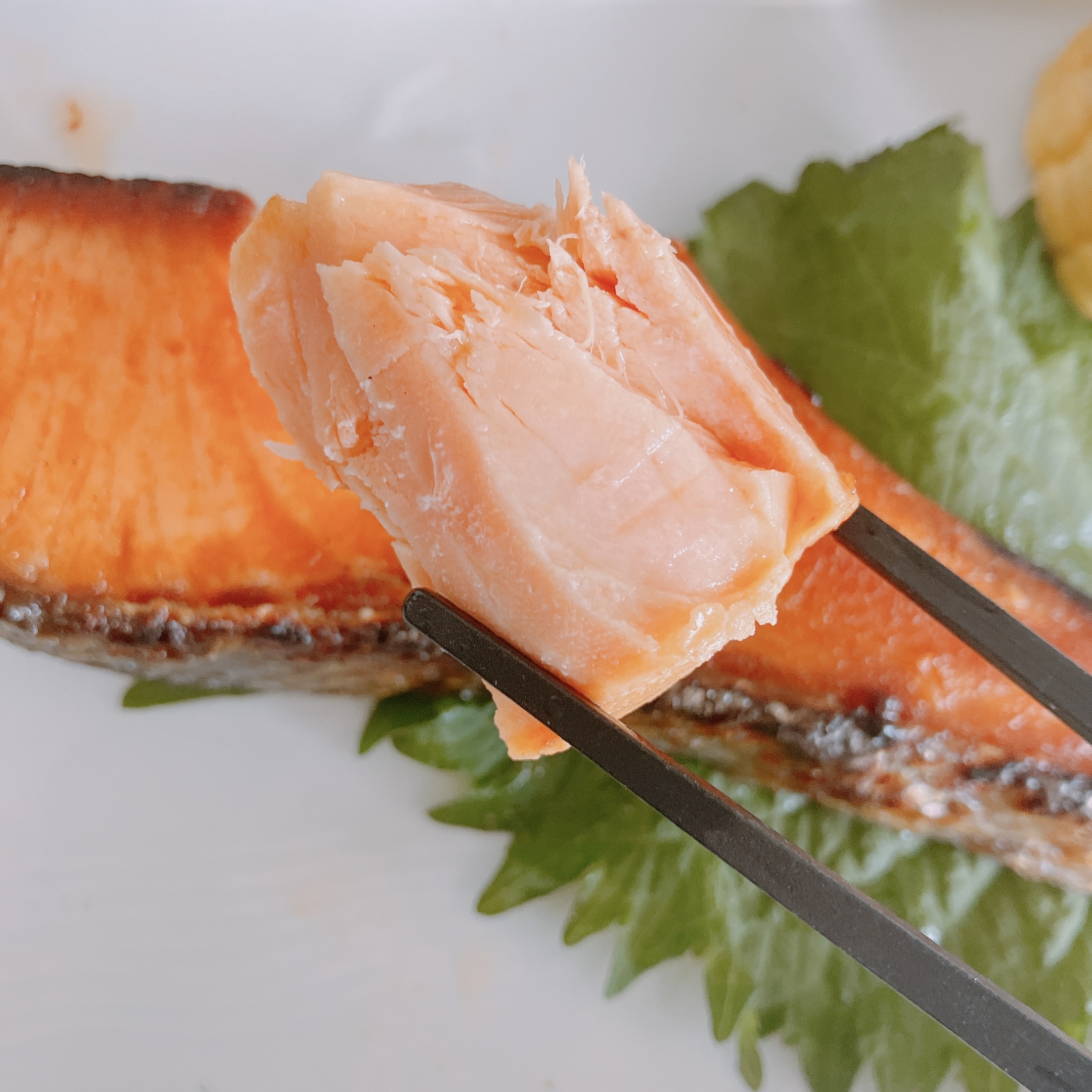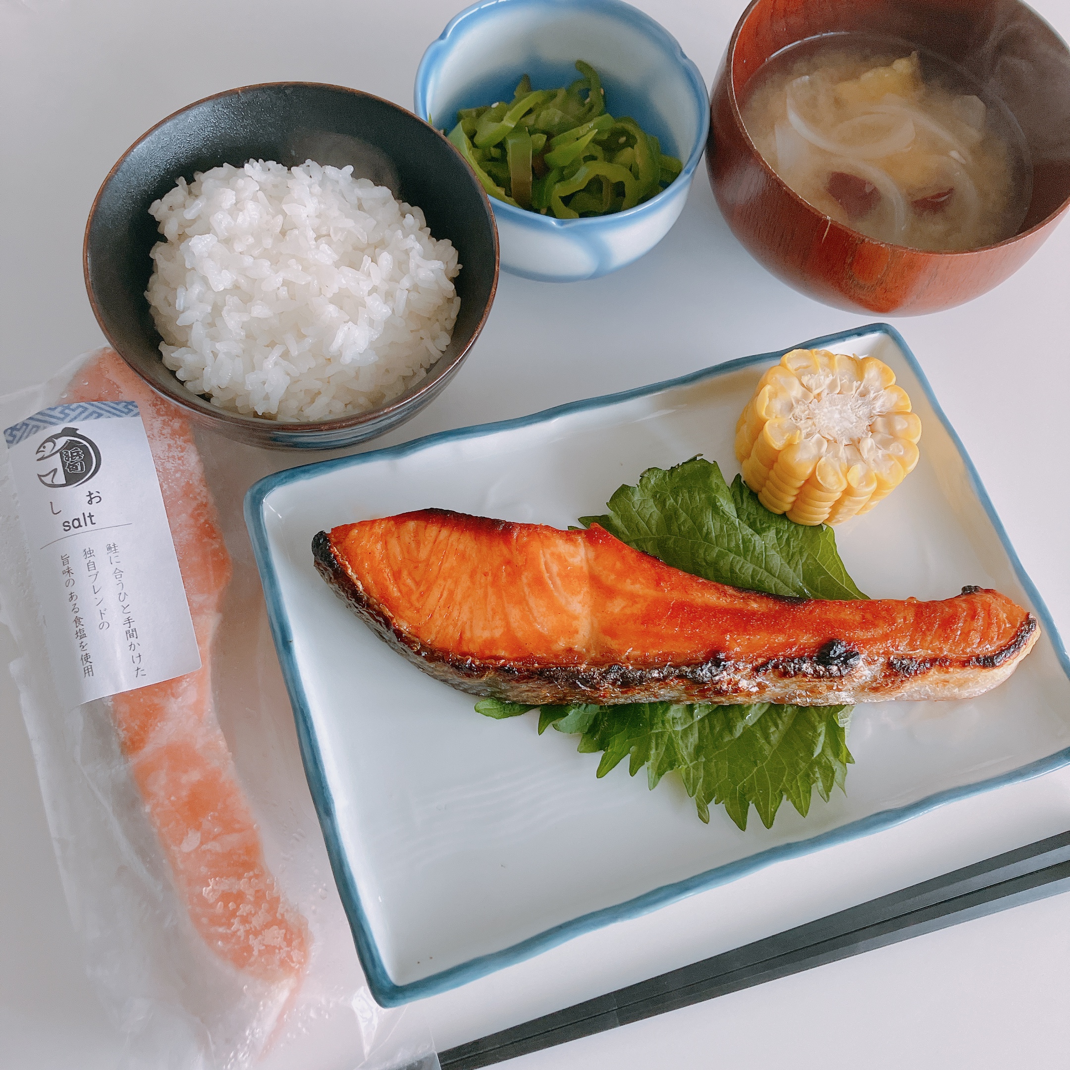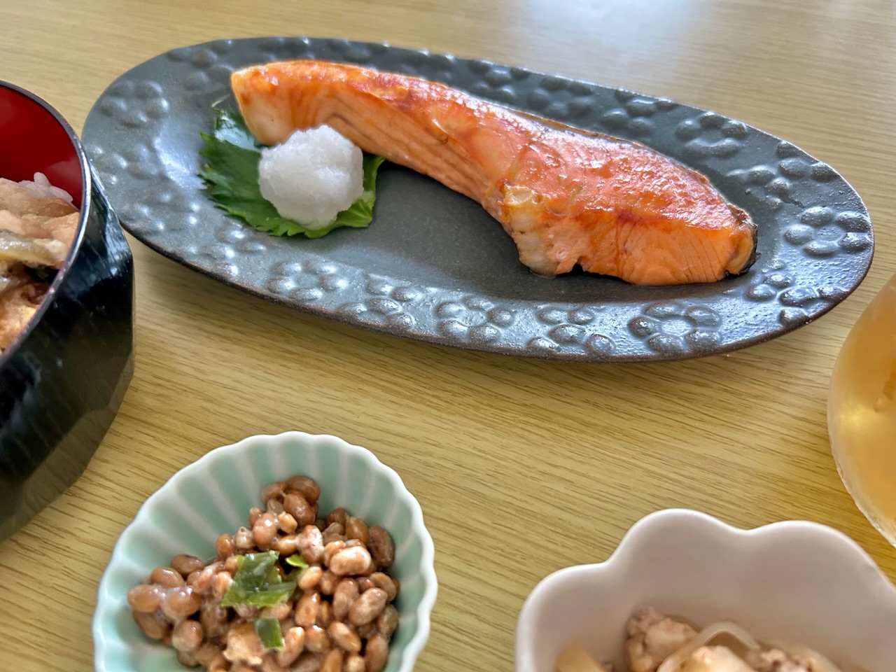 ひと手間かけた旨みのある食塩を感じるために、シンプルに焼き鮭でいただきました。大根おろしを添えて〜