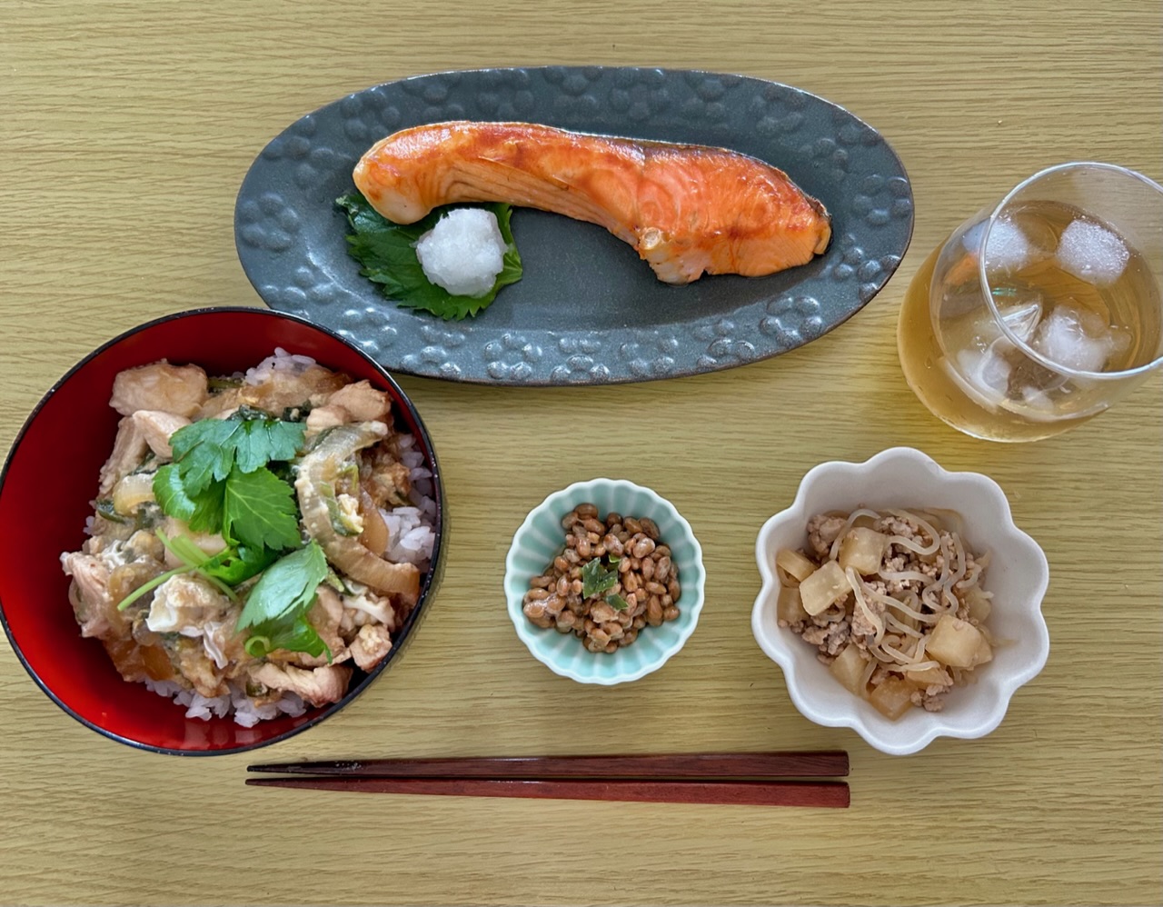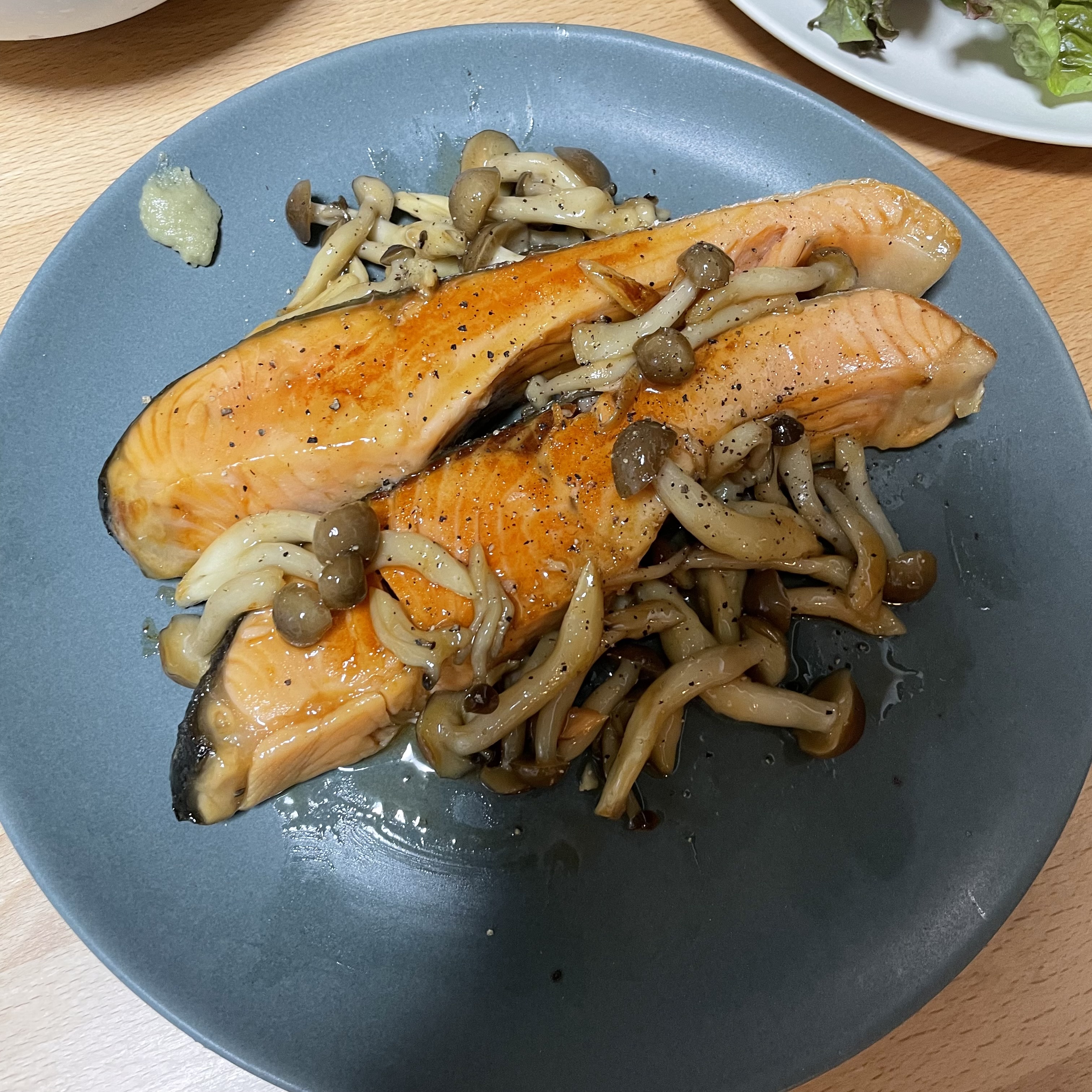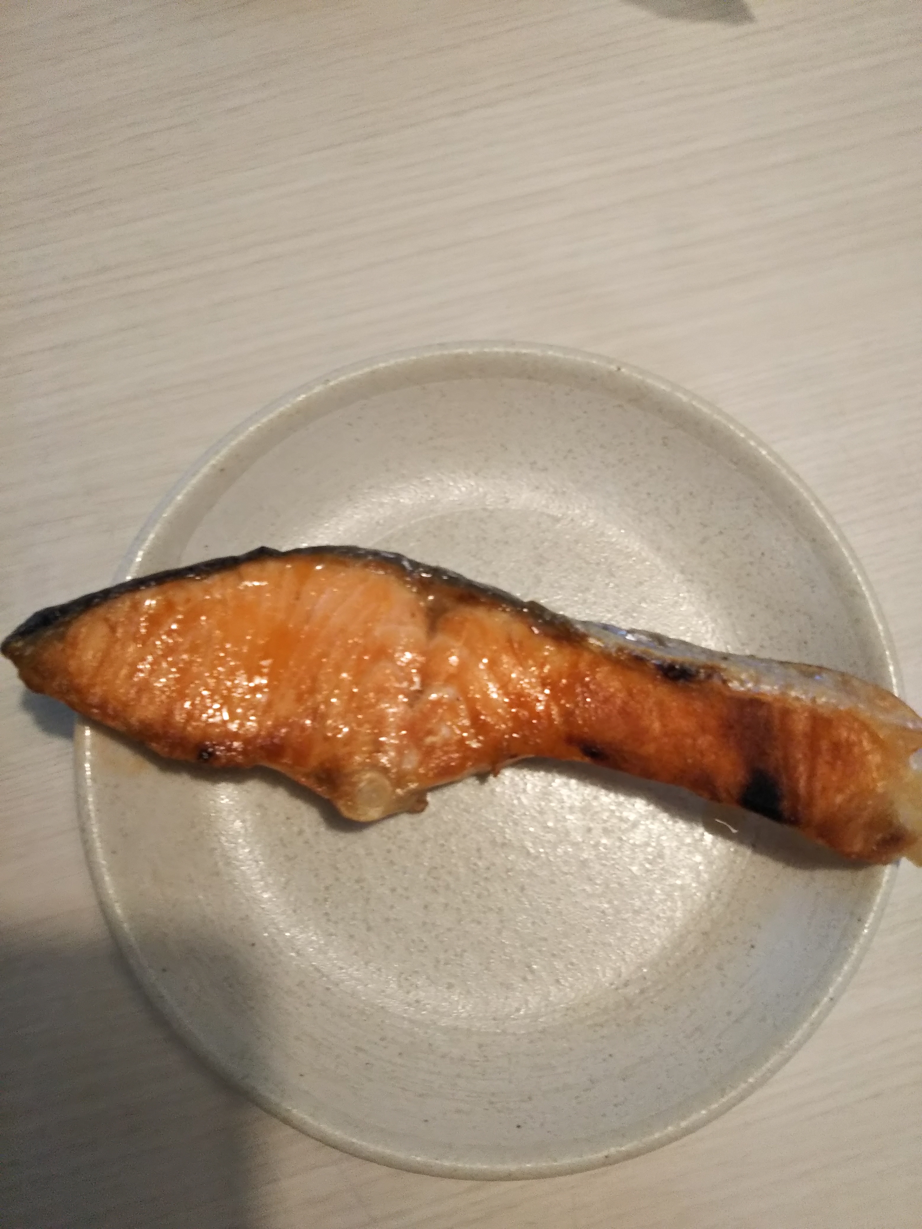 ひと手間かけた旨みのある食塩を感じるために、シンプルに焼き鮭でいただきました。大根おろしを添えて〜