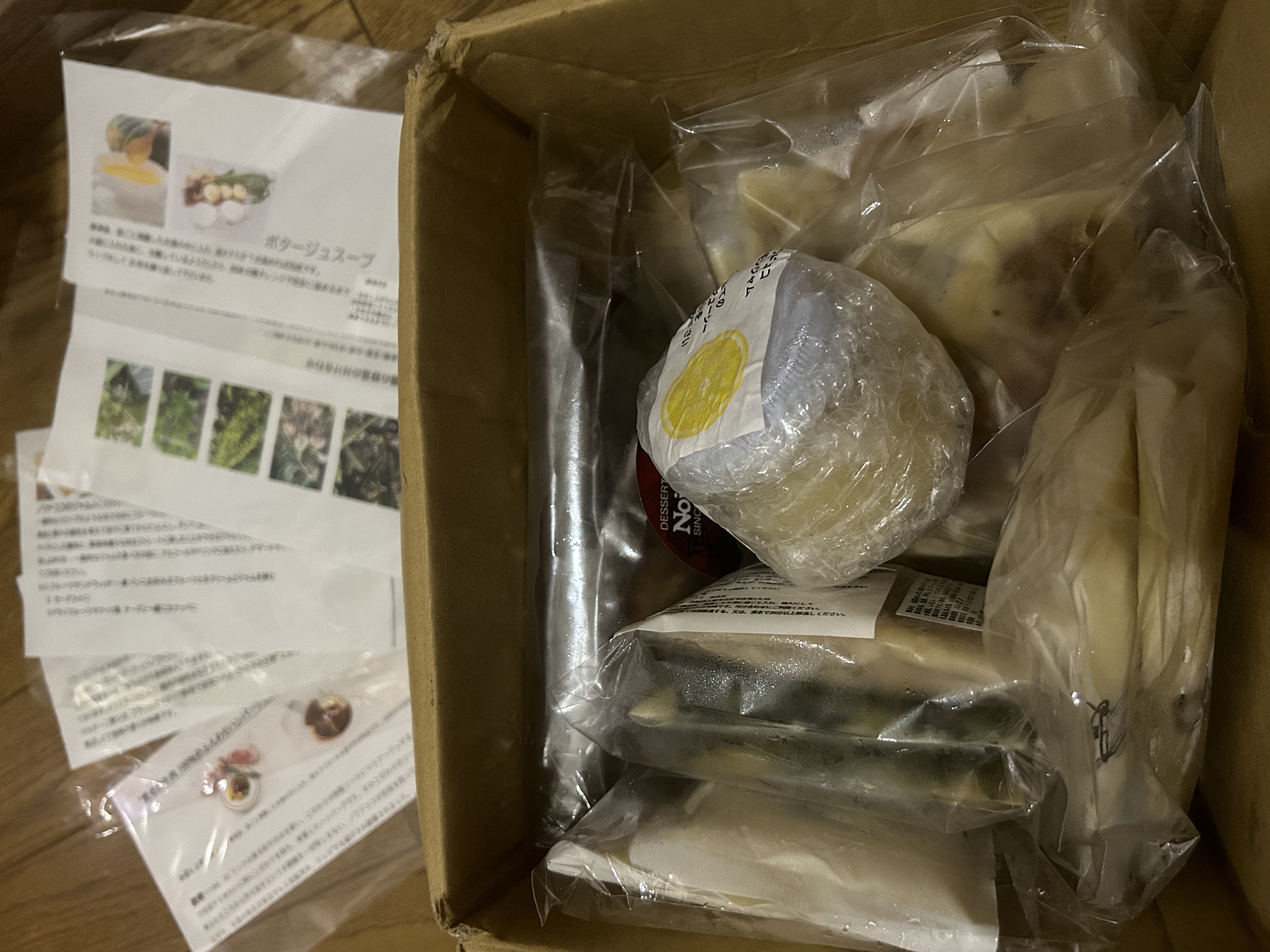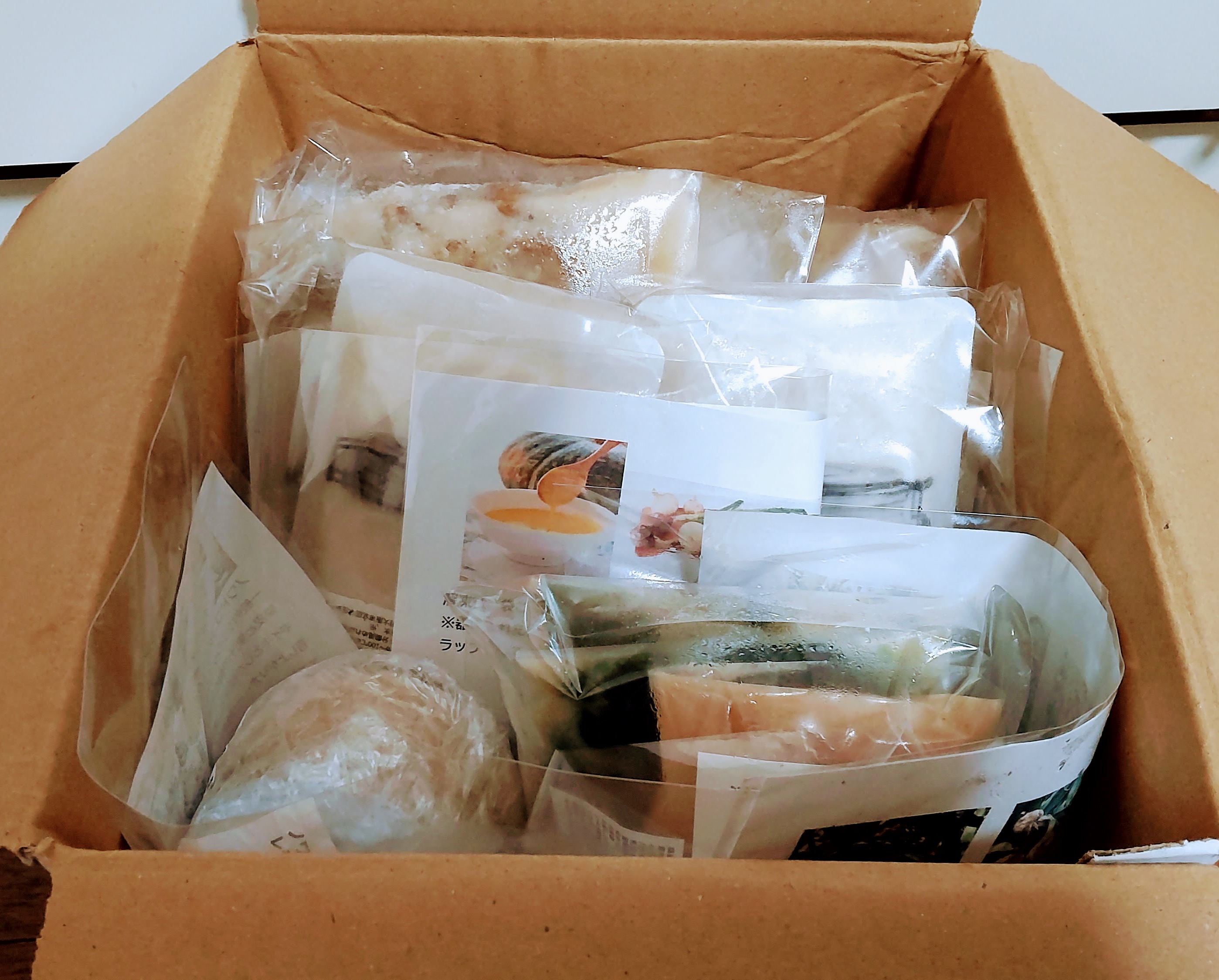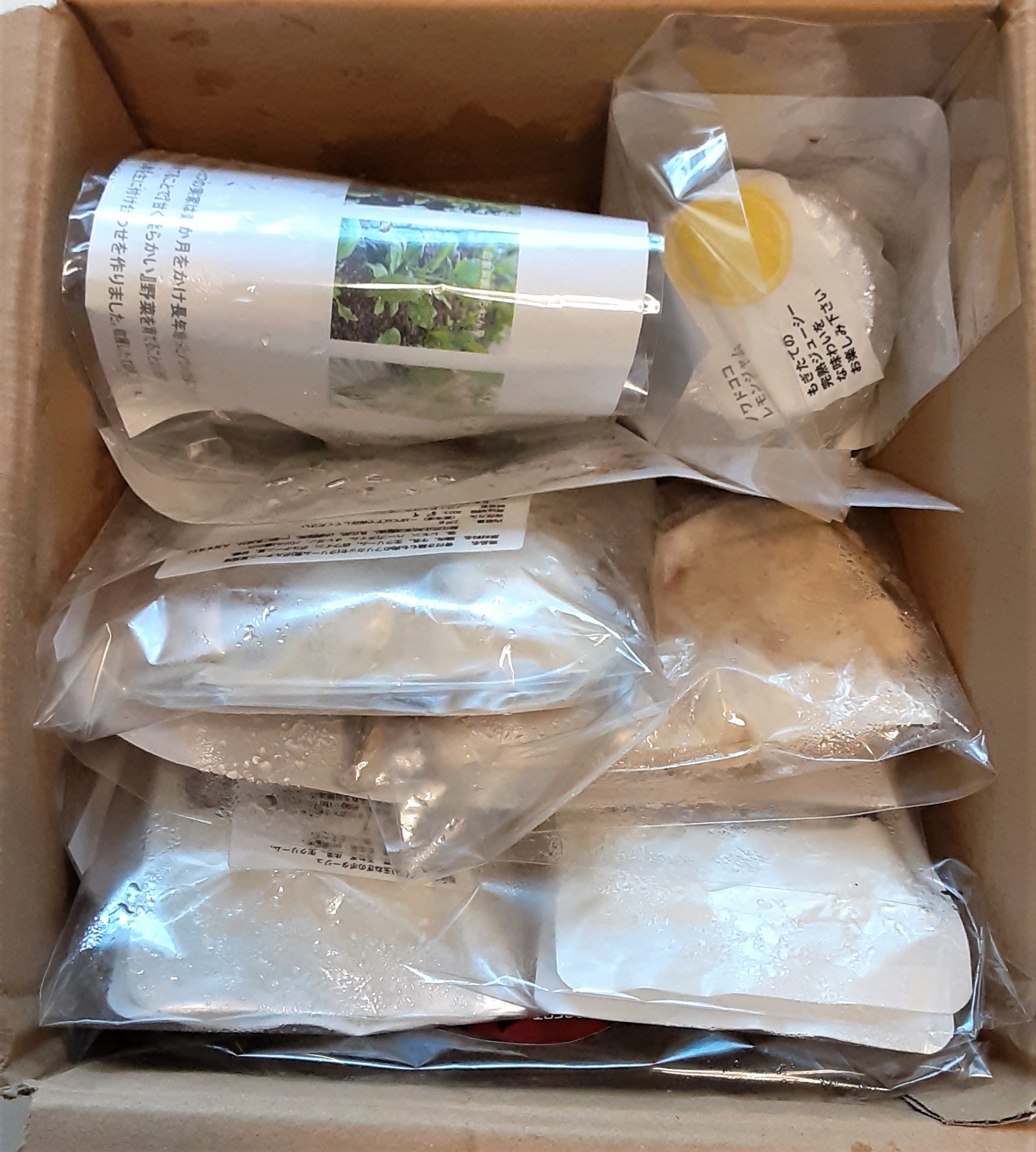 真空パックされてカチカチに凍ったお料理が段ボール箱に詰め合わせになって届きます。瓶入りのレモンジャムはプチプチの緩衝材で丁寧にくるまれています。