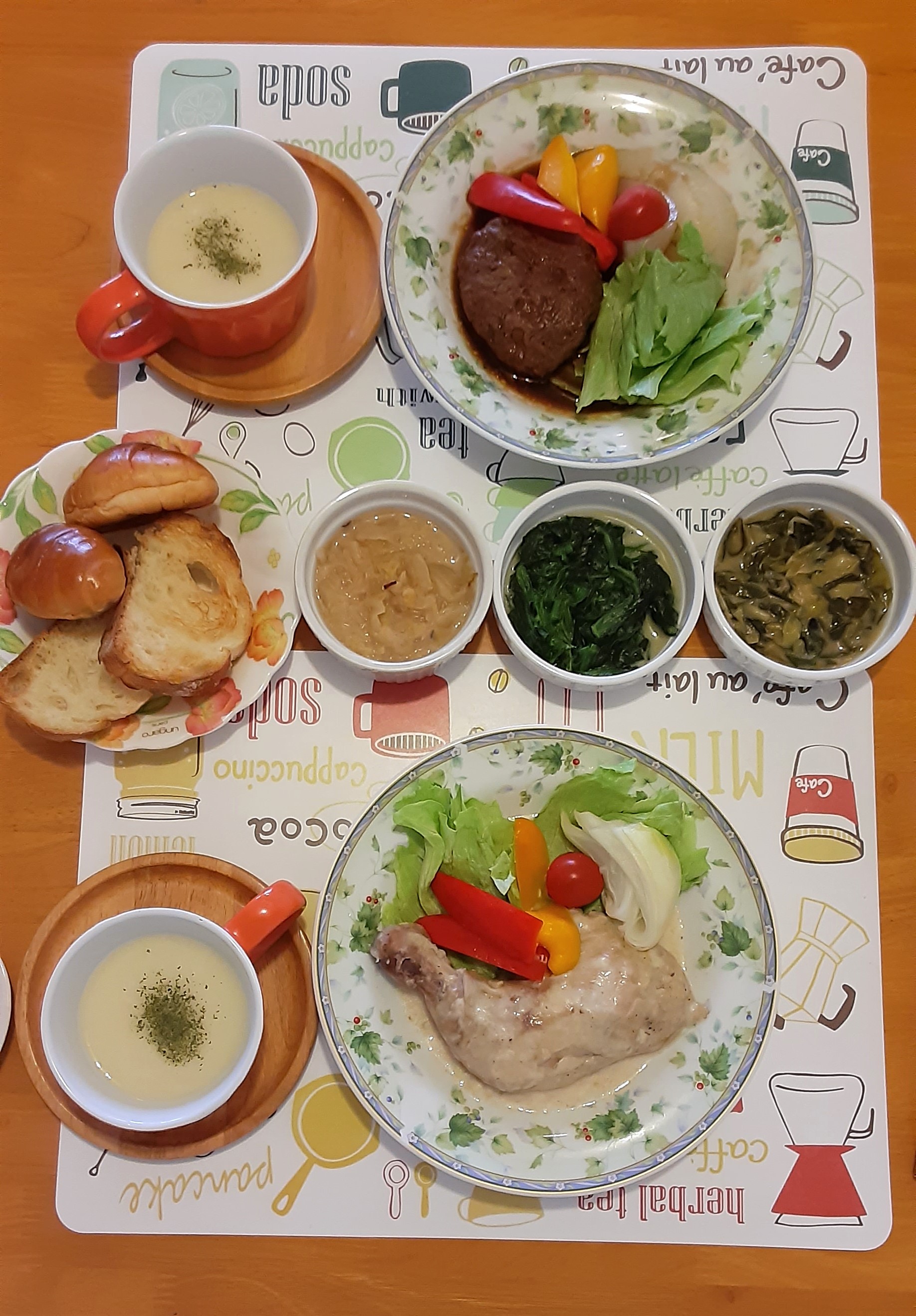 スープ、お肉のメイン料理が2品、野菜の付け合せが3品、デザートに使えるレモンジャムがセットになった豪華な内容です♪