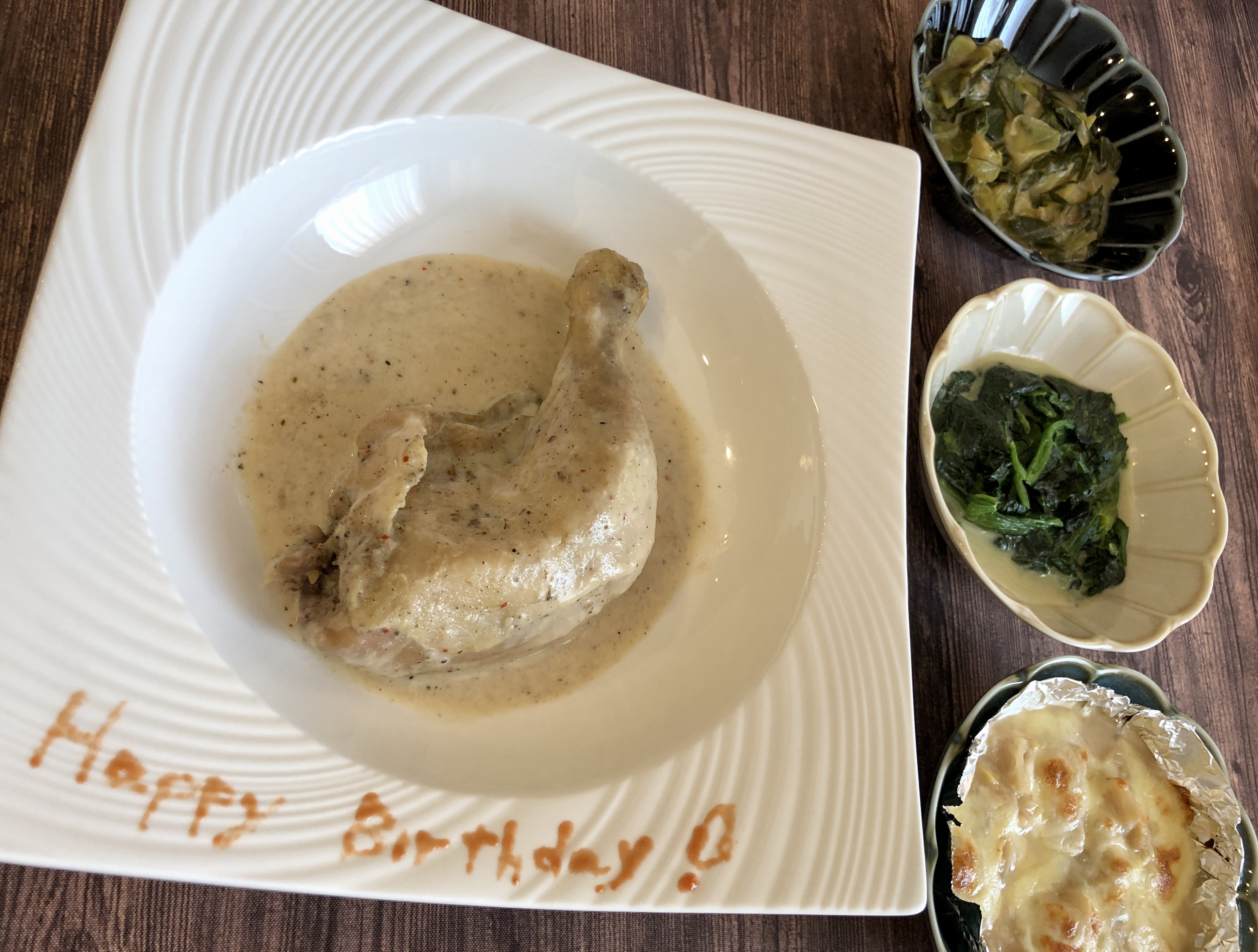 誕生日ディナーの前日に冷蔵庫に移して解凍し、湯煎で温めてそれぞれお皿に盛り付けました。