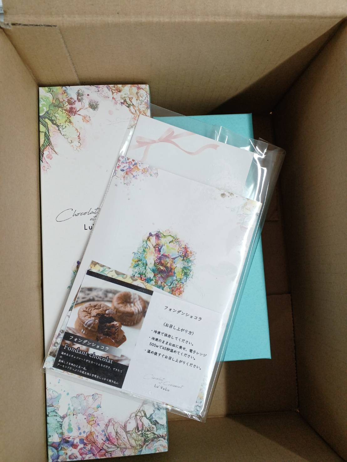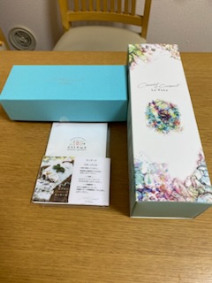 鮮やかな水色、パステル調の花模様の箱が目を惹きます。お店と商品の紹介、各々の食べ方も同封されていました。