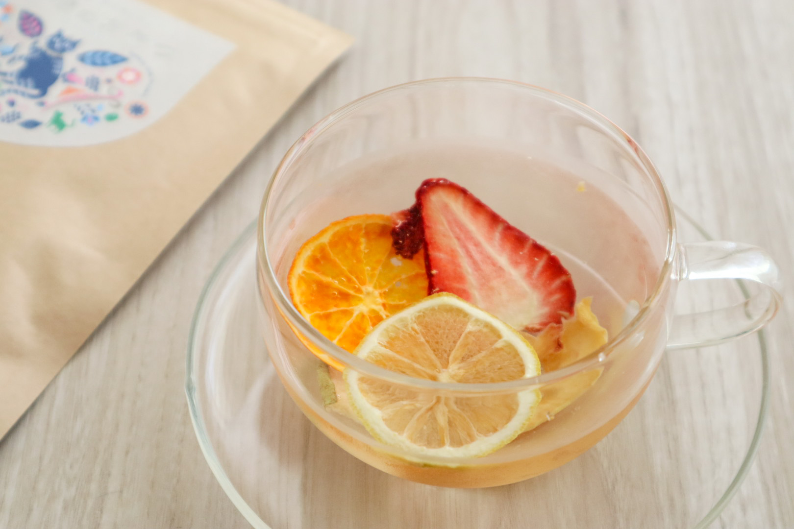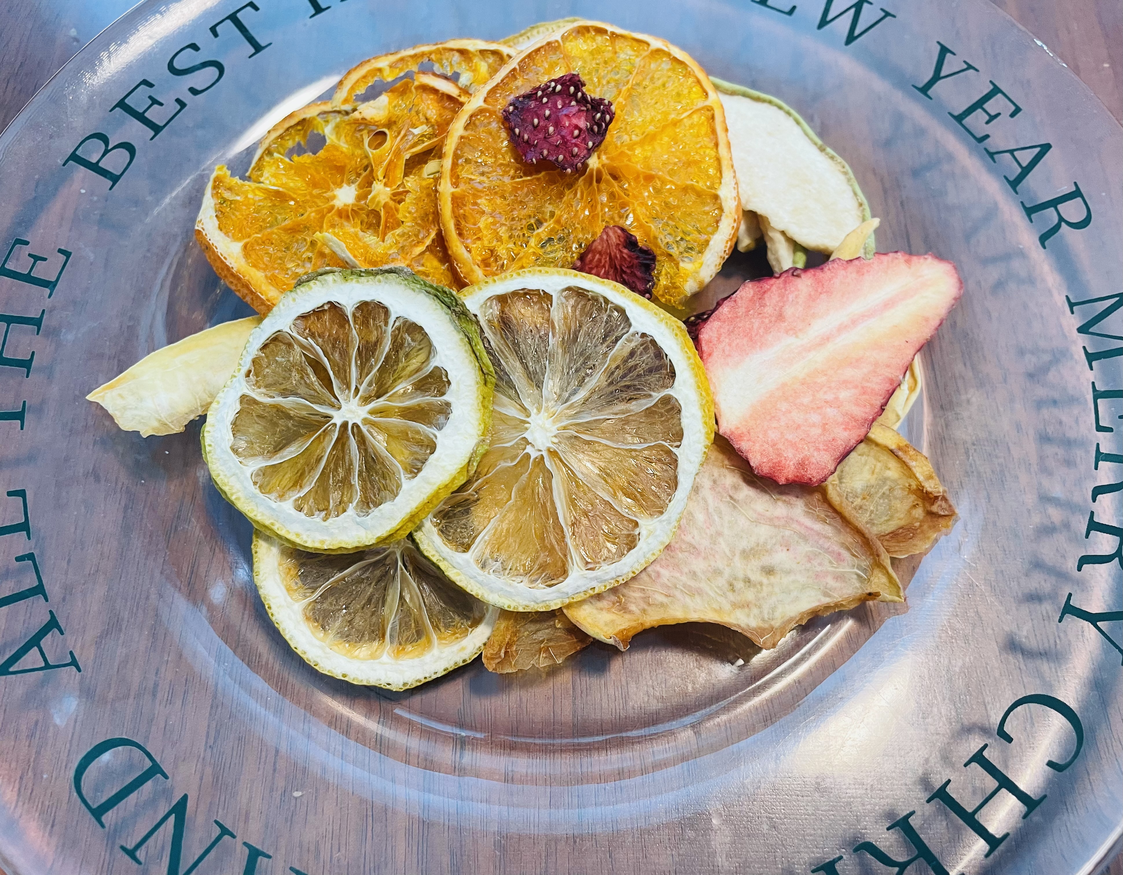 瀬戸内(岡山・広島)産フルーツ5種の半生食感「ドライフルーツ」です。他の商品を制作する過程で生まれた商品なので、形は不揃いであるものの品質は変わりません。そのまま食べるだけでなく、「フォンダンウォーター」として楽しむのがおすすめ。「フォンダンウォーター」とは、韓国発のドリンクで、 ドライフルーツを水の中にいれて浸け込んだ水、または炭酸水のこと。「フードロス削減」にも繋がる商品で1つ1つ形の個性を楽しみながら、ジューシーな半生食感を味わえます。