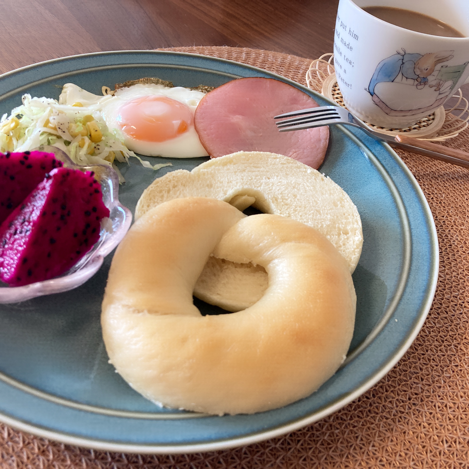 3分の2を頂いたところで、キャベツソテーをベーグルにのせて試しに食べてみました(笑)