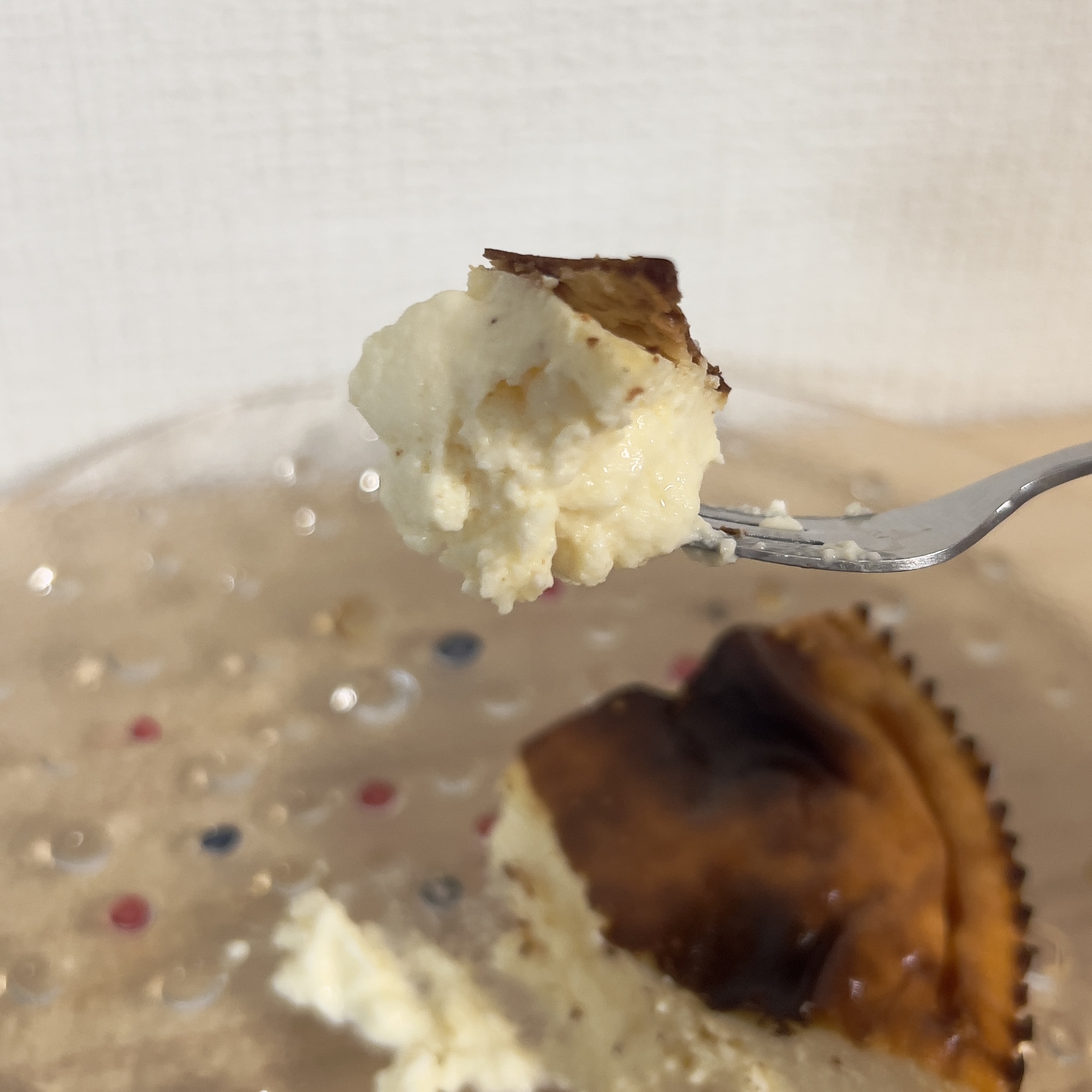 外側の薄い層は少し固めのテクスチャでとても柔らかいパイ生地のようでした。きつね色の部分はキャラメリゼのような甘さを感じました。対して内側は、想像以上の柔らかさと滑らかさが見た目だけでも分かりました。口溶けのよさが、優しいクリームチーズの旨味をより一層ひきたてていました。これぞバスクチーズケーキだと。またザラつきも一切感じず、滑らかプリンのようなクリーミーな仕上がりに感動しました。