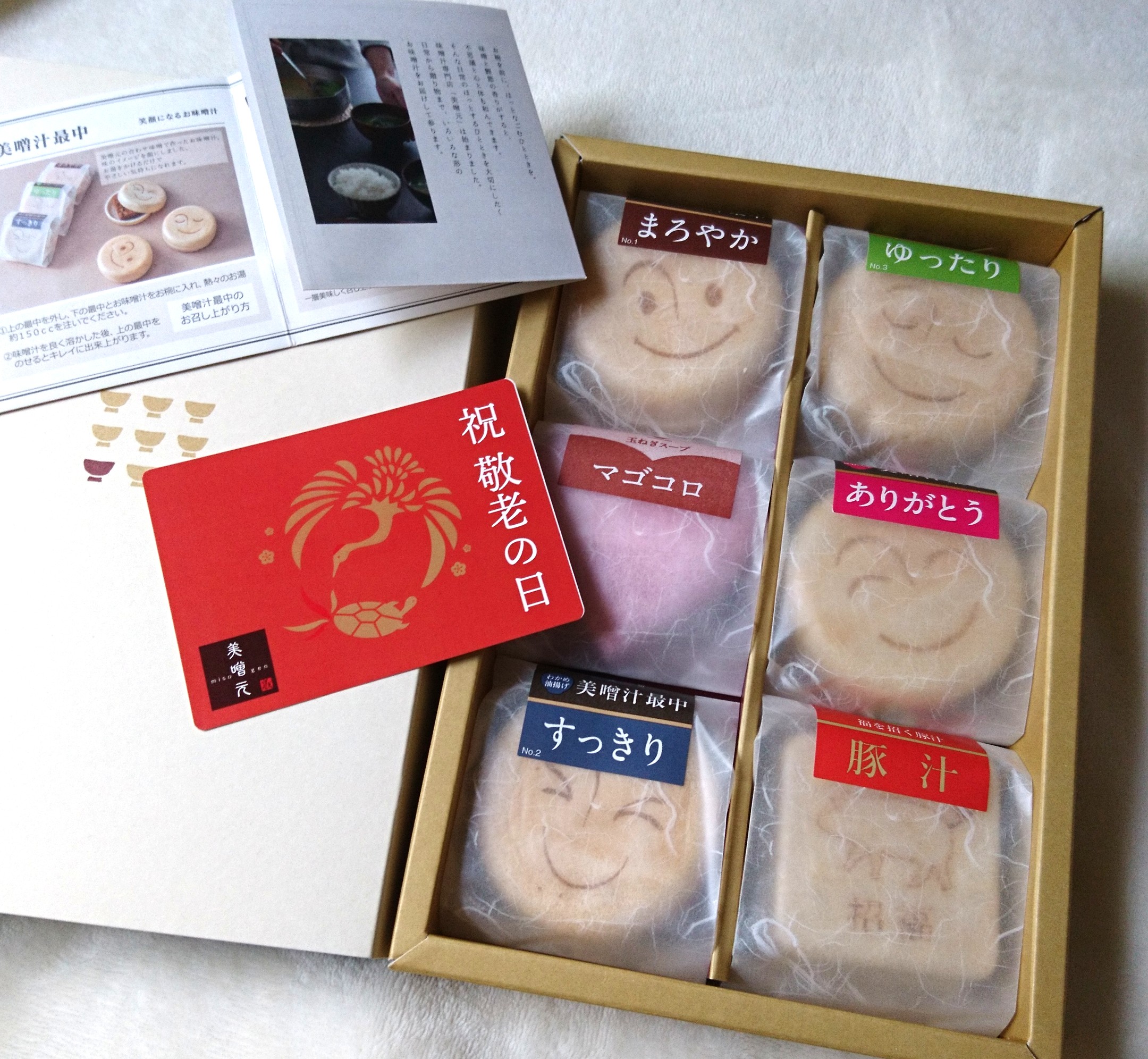 最中の表情に癒される、敬老の日向け「味噌汁最中」です。豆腐となめこ入りの「まろやか」は、信州味噌をベースに讃岐白味噌をブレンド。わかめと油揚げ入りの「すっきり」は、信州味噌をベースに三河八丁味噌をブレンド。ほうれん草と油揚げ入りの「ゆったり」は、愛媛麦味噌をベースに信州味噌をブレンド。具材や味噌の種類が異なる6種の味噌汁を楽しめます。お湯を注ぐだけで手軽に飲めるので、親や祖父母など、家族のいる人にも、独り暮らしの人にもとても喜ばれます。期間限定で、鶴と亀がデザインされた掛け紙とメッセージカードが添えられて届くので、敬老の日の贈り物におすすめです。