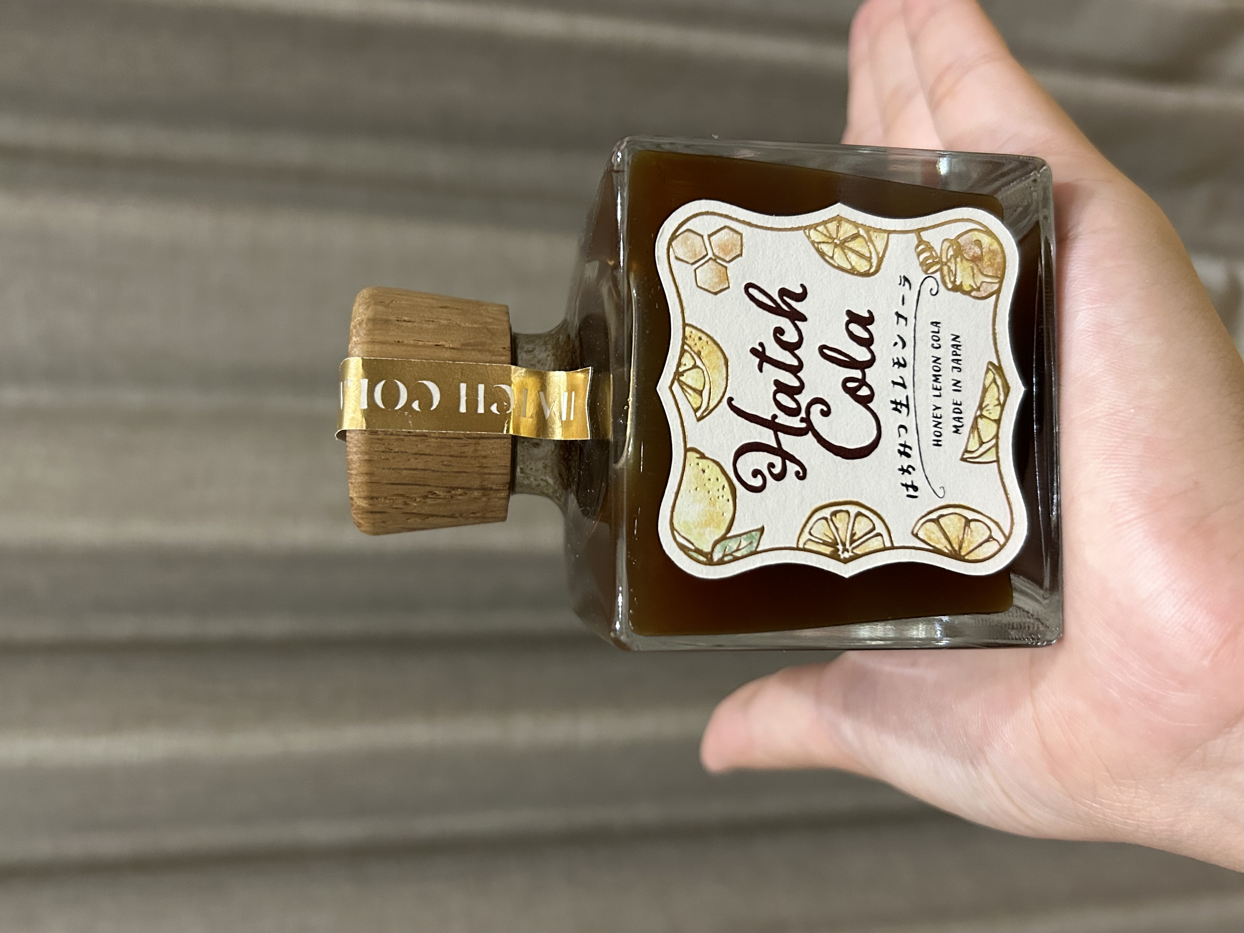 緩衝材を剥がすと、ひと目見るなり「うわぁ~☆」となり、そのデザインにグッと魅了されますね。インク瓶のような立方体のボトルが珍しくて、キャップは天然木なんだもの。差し色で使われたゴールドが効果的なデザインで素敵すぎる!視界に入るたび、手に取るたびに気分を上げてくれます。こういう雰囲気のクラフトコーラ(シロップ)は他にないんじゃないかな。