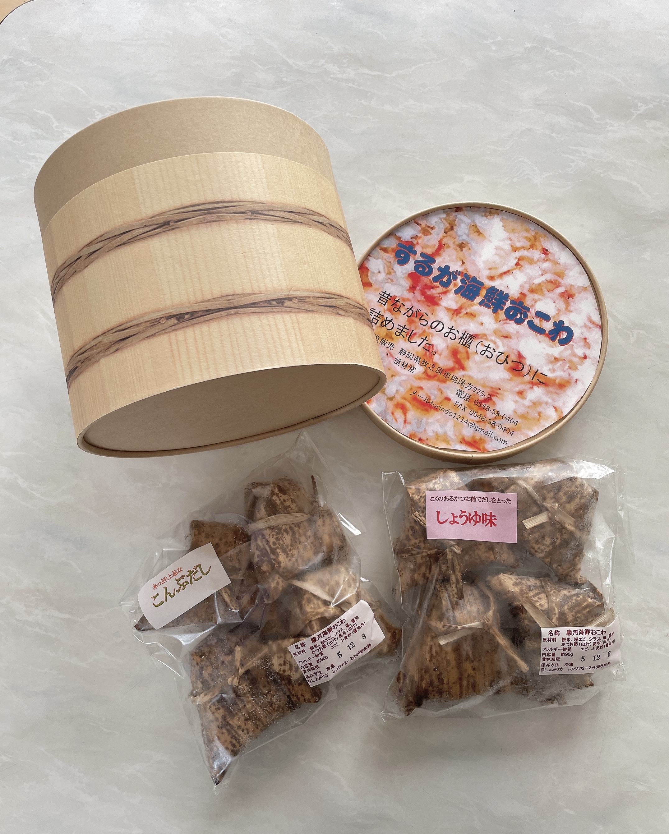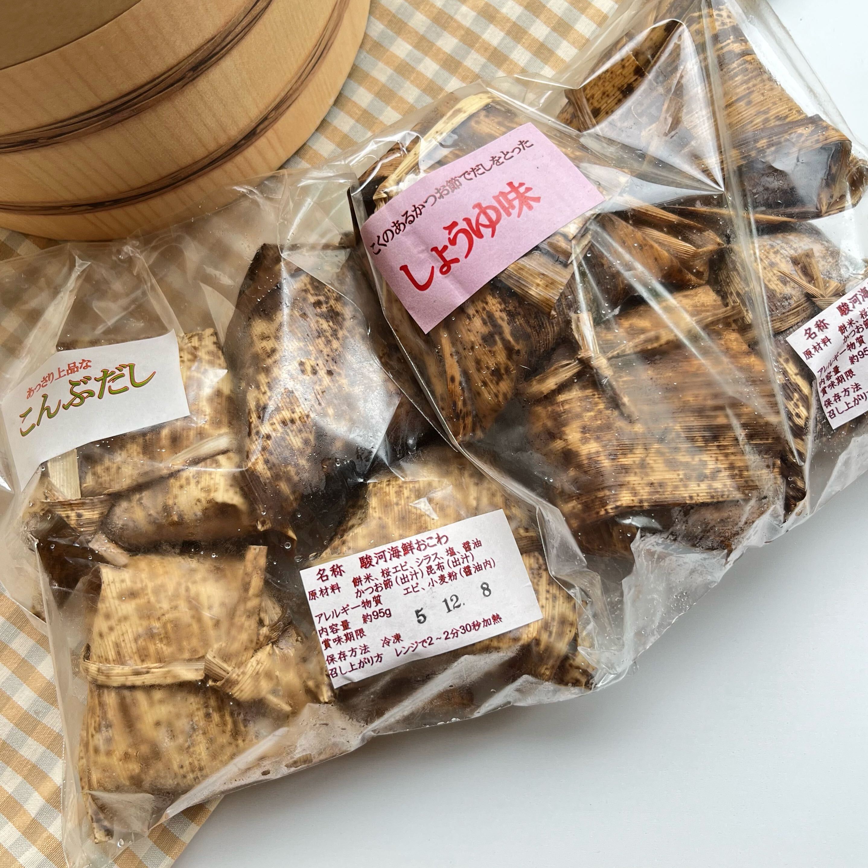 桜エビ・しらす・相良塩・かつお出汁・昆布出汁で作られ、郷土の豊かな海の恵みが楽しめるこちらの商品。口いっぱいに広がる風味や味わいは駿河湾からの贈り物!素材の良さを活かした上品な「昆布だし」と、コクがあって親しみのある「醤油味」のセットは魅力があります。桃林堂さんの「駿河海鮮おこわ」は派手ではないけれど、しみじみ美味しい「ご当地おこわ」ですね。