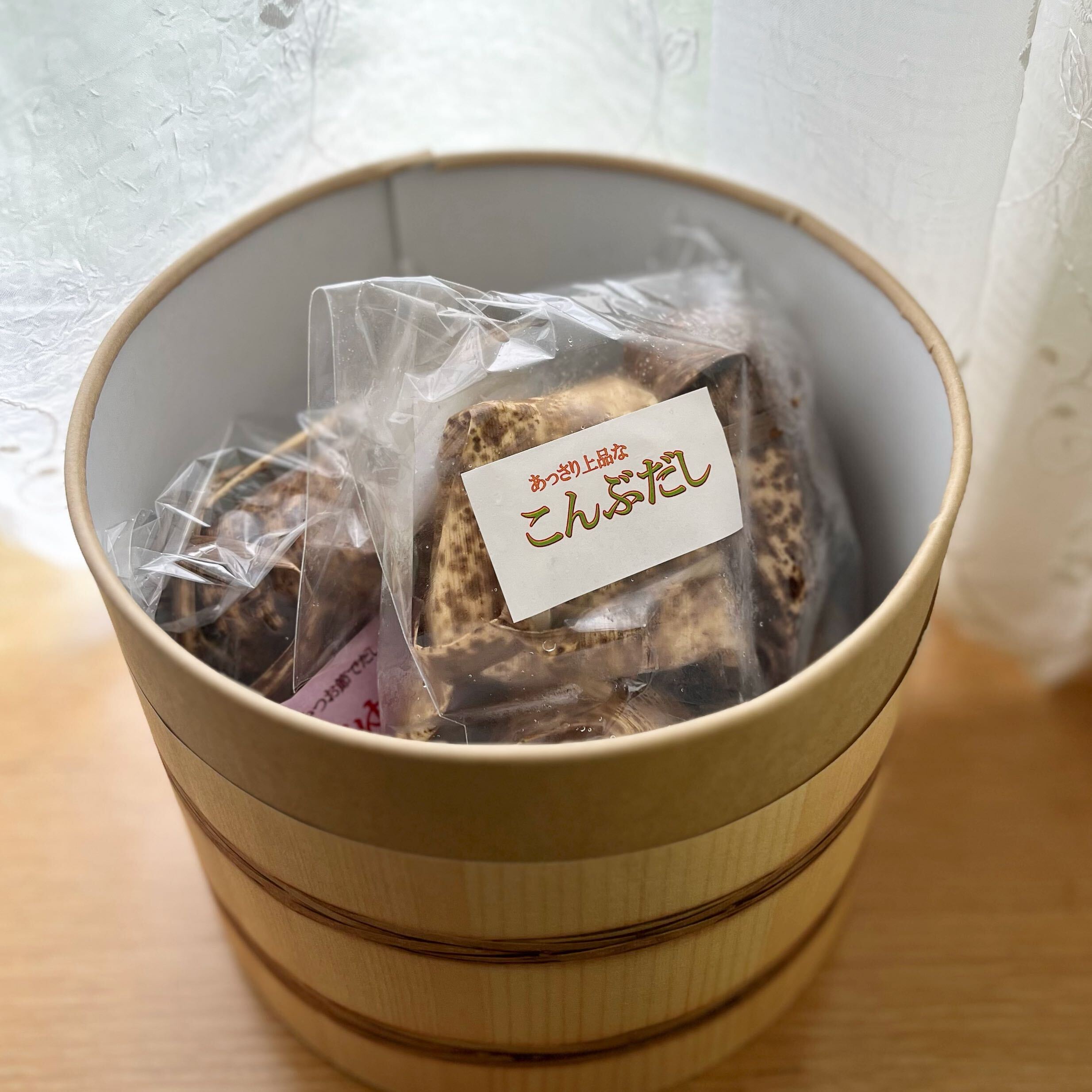 冷凍便が届き、ダンボールを開けると中から「おひつ」が出てきてビックリ。円柱型のギフトボックス(紙製)をおひつデザインにしたものですが、雰囲気があって気分が上がりますね。おひつには「昆布だし」と「醤油味」の2袋入り。おこわのひとつずつは竹皮に包まれています。