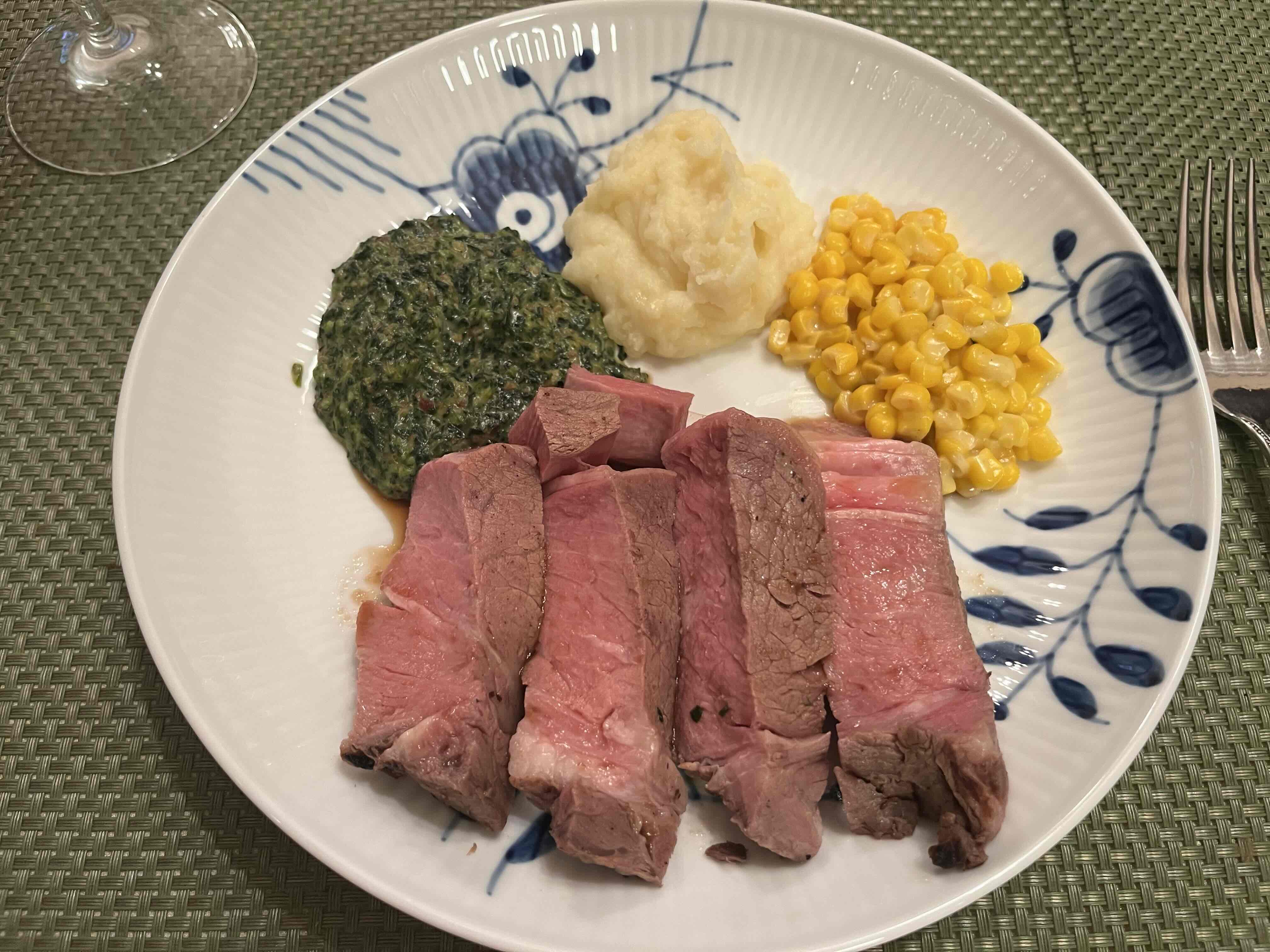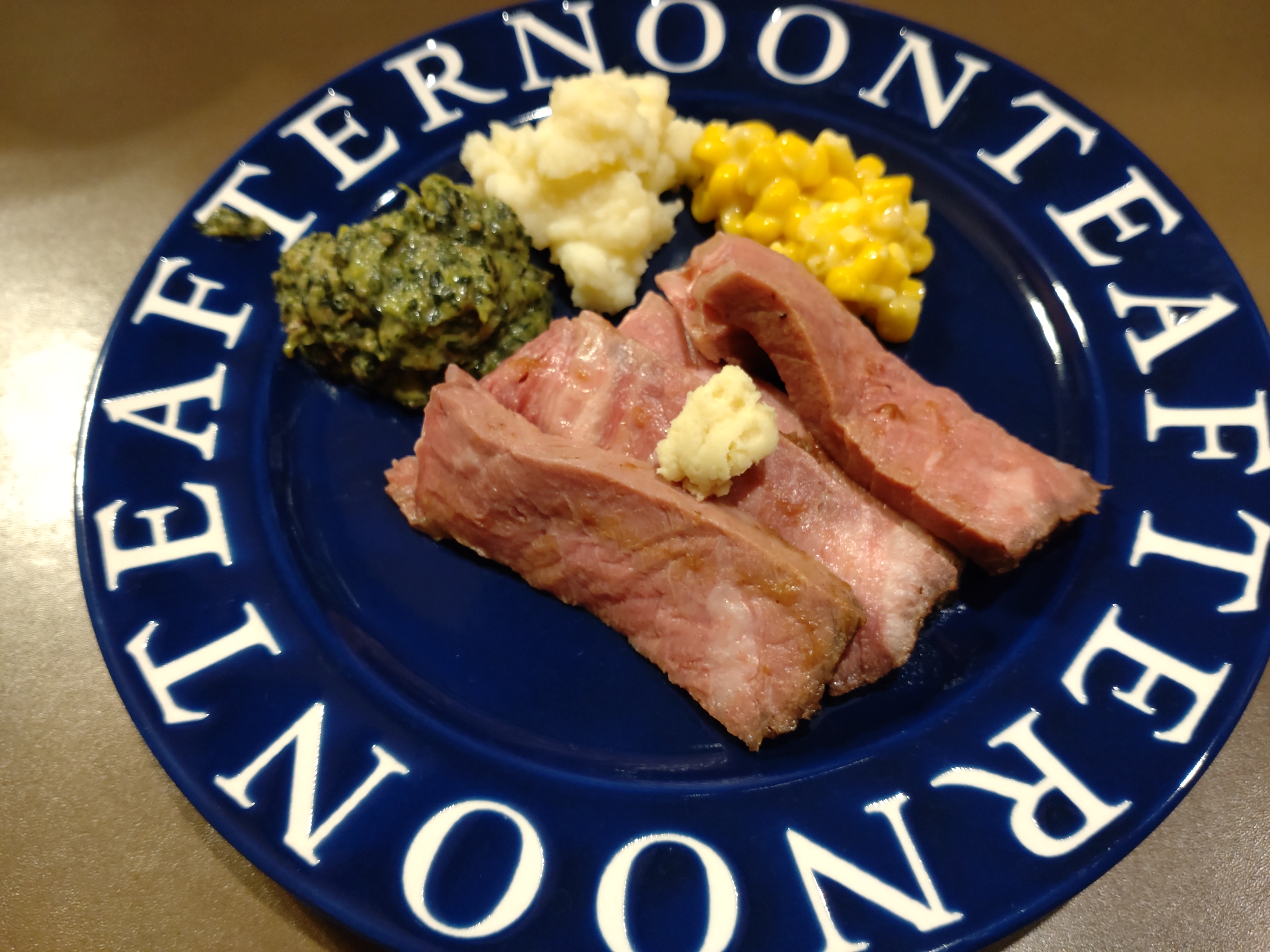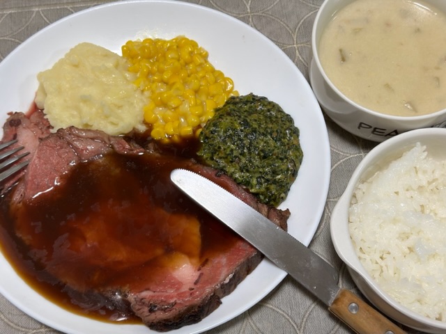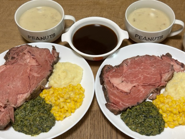 50℃の湯煎で20分という、何でもレンチンの時代にはやや手間のかかる調理法ですが、この時間さえもスパイスの一種。皿の上にプライムリブとアカンパニメンツが揃った時の眼福も味わいの大切な要素です。