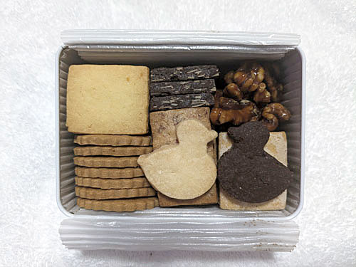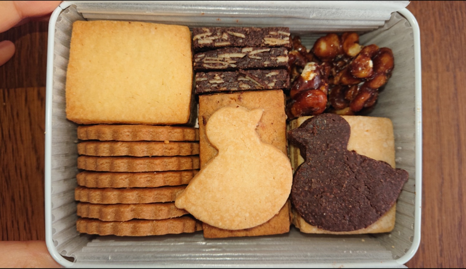 綺麗な色合いのクッキー缶入り「クッキー詰め合わせ」です。シンプルなバタークッキーから、スパイスやナッツ、ドライフルーツが入ったクッキーまで、様々な味、食感が楽しめるます。8種類のクッキーの他、口直しにはクルミのキャラメリゼ。ほろ苦さがアクセントとなり、次から次へとクッキーに手が伸びてしまうこと間違いありません。シンプルな白地の缶には、オリジナルデザインの帯をあしらっています。ご褒美おやつとしてや、手土産スイーツとしてもおすすめです。
