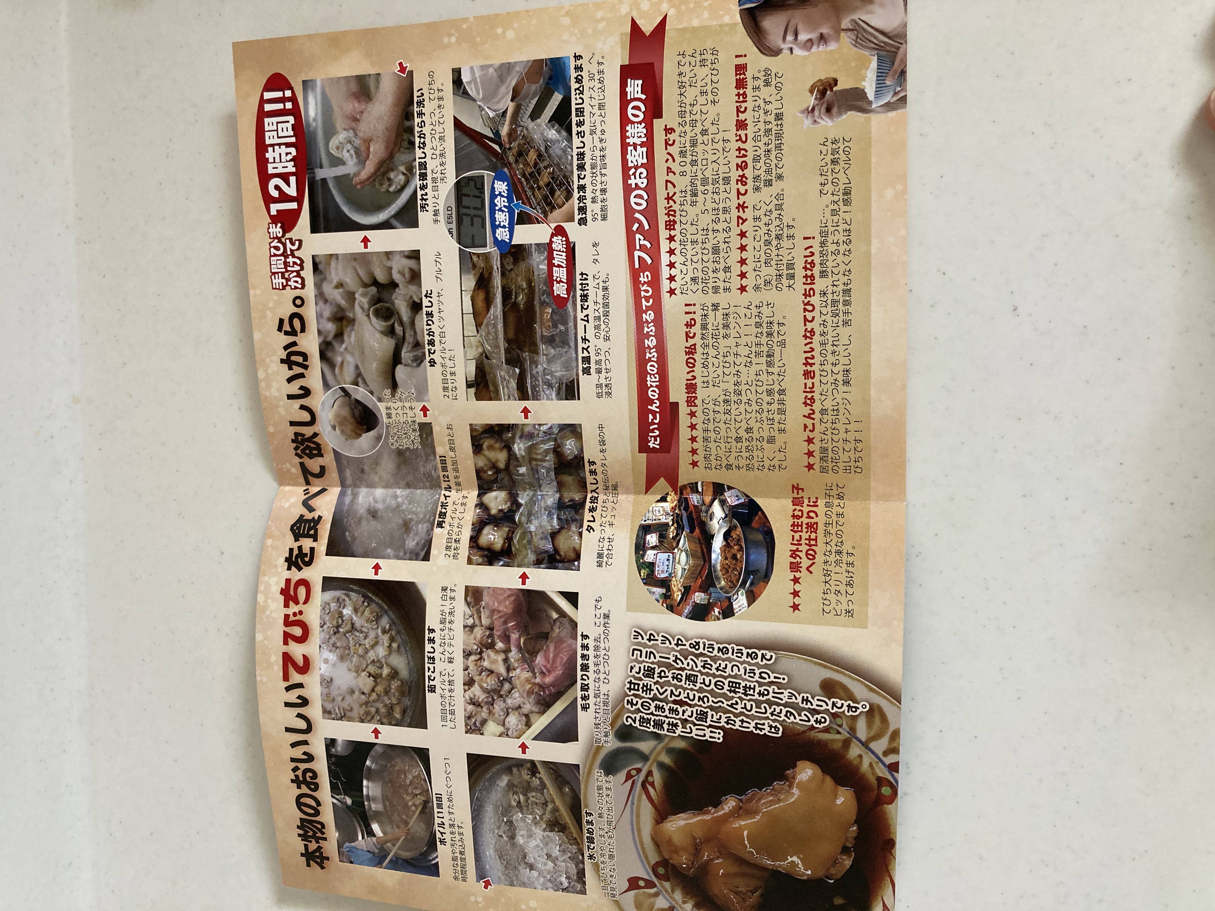 箱を開けると、てびち2個入りが4パックと、てびちや他の商品の紹介されている、シーサーが可愛い素敵なパンフレットが同封されていました。