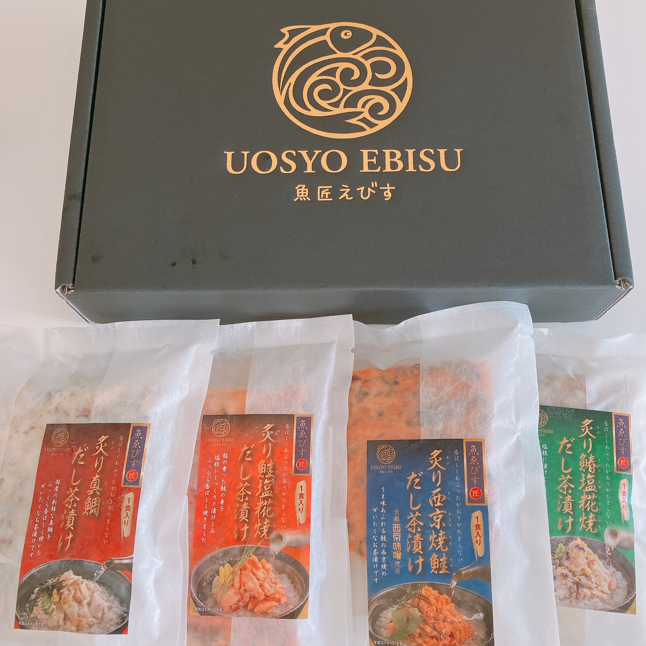 割烹料理店で提供されるような「だし茶漬け」です。国産真鯛や、72時間じっくり漬け込んだ鮭の西京焼きを、香り豊かに炙り焼きした「炙り真鯛 だし茶漬け」・「炙り西京焼鮭 だし茶漬け」、脂の乗った鮭や鰆の身を塩糀にじっくり漬け込み、ふっくら香ばしく焼き上げた「炙り鮭塩糀焼 だし茶漬け」・「炙り鰆塩糀焼 だし茶漬け」の4種セット。高級感溢れるパッケージと箱でギフト仕様の商品なので、贈り物にもおすすめです。