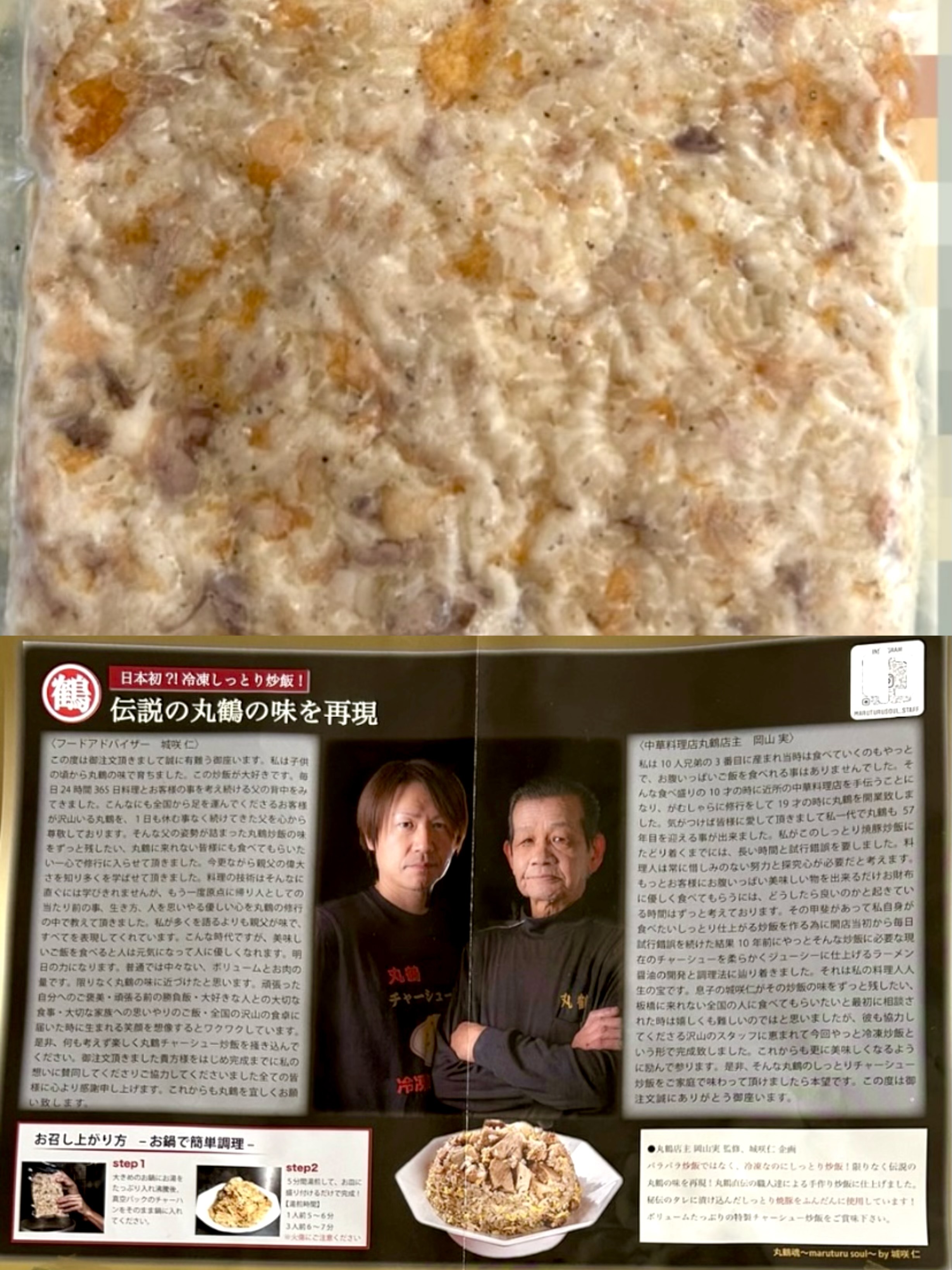 1967年創業の町中華「丸鶴」の看板メニュー、数量限定「しっとりチャーシュー炒飯」です。店主岡山実監修・息子の城咲仁氏企画の商品。パラパラではなく、冷凍なのにしっとり食感で、黒コショウがアクセントになっています。秘伝のタレに漬け込んだ、しっとり焼豚をふんだんに使用。店舗と同じ450g入りでボリューム満点です。職人が鍋を振り手作りで調理し、限りなく伝説の味を再現しています。冷凍で届くので、温めるだけで行列店の味が自宅で楽しめます。