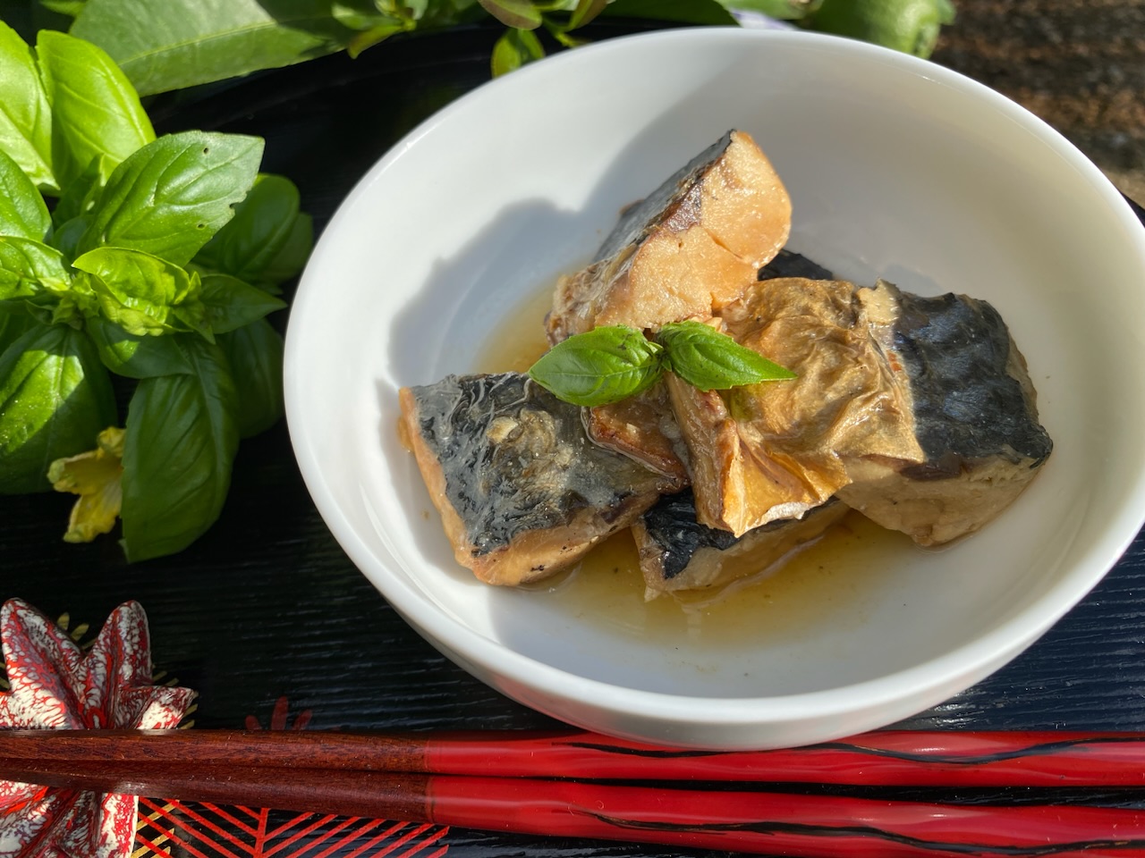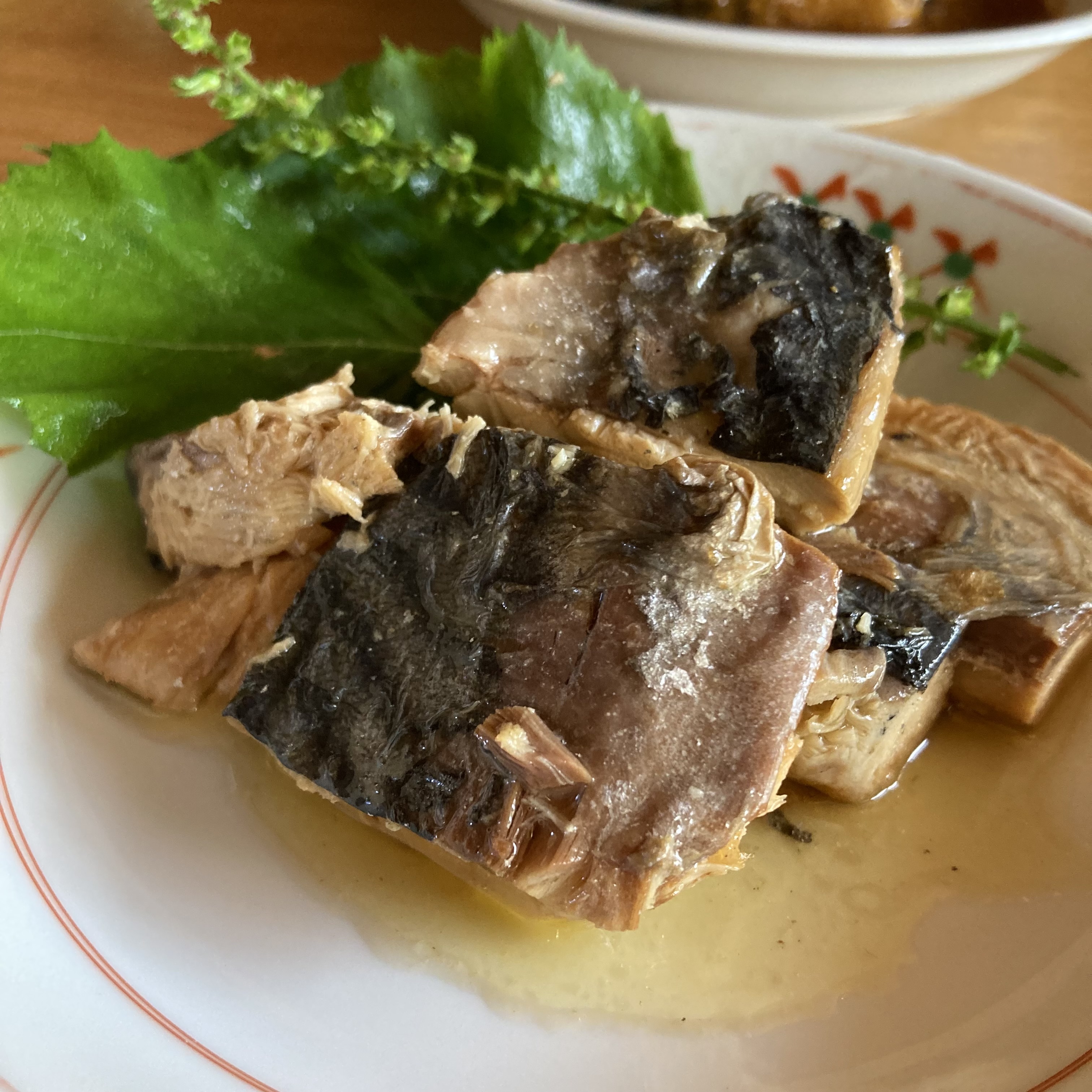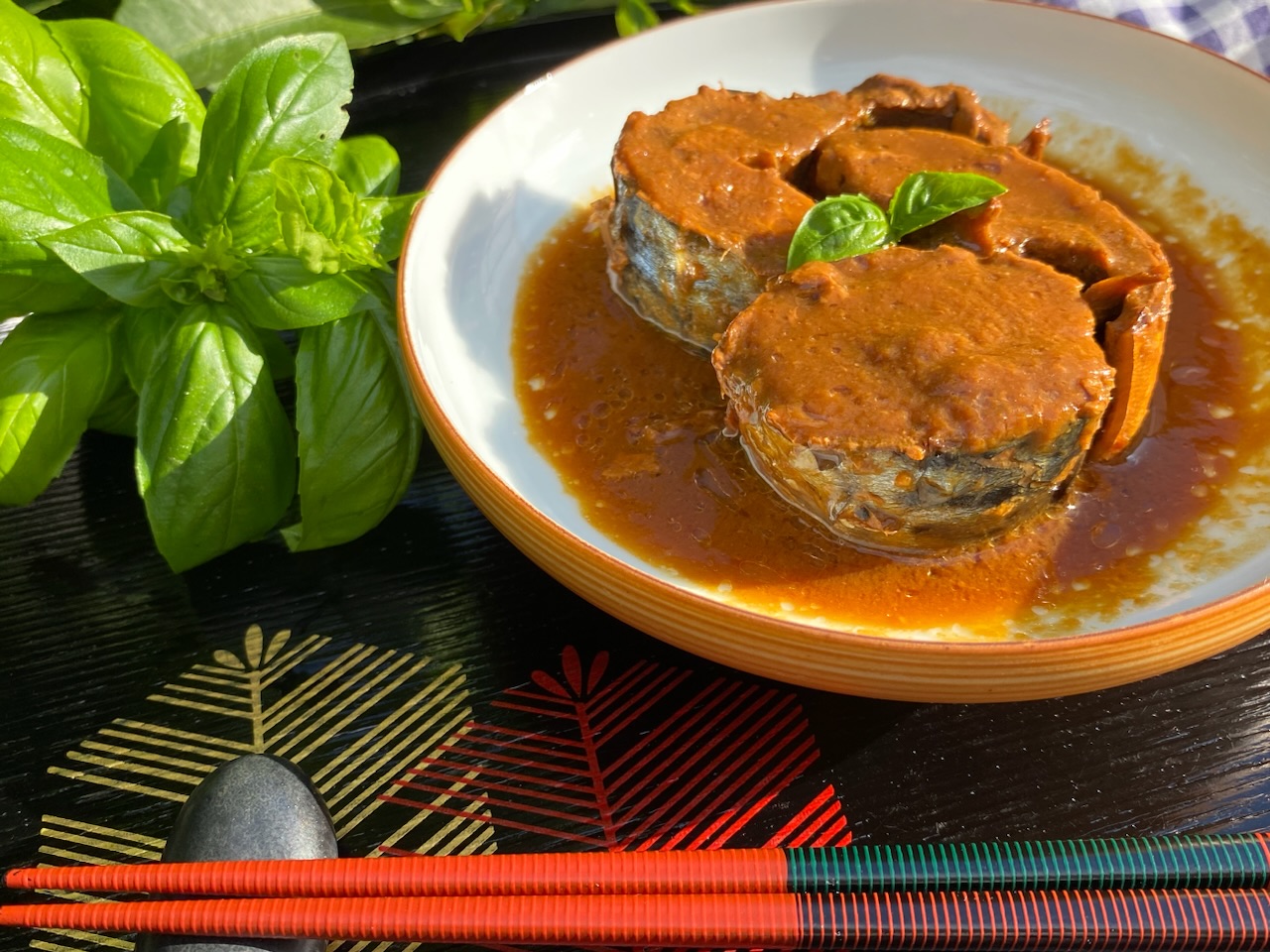 皿に開けると煮汁もたっぷり。砂糖を使わずちくま味噌製造の東京の伝統調味料「江戸甘味噌」に現存する最古の味醂蔵が作る「九重櫻」、高知県産の生姜だけでほんのり甘く仕上げたというさば味噌煮。