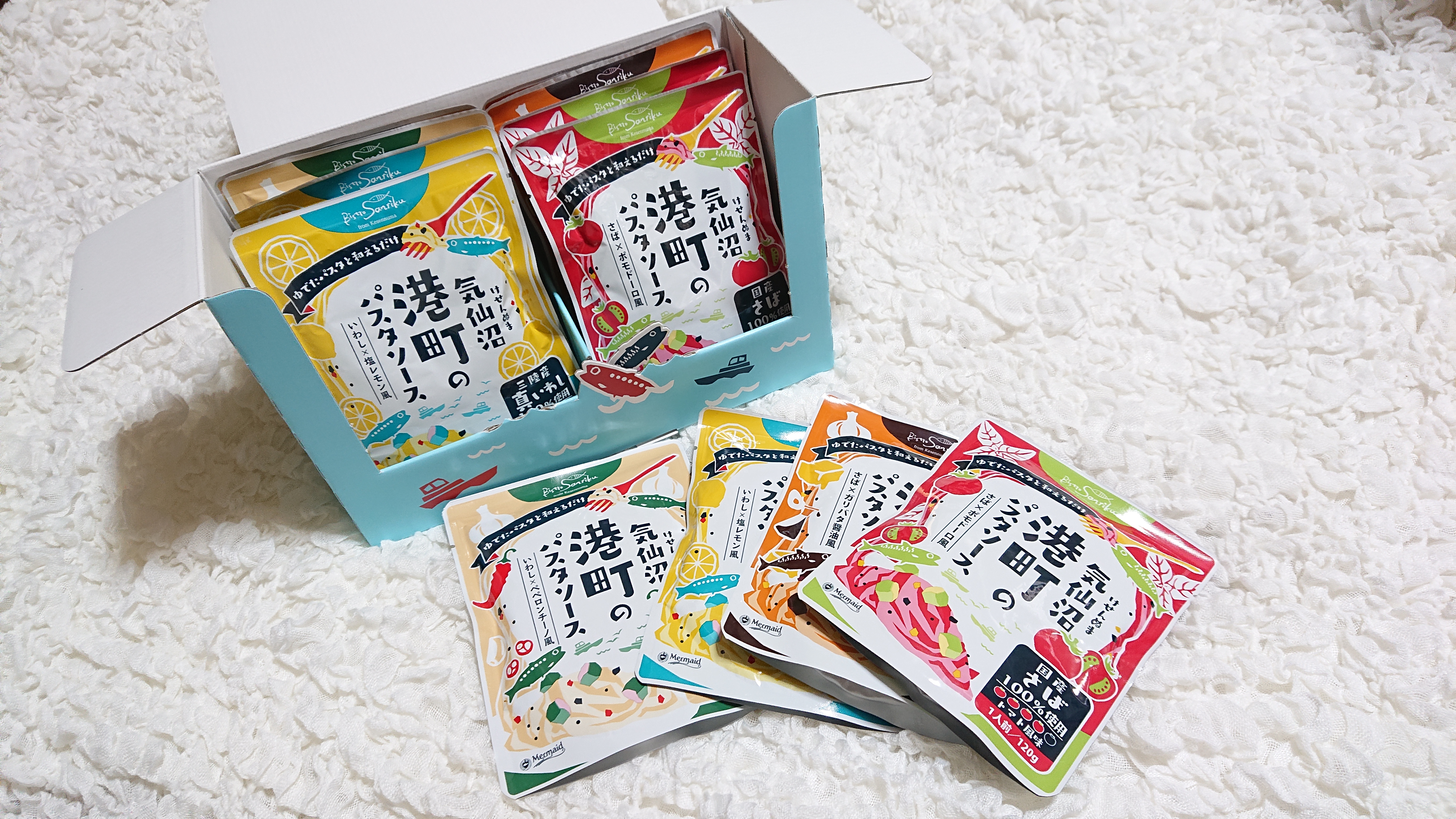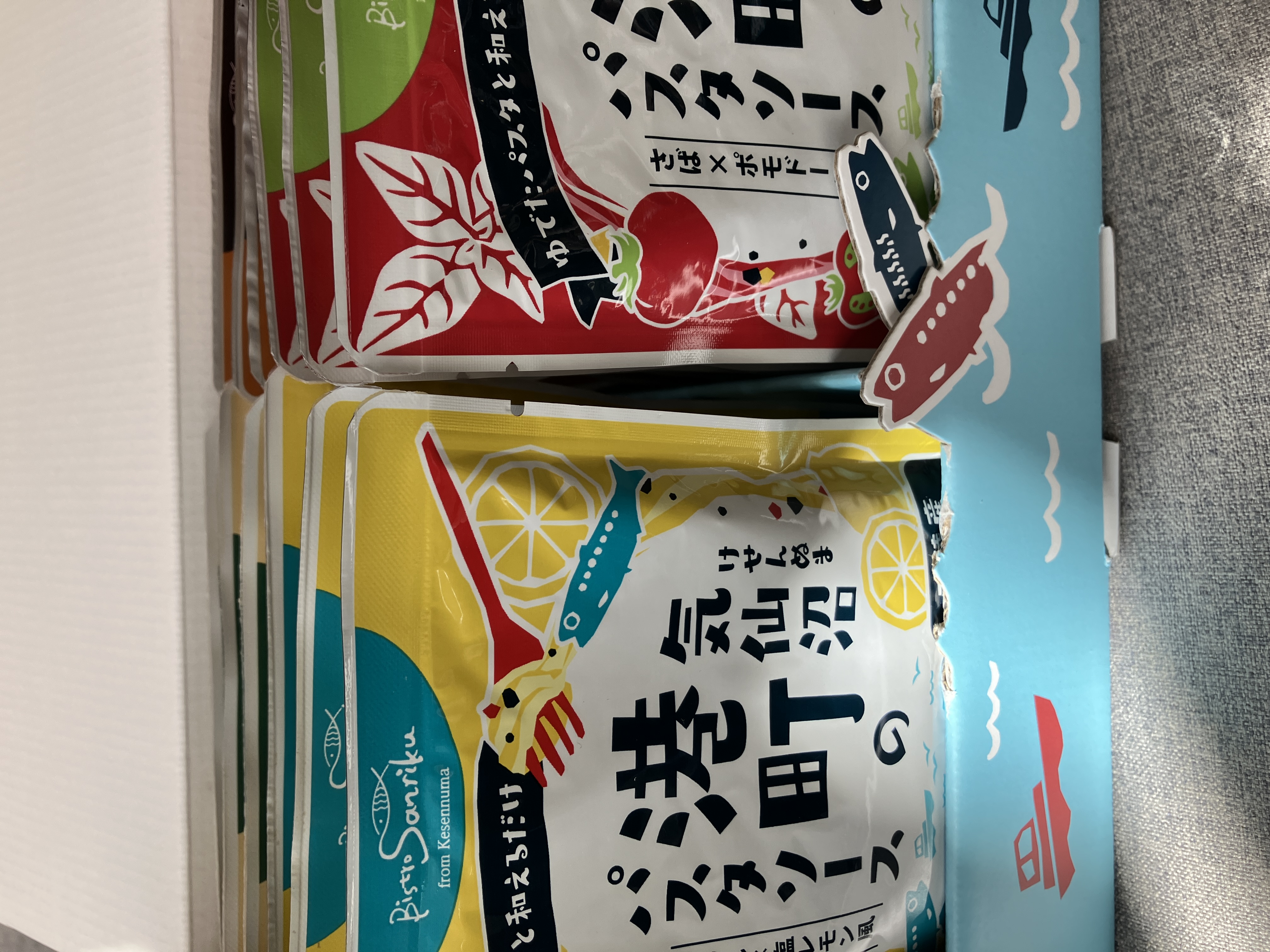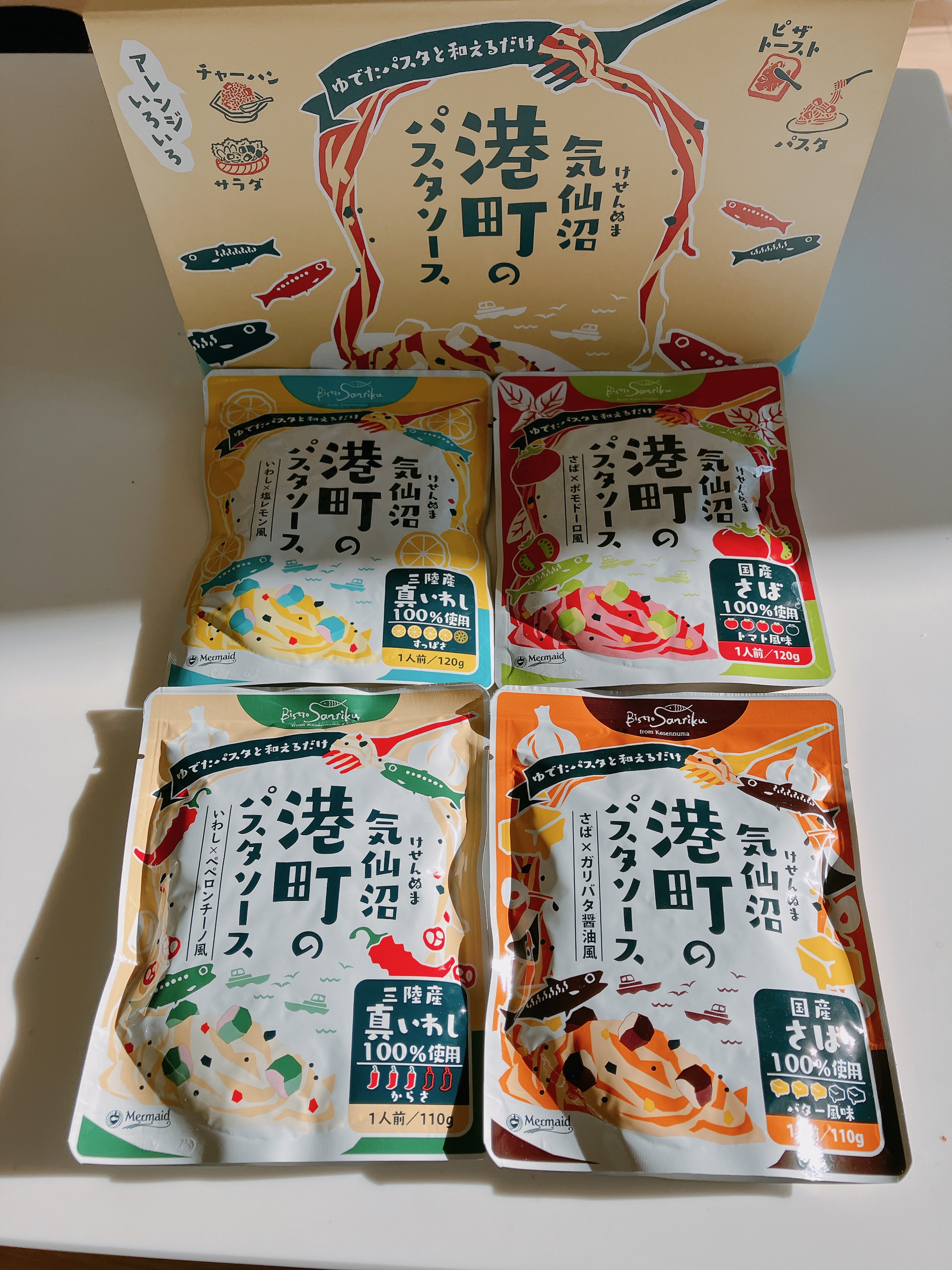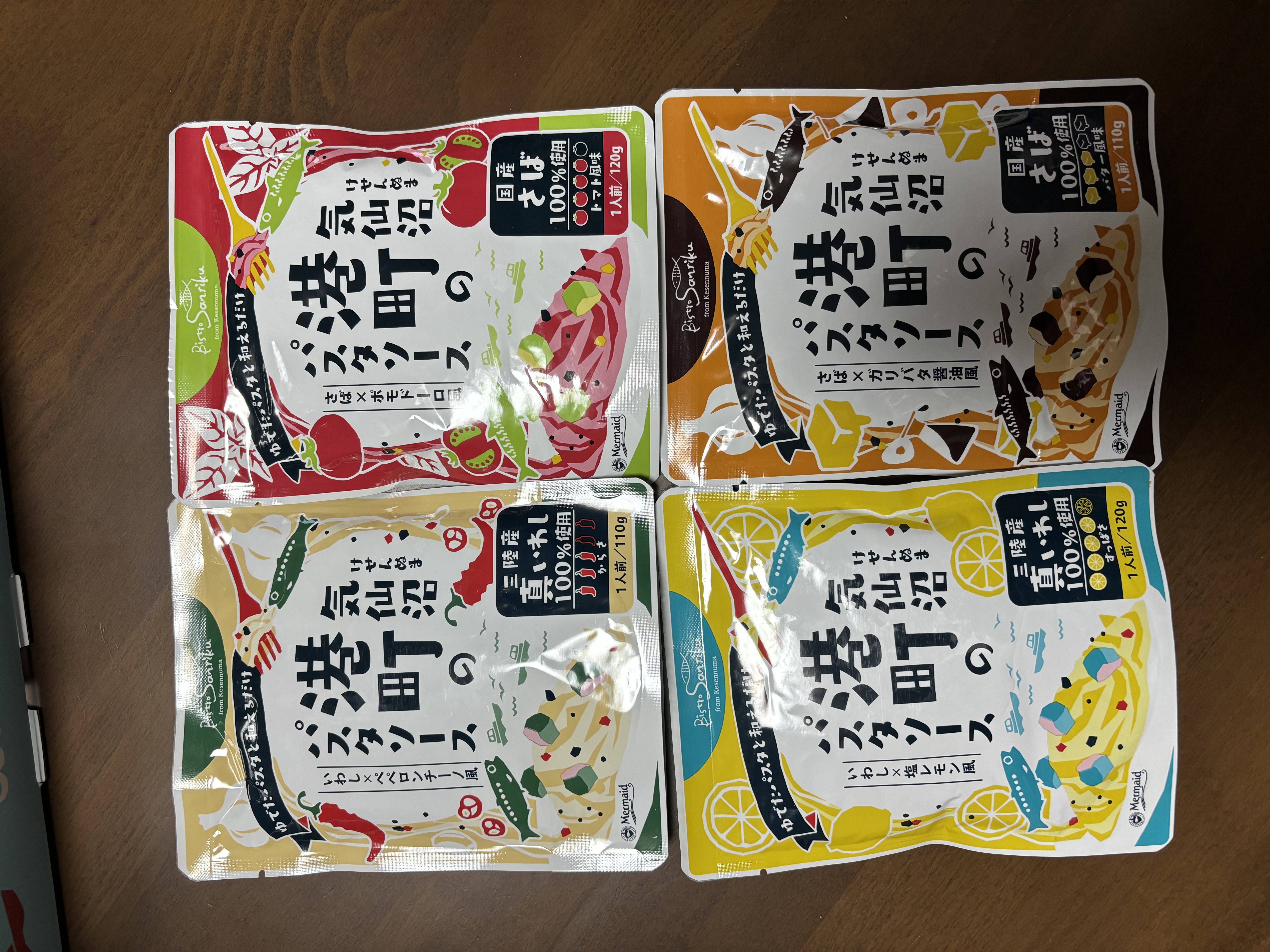 気仙沼産の青魚を使用した「パスタソース」です。 原料にこだわり、国産青魚(いわし・さば)を100%使用しています。パスタソースをパスタに和えるだけで手軽に楽しめます。国産さばがごろっと入った、バジルとトマトソース仕立て「さば×ポモドーロ風」、三陸の真いわし入りで、レモンの酸味が爽やかなオイル仕立て「いわし×塩レモン風」など4種。開封後の時間経過に伴う栄養の劣化を防ぐため 1人前の食べきりサイズになっています。見た目はかわいい!けれど中身は本格派。異なる味わいのセットなので食べ比べできます。