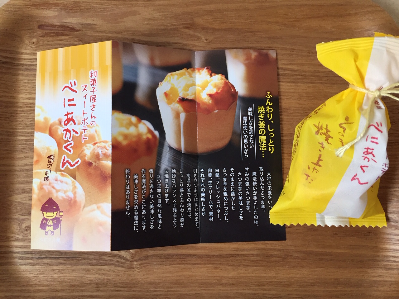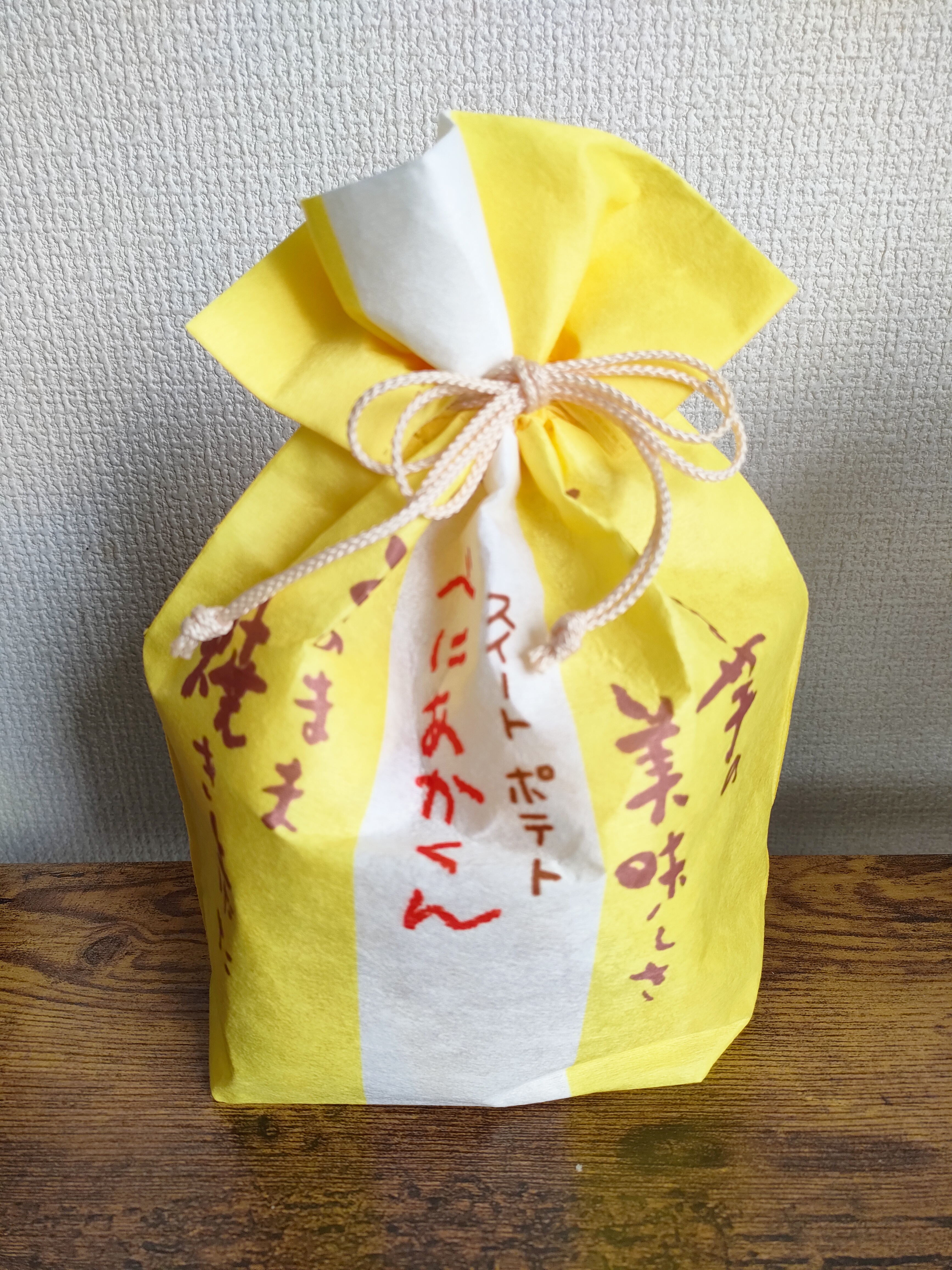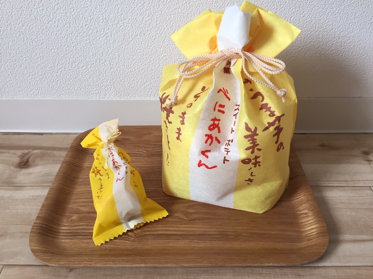 和菓子屋ならではの「スィートポテト」です。香料を使わない素朴なさつま芋と味わいと、フレッシュバターの芳ばしい香りが魅力。しっとり、ふわっとした食感です。厳選した北海道の新鮮なフレッシュバターと生クリームを贅沢に使い、白餡を合わせたことで、さっぱりとした軽い食感に仕上がっています。さつま芋の素朴でホクホクとした口あたりの良い味わいを生かしたスイーツです。べにあかくんのイラスト入りの巾着に入って届くので、プチギフトにもおすすめです。