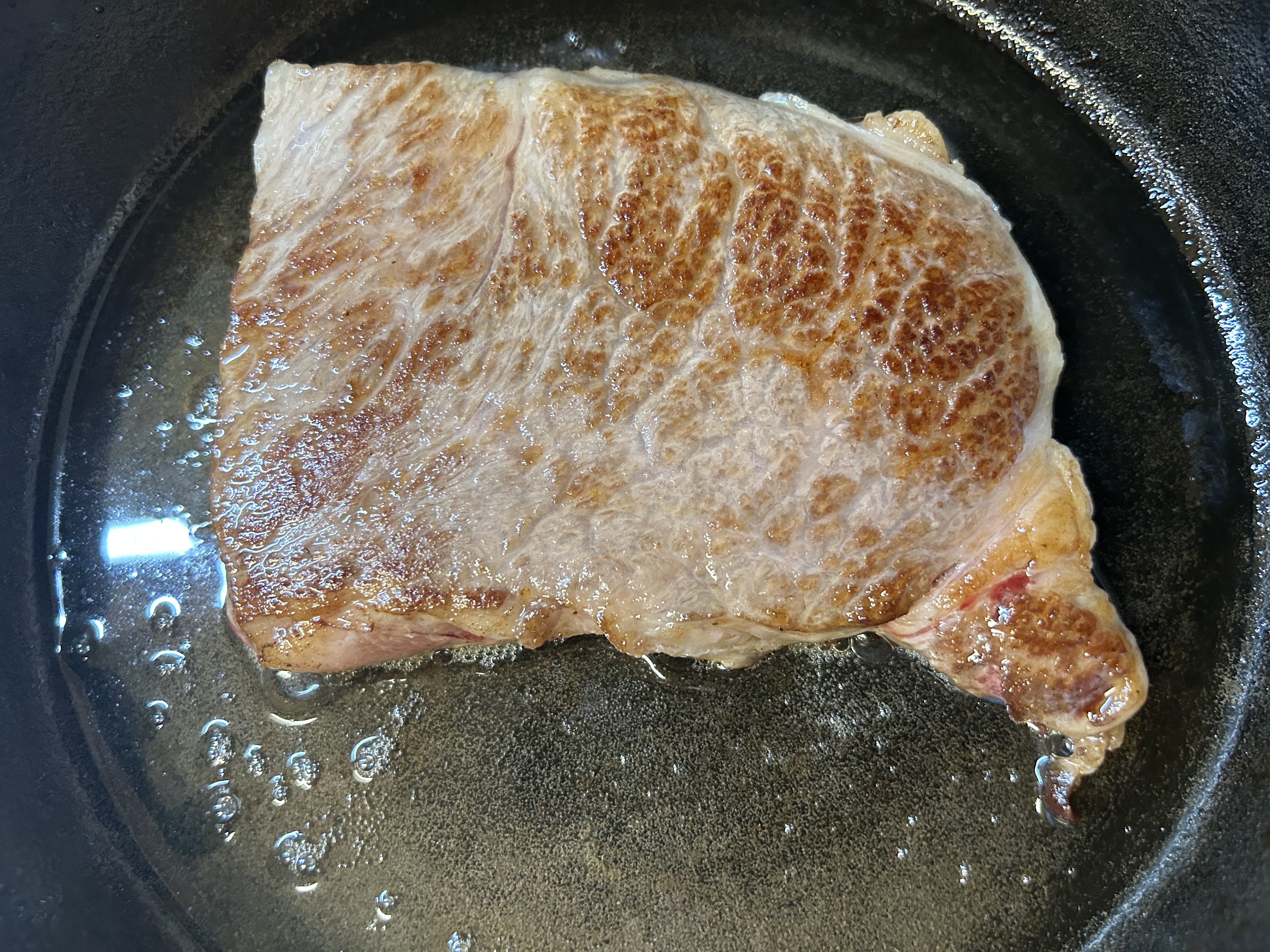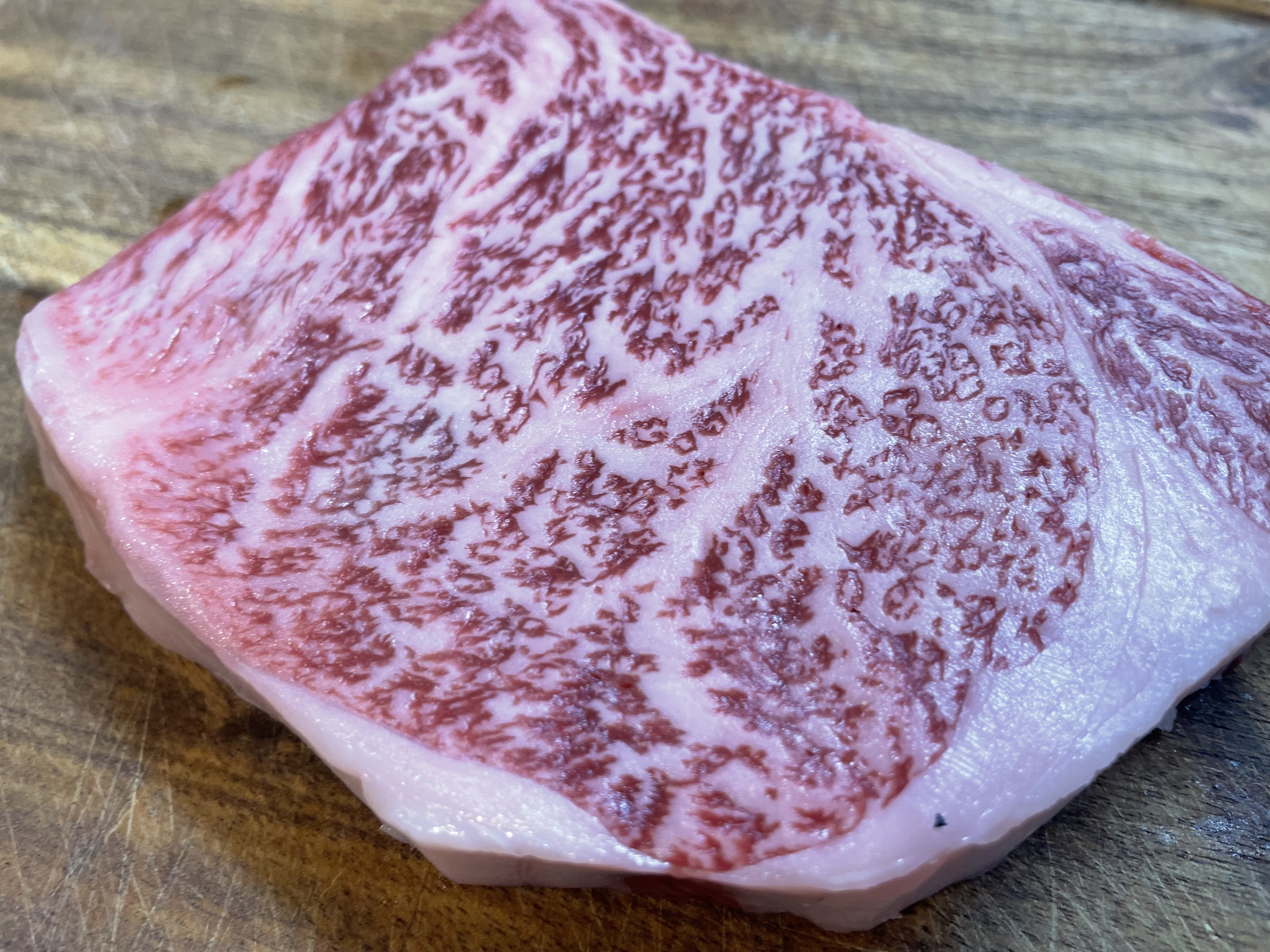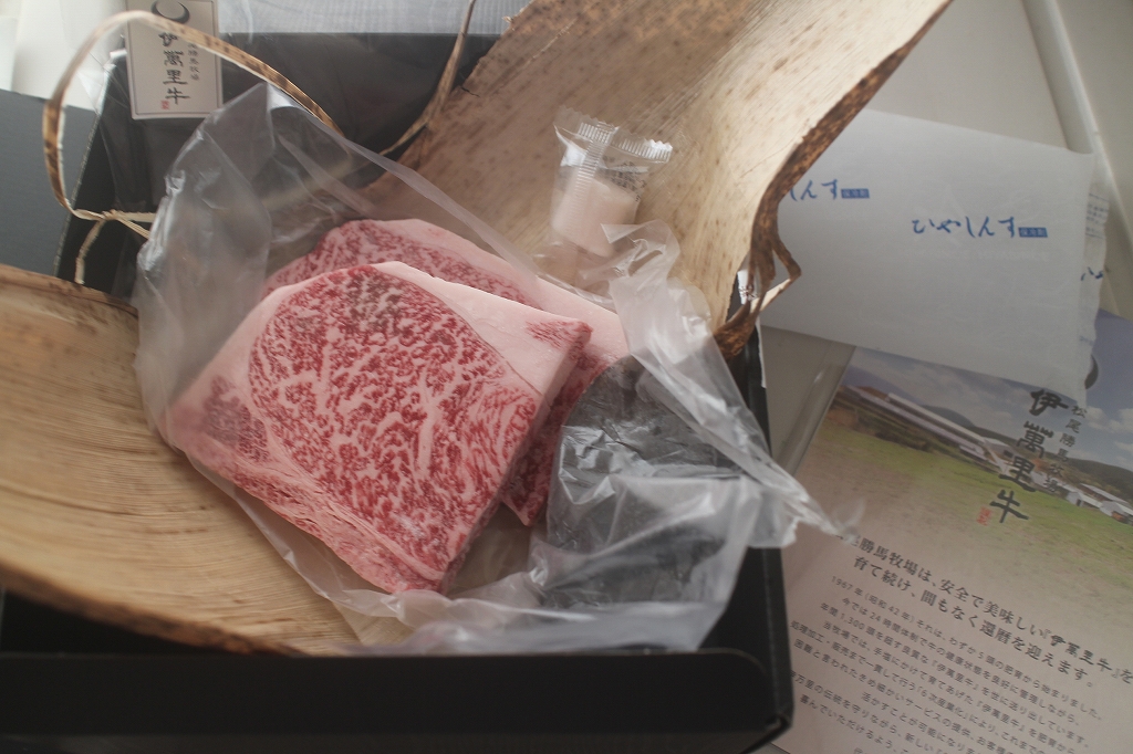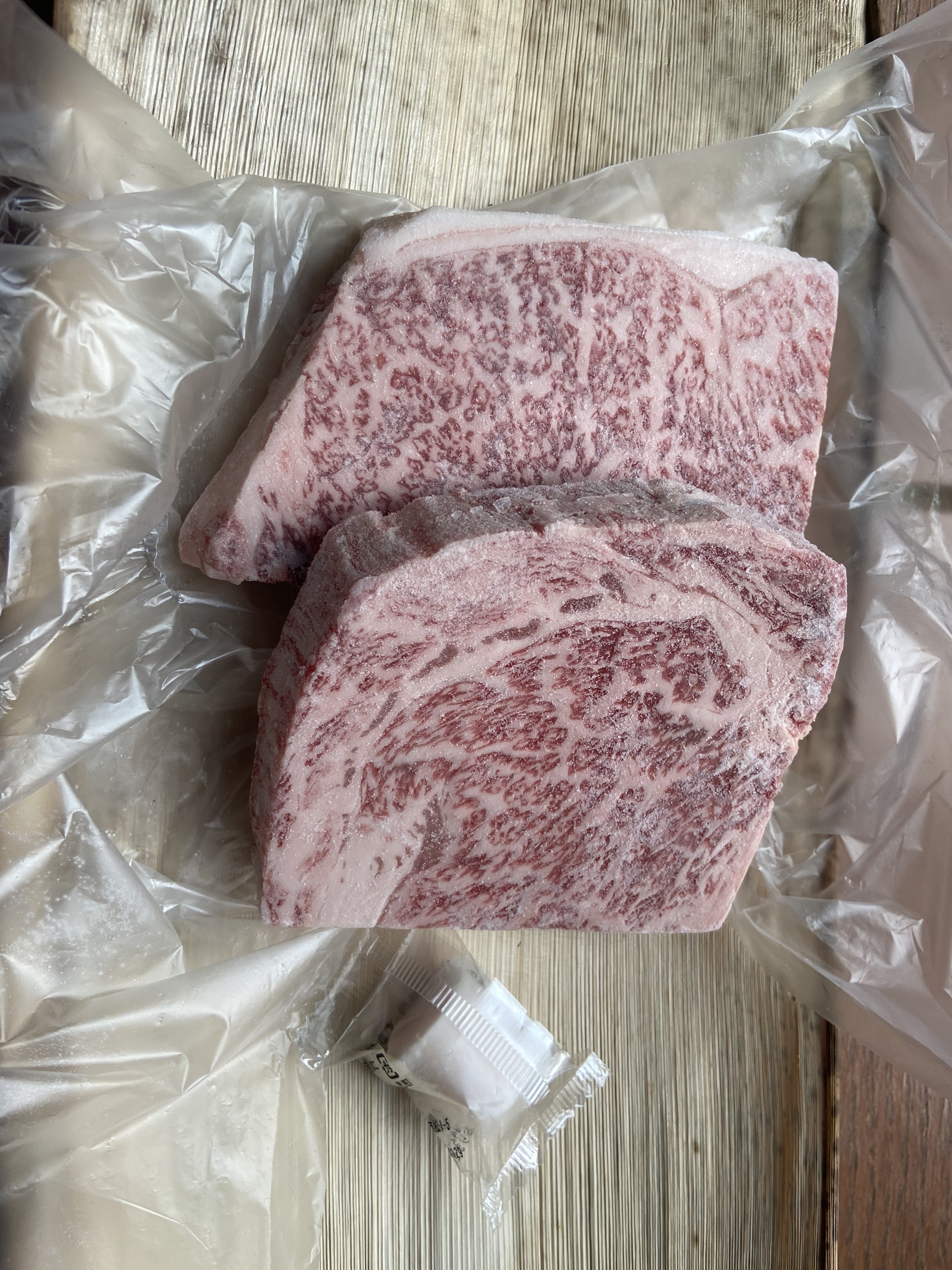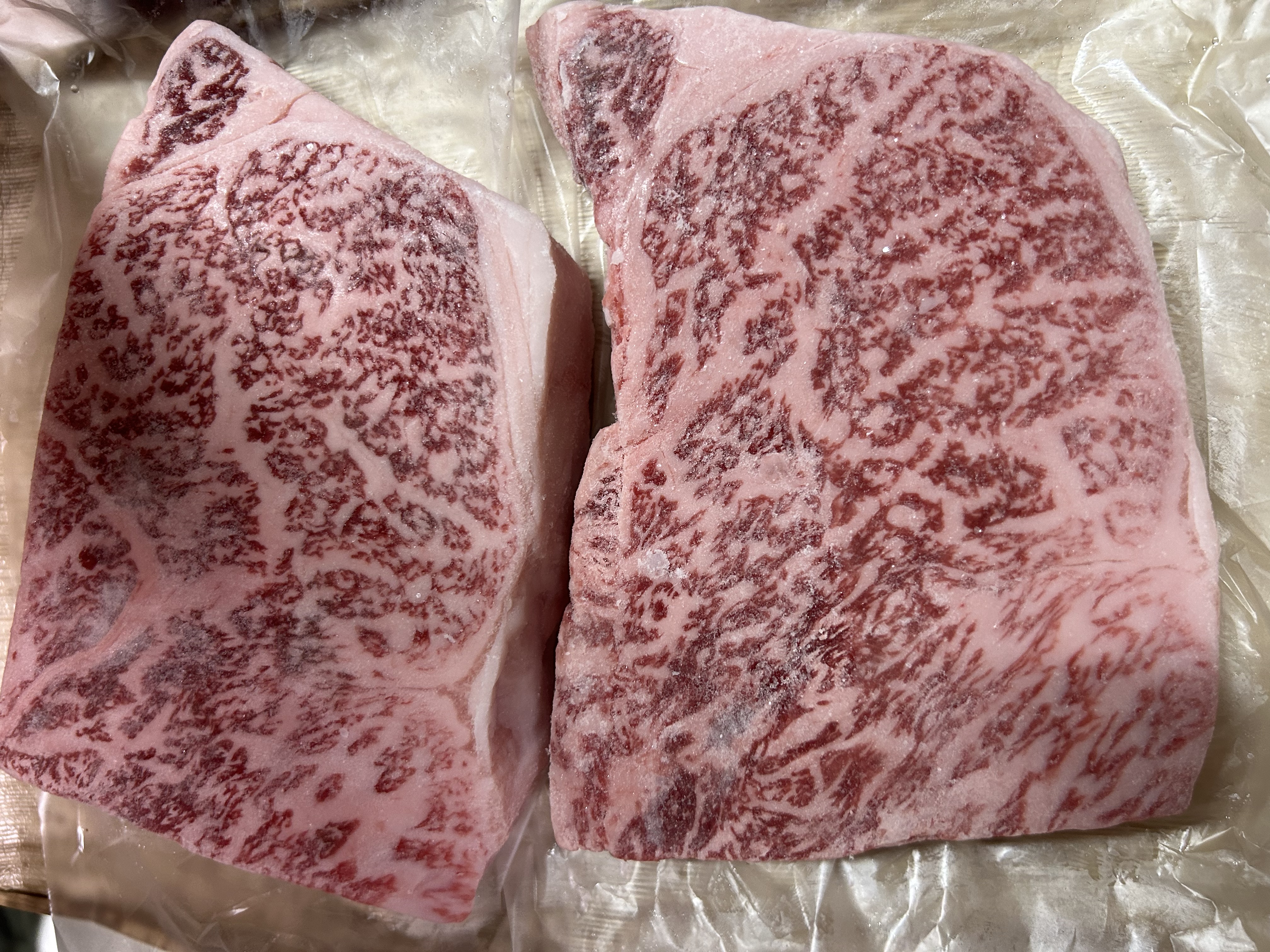 まず、パッケージですが黒色の高級感のある箱に梱包されています。お肉と、脂、詳しく書かれた商品説明書が入っています。今回、180グラムを2枚いただいたのですが、しっかりとボリュームがありました。分厚く、テンションが高鳴ります。凍っている状態でもわかるのが、脂肪と赤みのバランスの良さです。
