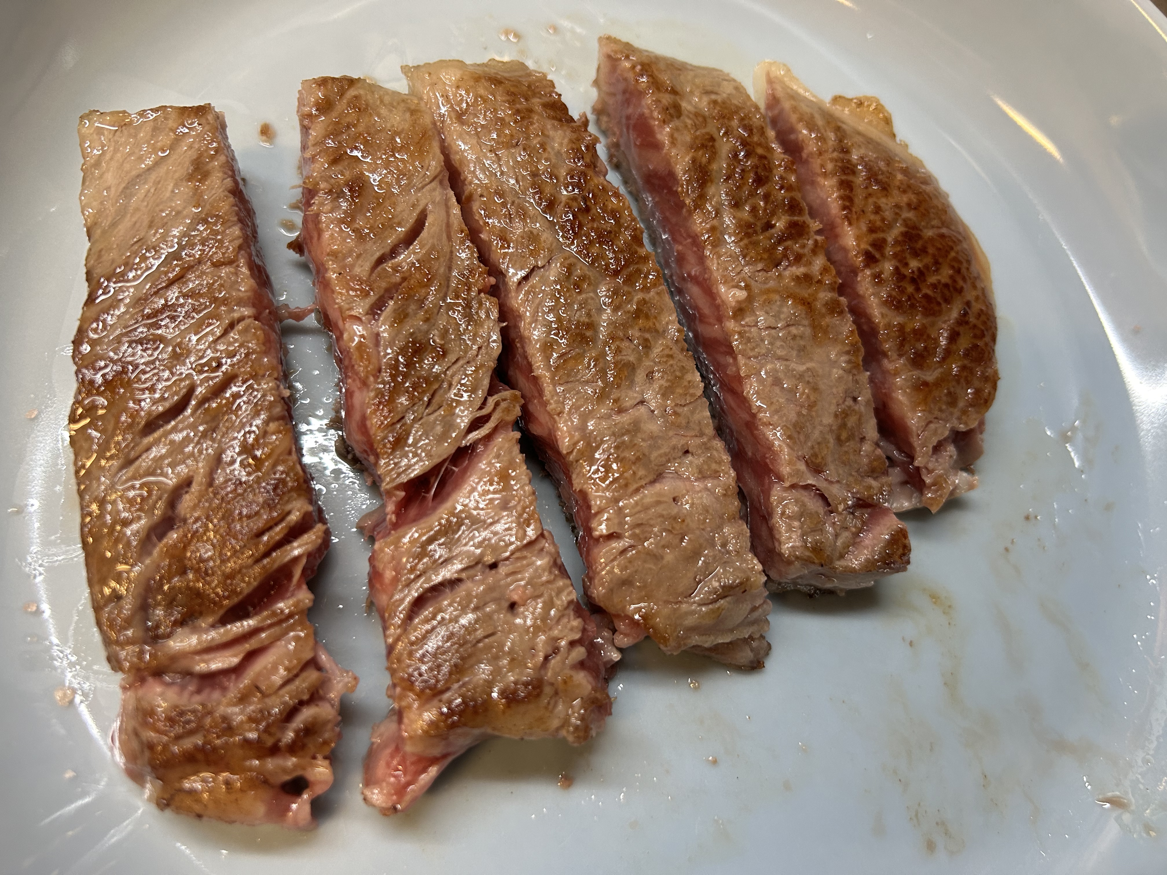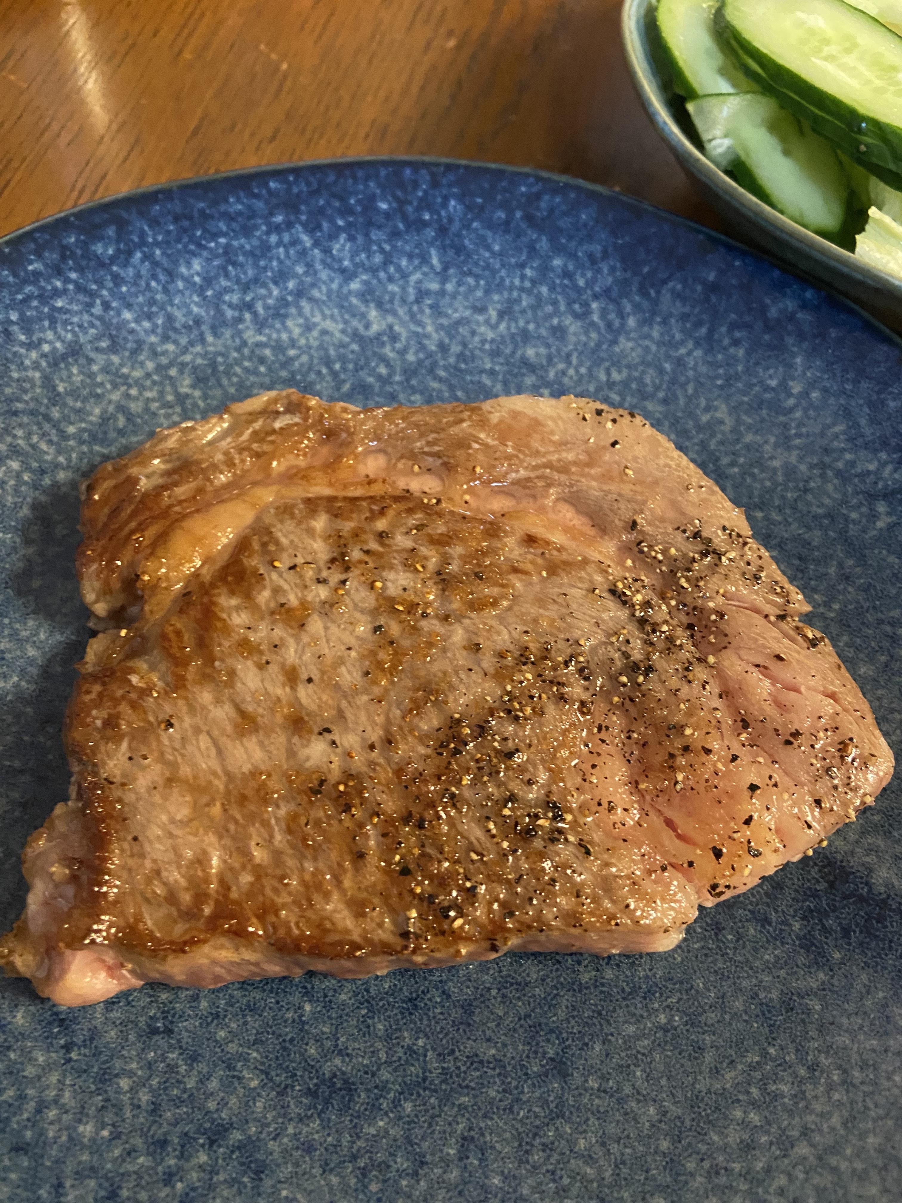分かりやすい説明書の通りに少しだけ焼いていただきます。シンプルに良いお塩と、お醤油を添えて、もちろんレアで。