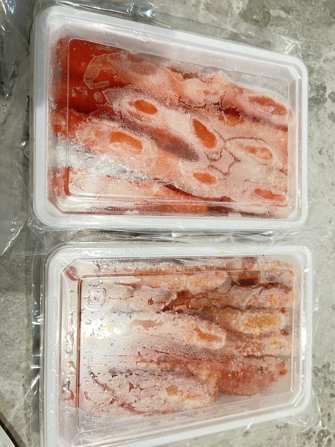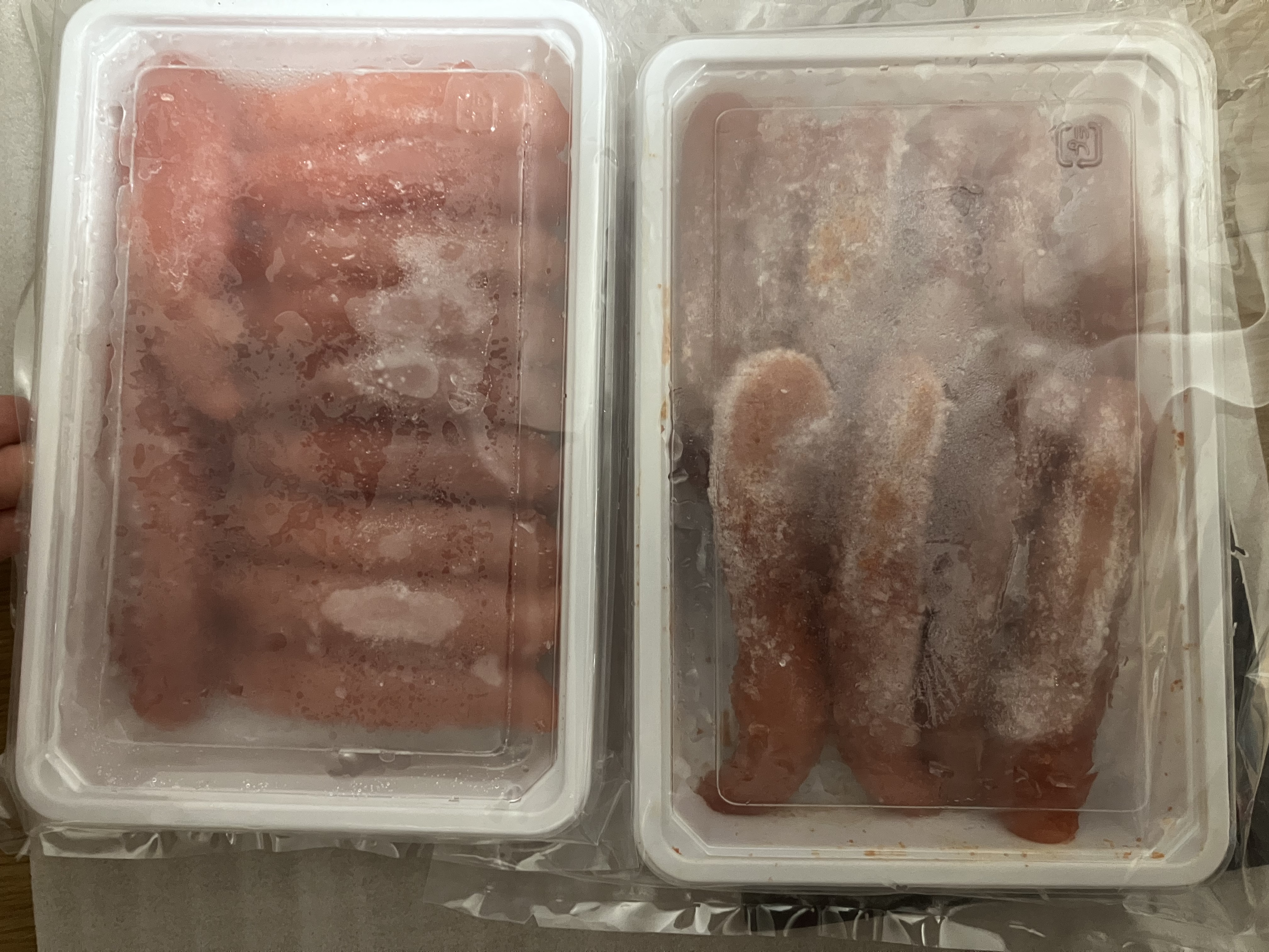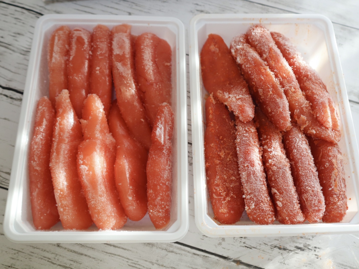 ○解凍後も大きなサイズのまま、艶々としてハリのある塩たらこと明太子。